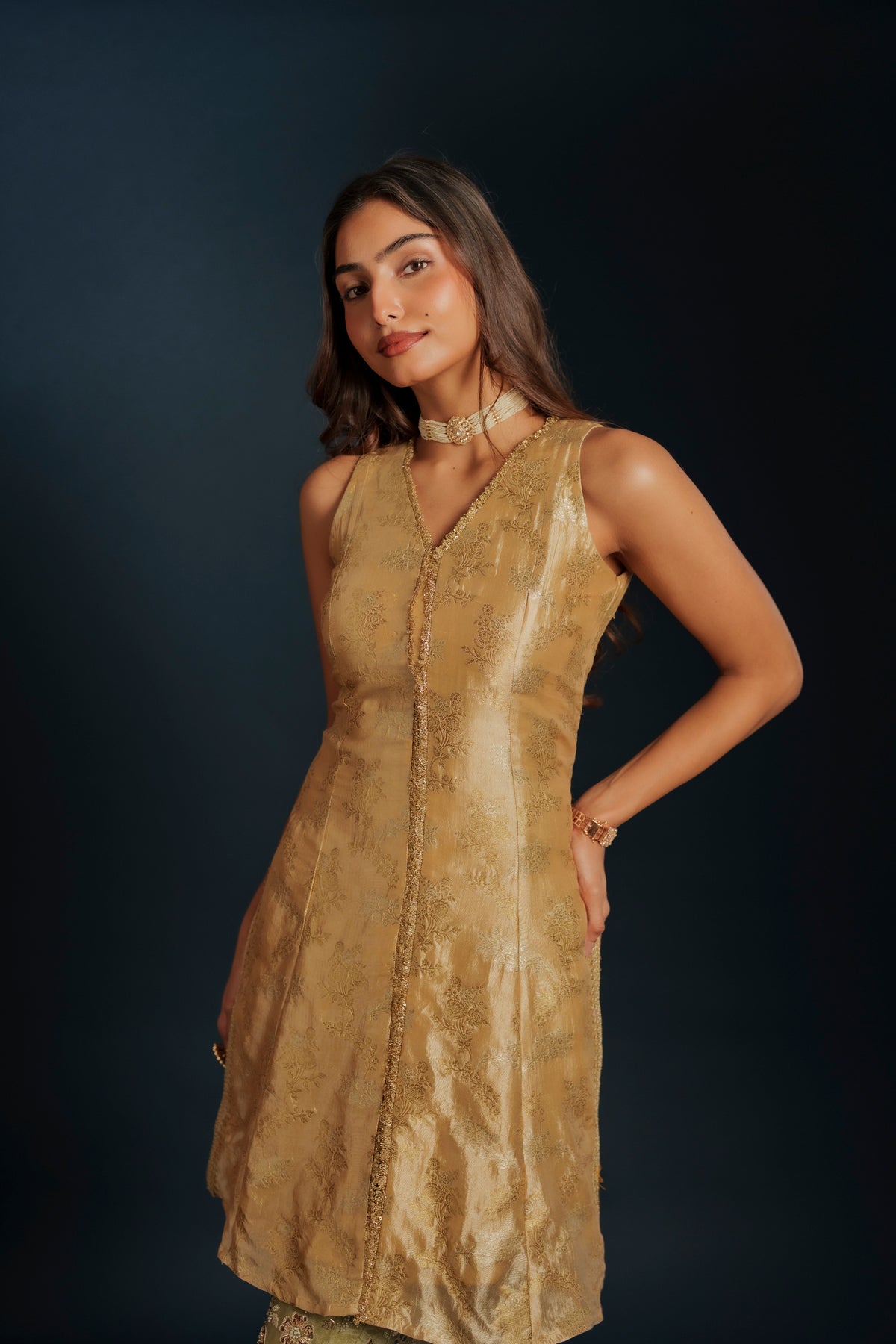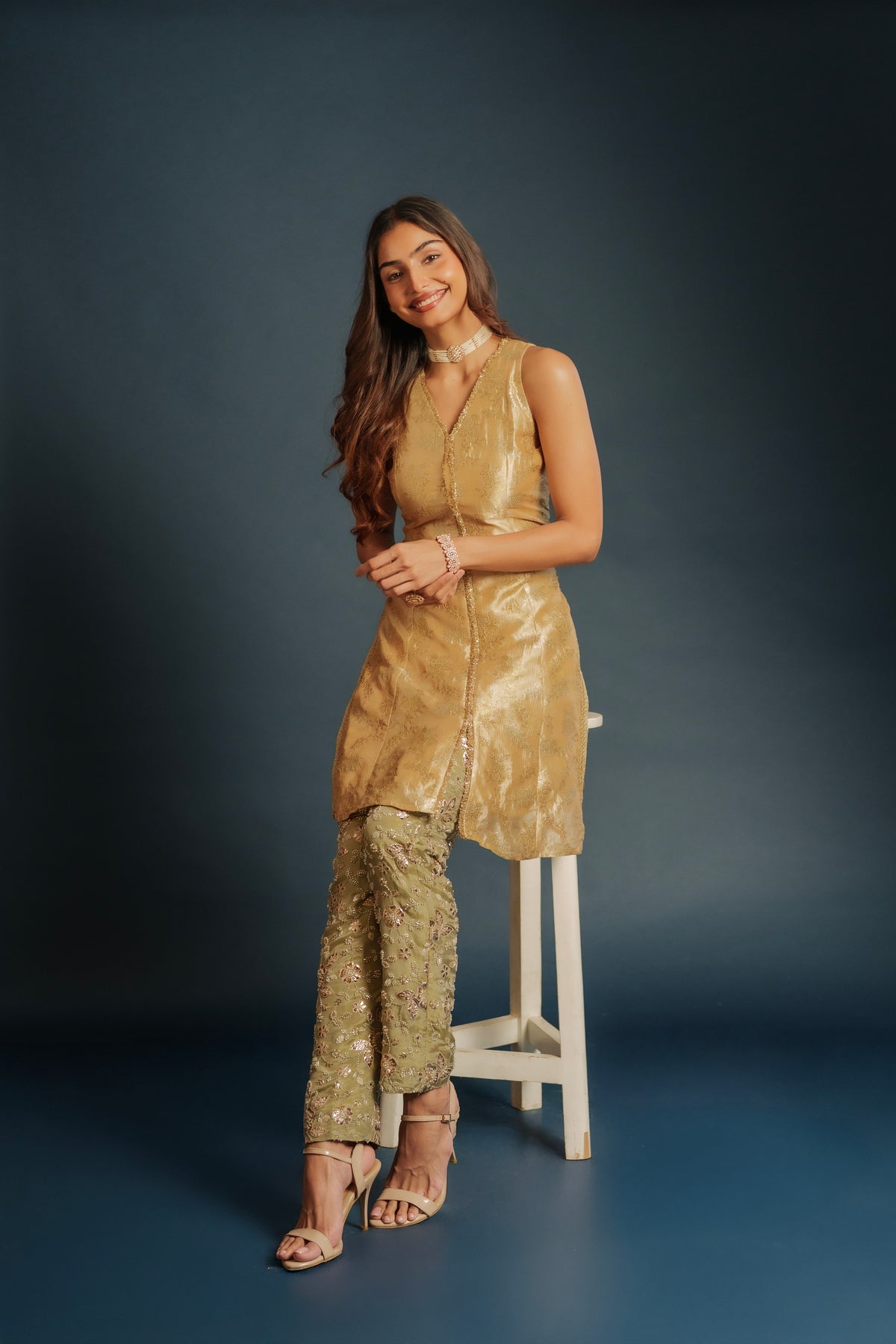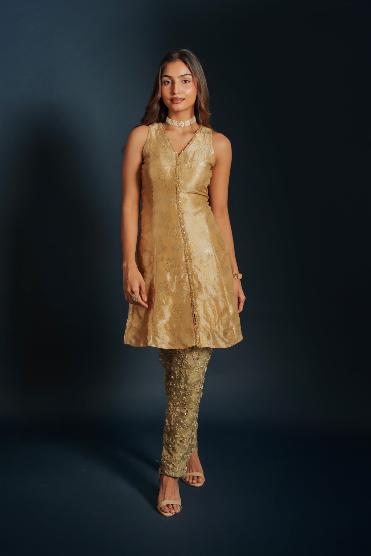Tina set is a contemporary halter-cut top made out of brocade paired with elegant georgette embroidered pants, blending modern silhouettes with rich traditional textures. Designed for effortless sophistication, this ensemble is perfect for festive gatherings, cocktail events, and stylish celebrations