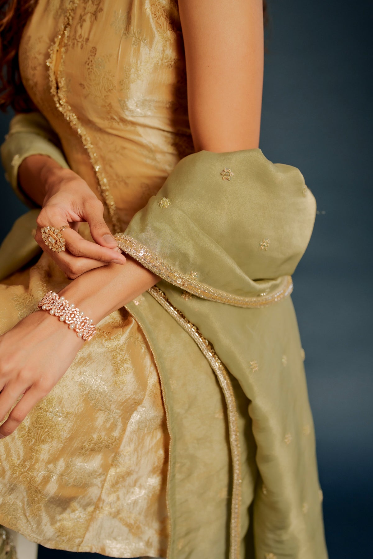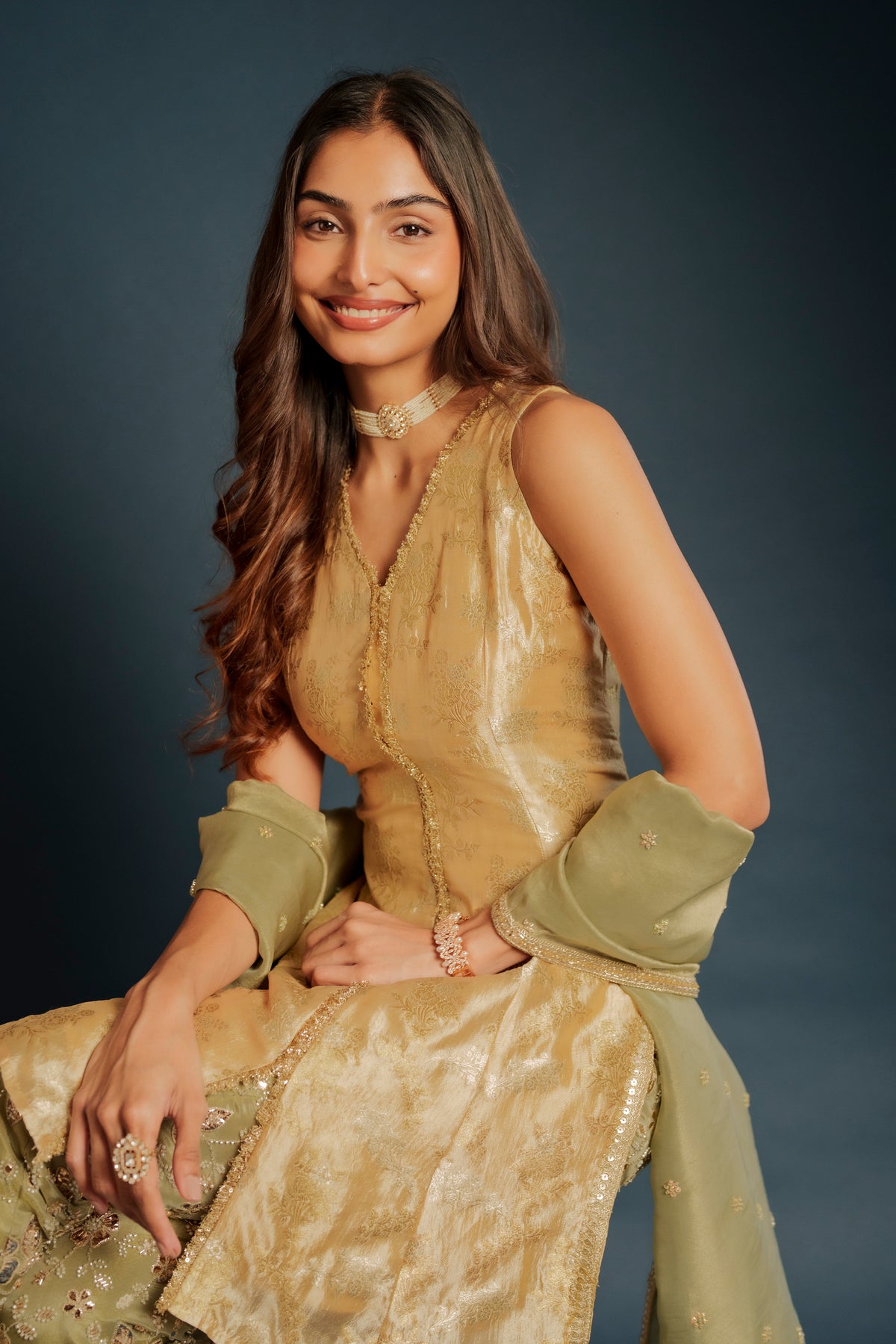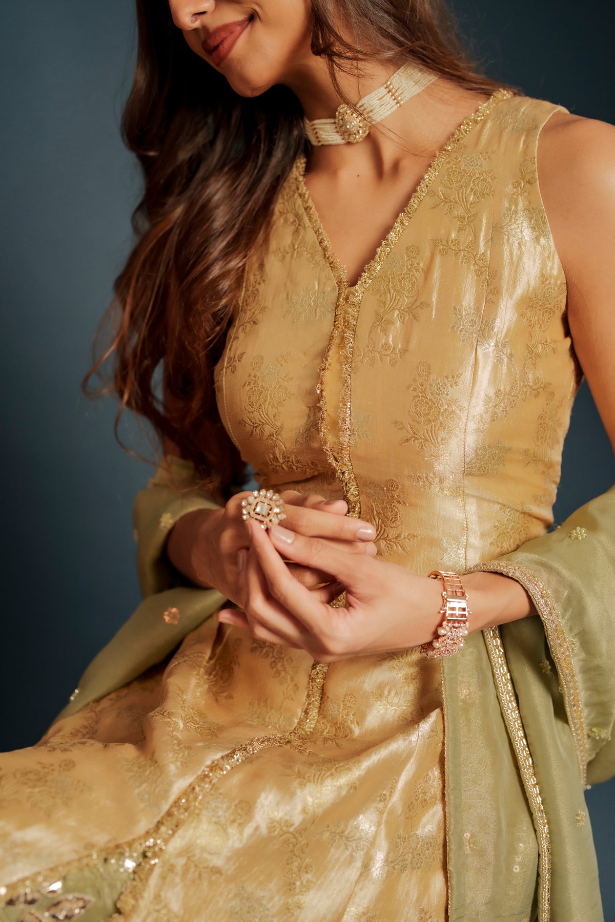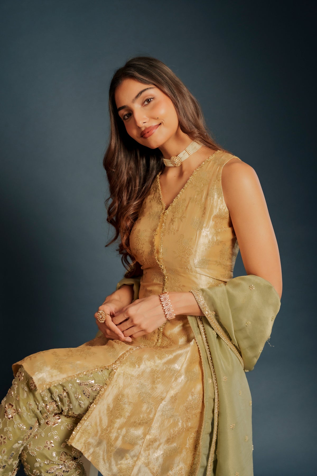 Tina set is a contemporary halter-cut top made out of brocade paired with elegant georgette embroidered pants, blending modern silhouettes with rich traditional textures. Designed for effortless sophistication, this ensemble is perfect for festive gatherings, cocktail events, and stylish celebrations
