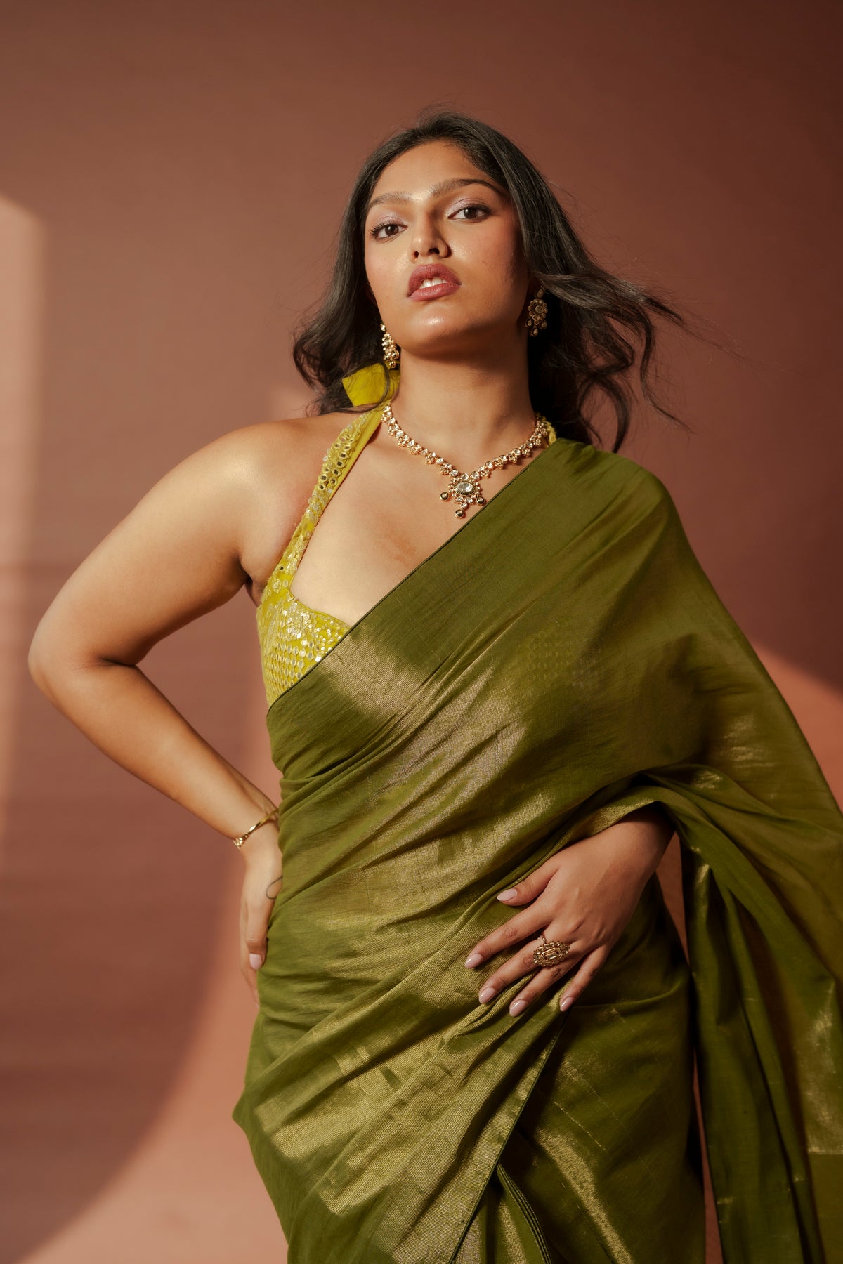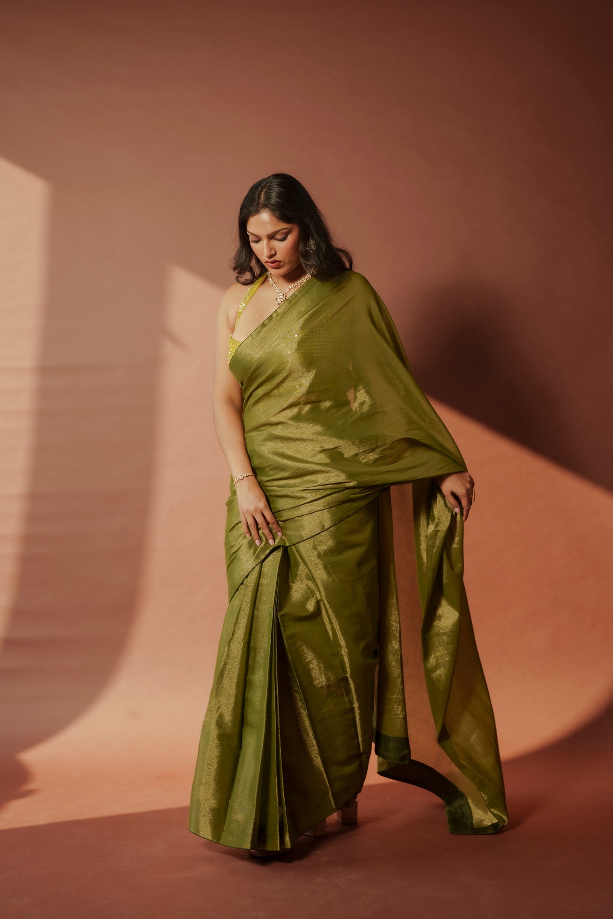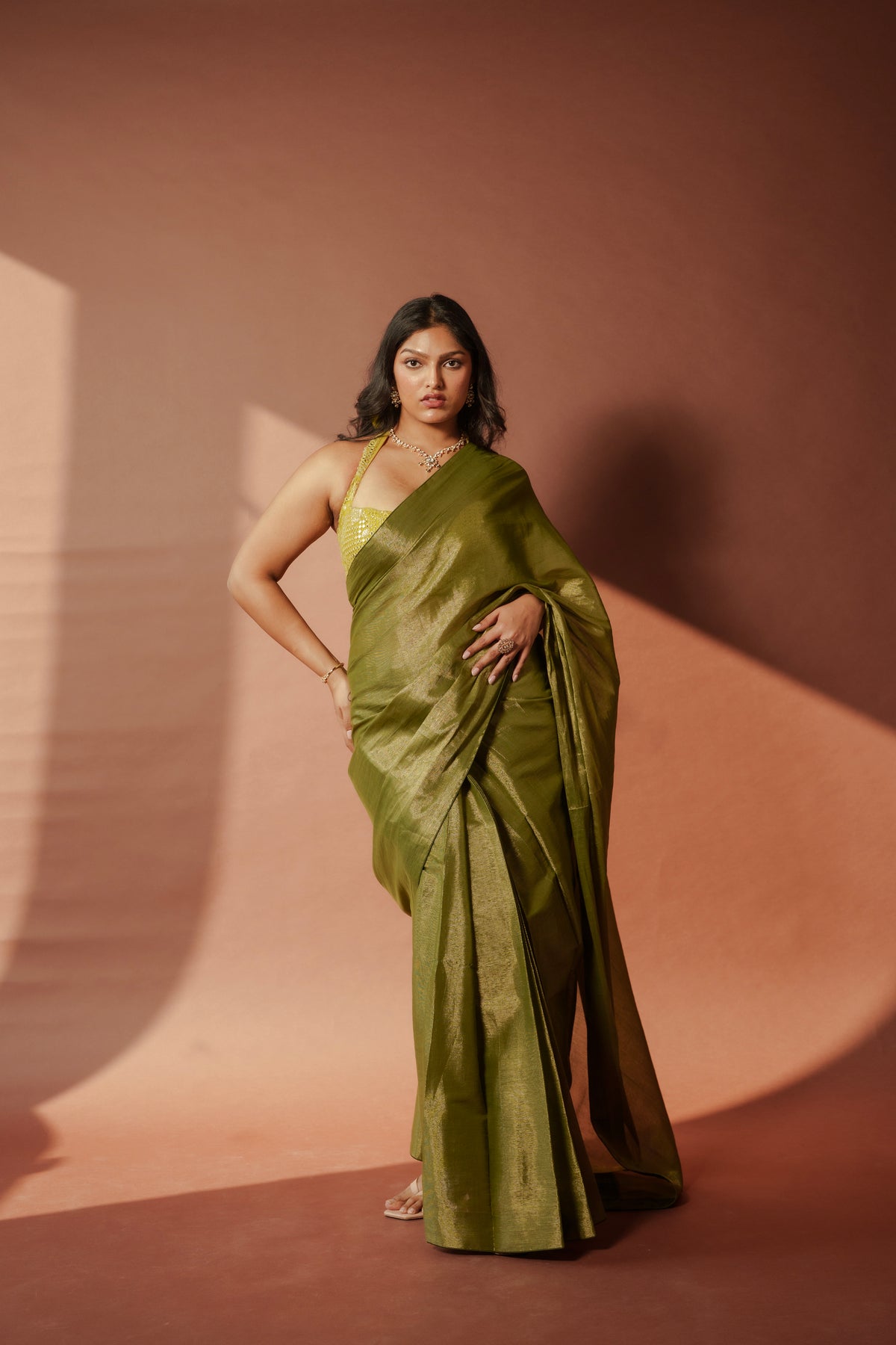 Maya olive green tissue saree featuring an open pallu and a sleeveless blouse, redefining the contemporary saree silhouette. Lightweight and effortlessly stylish, this ensemble is perfect for mehndi functions, daytime wedding events, and festive celebrations.