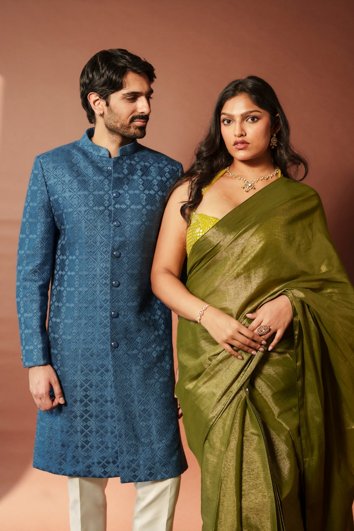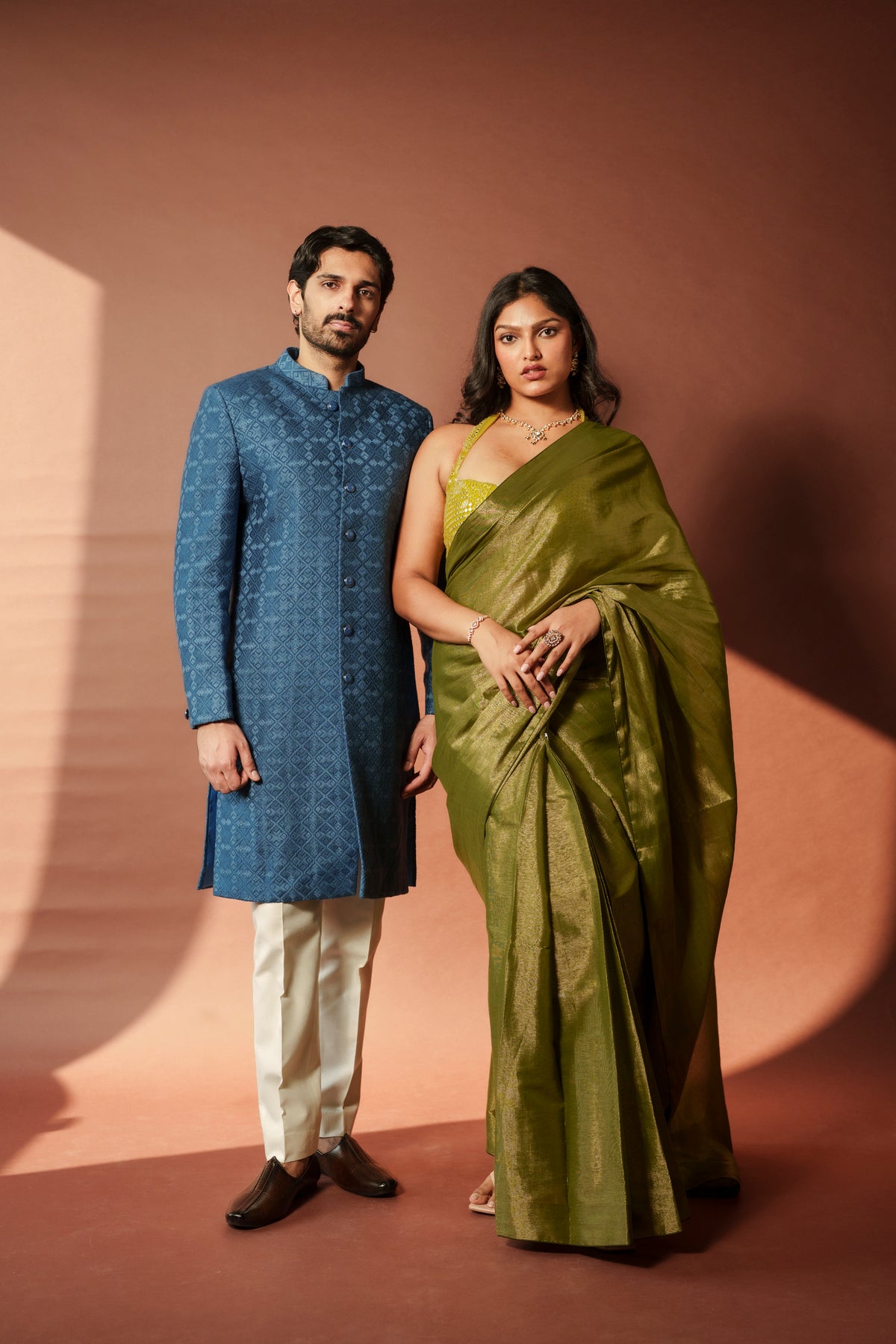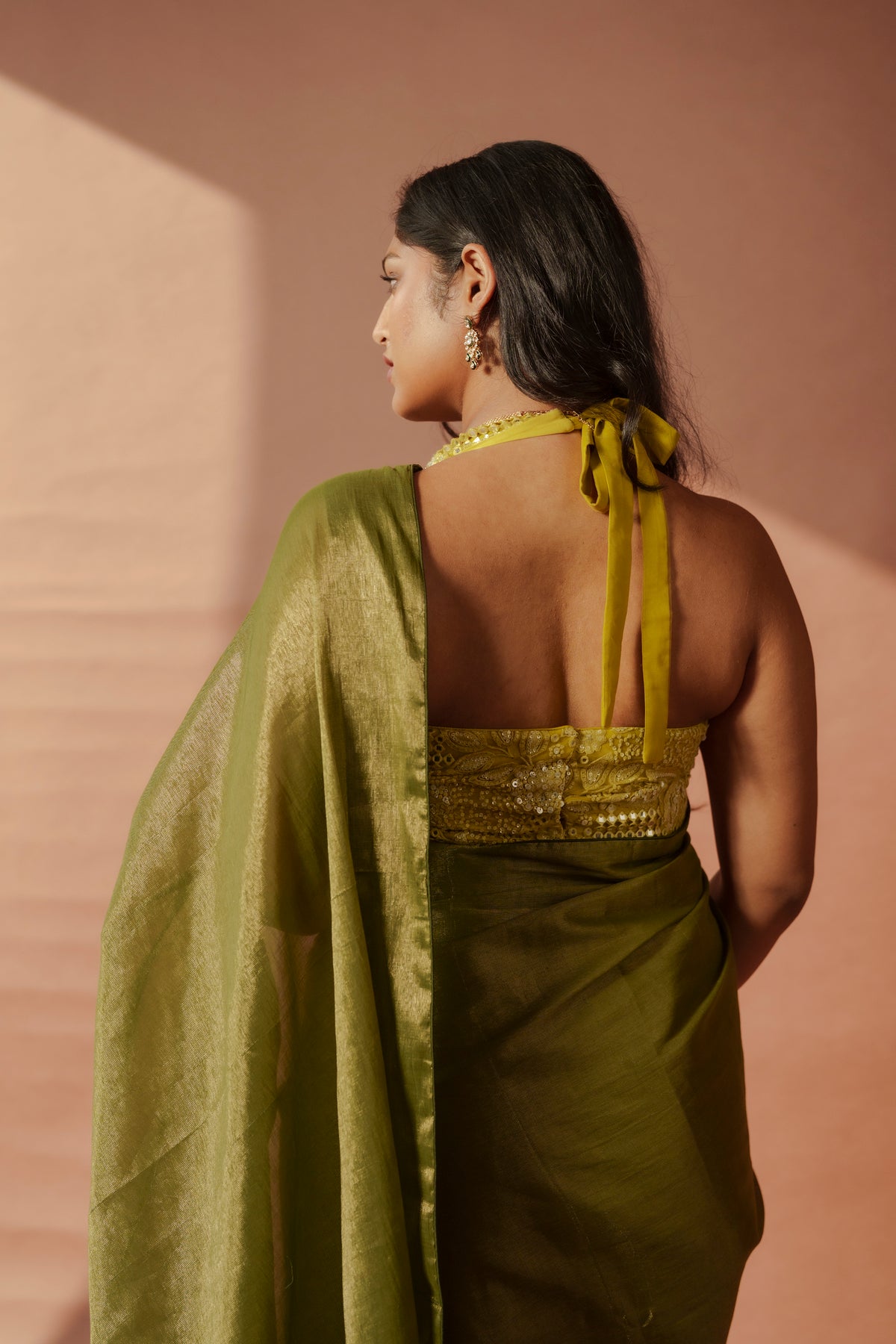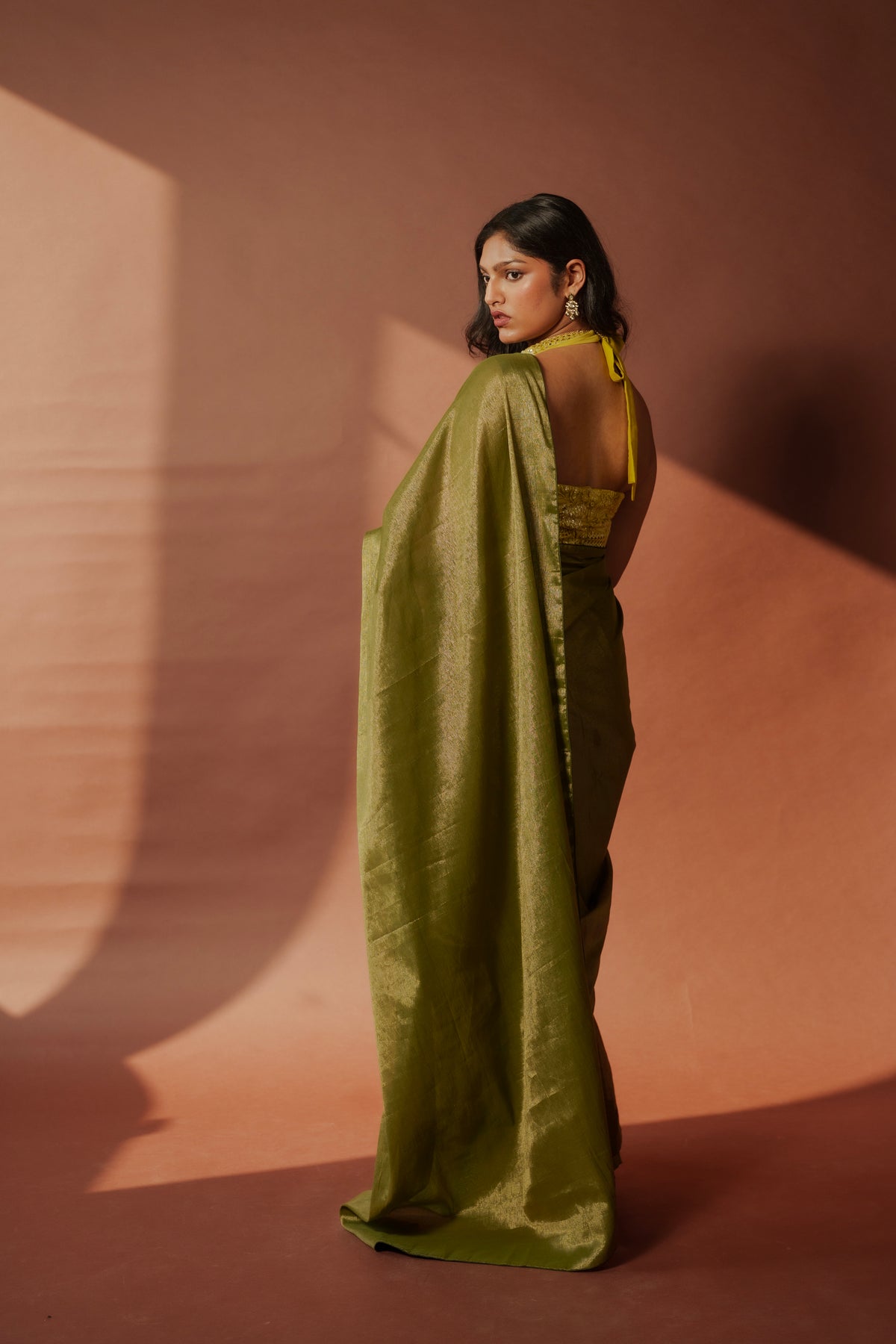 Maya olive green tissue saree featuring an open pallu and a sleeveless blouse, redefining the contemporary saree silhouette. Lightweight and effortlessly stylish, this ensemble is perfect for mehndi functions, daytime wedding events, and festive celebrations.