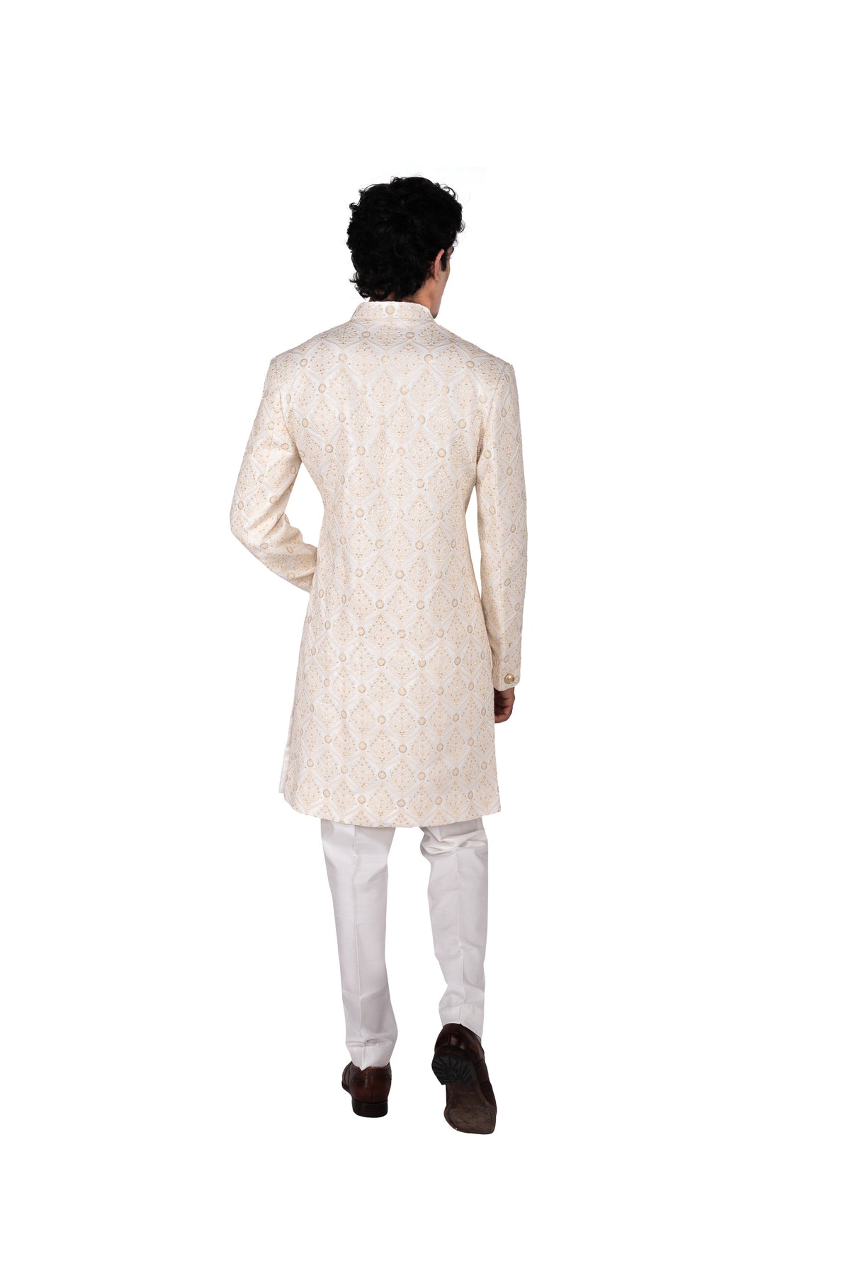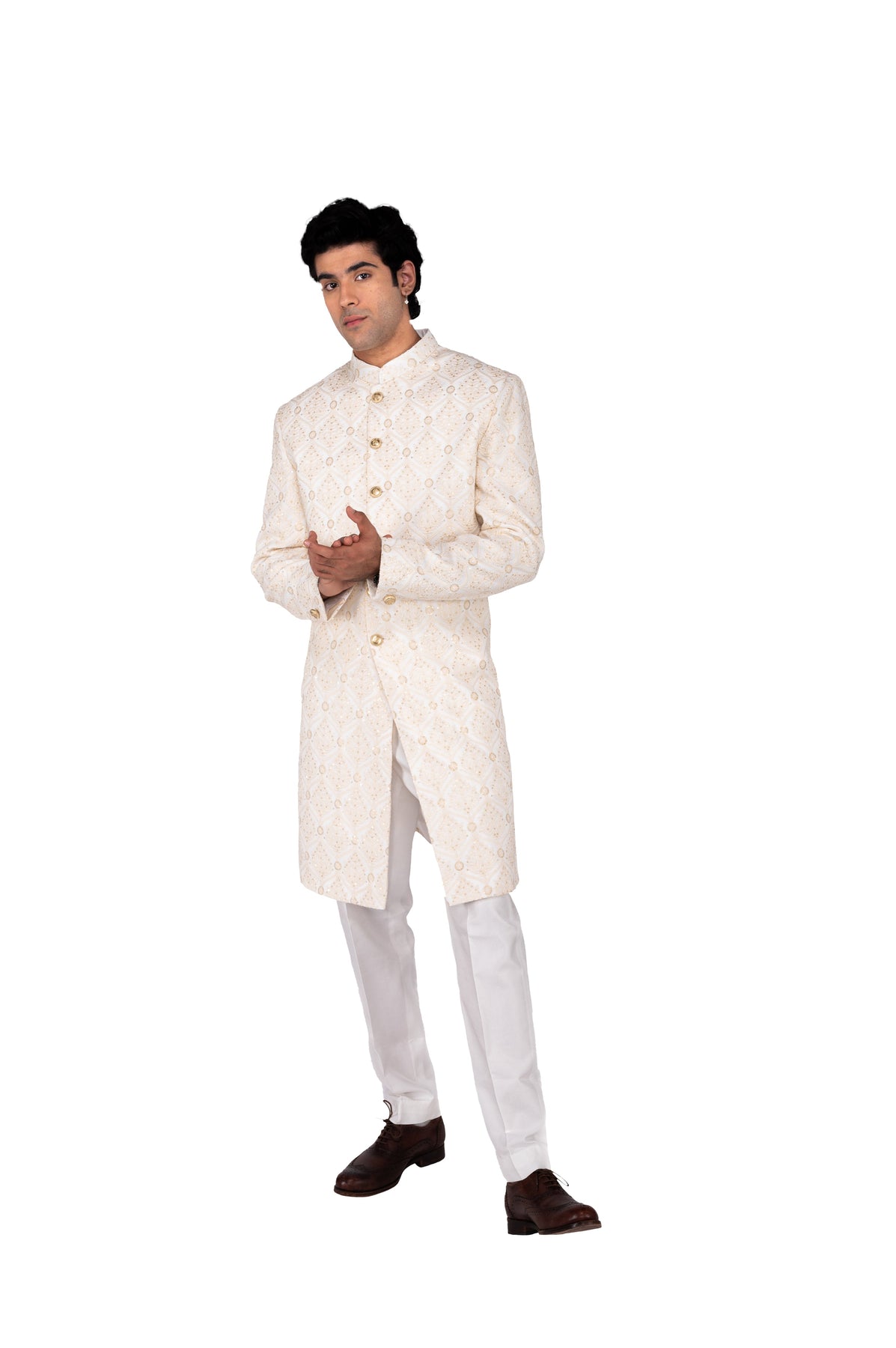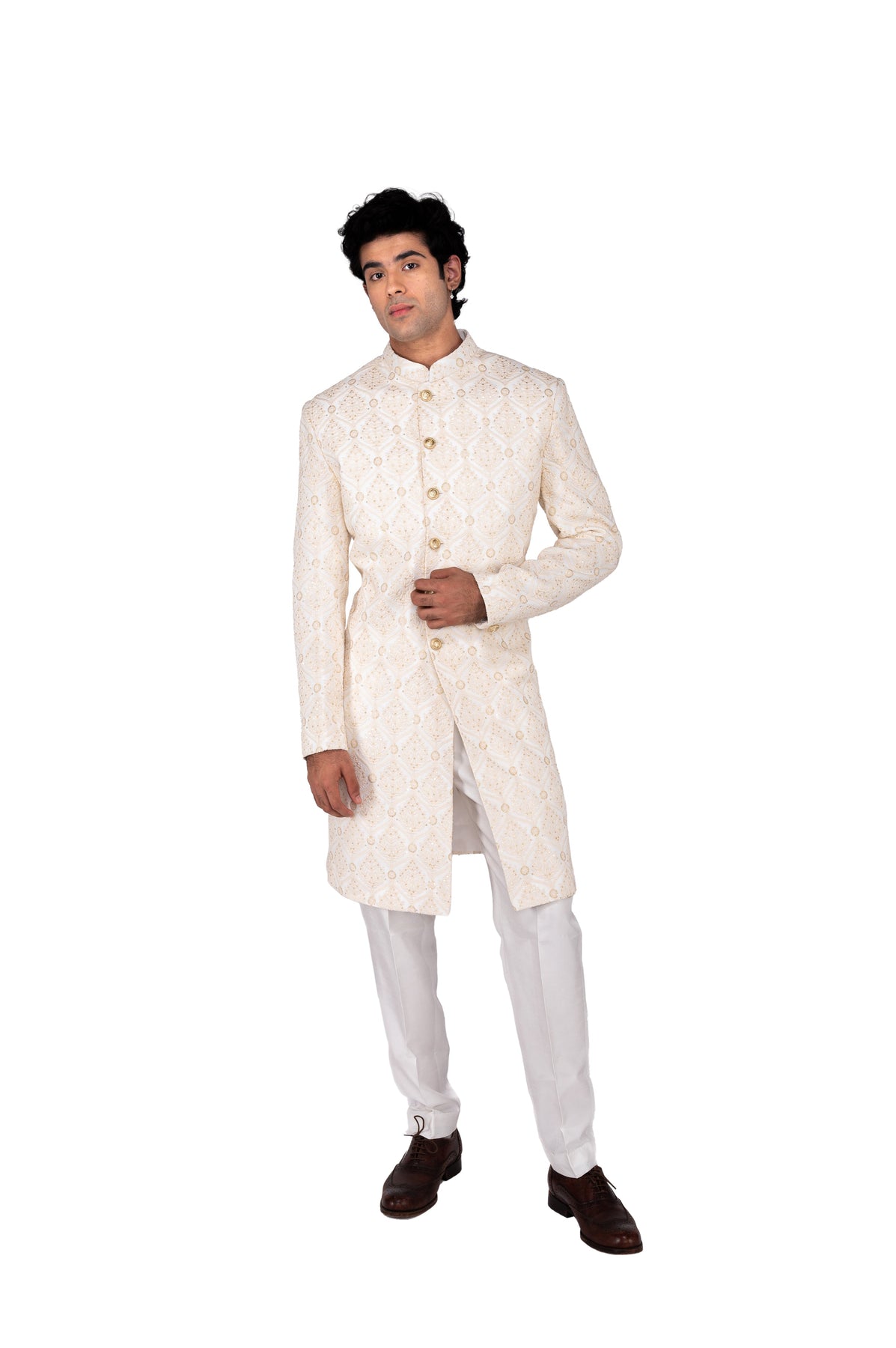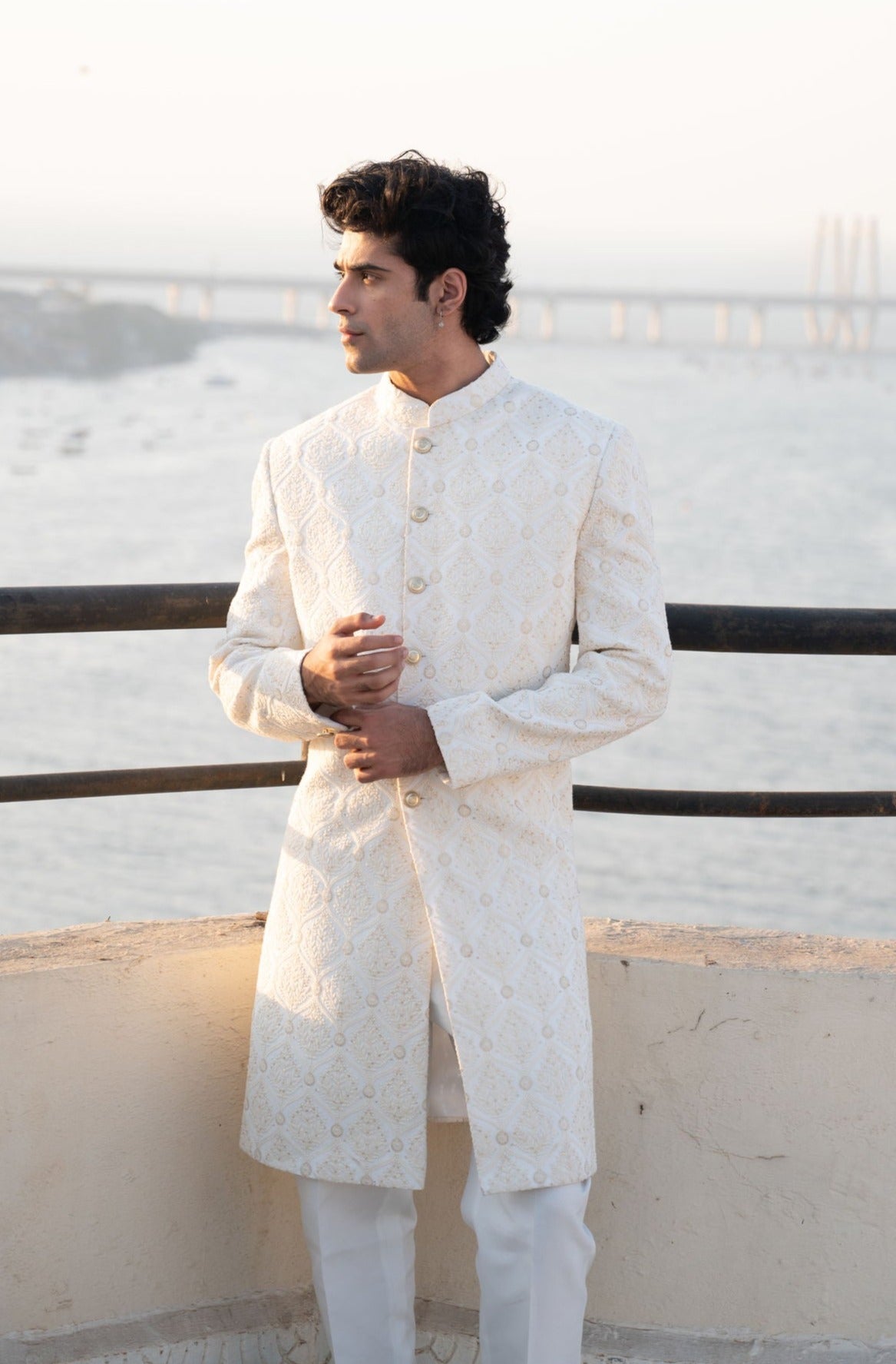 A lakhnavi sherwani is a classic timeless piece that gives off the ultimate regal look. This is the perfect sherwani for the wedding morning for either an intimate wedding or a close member of the wedding party (cue the brides brother!)