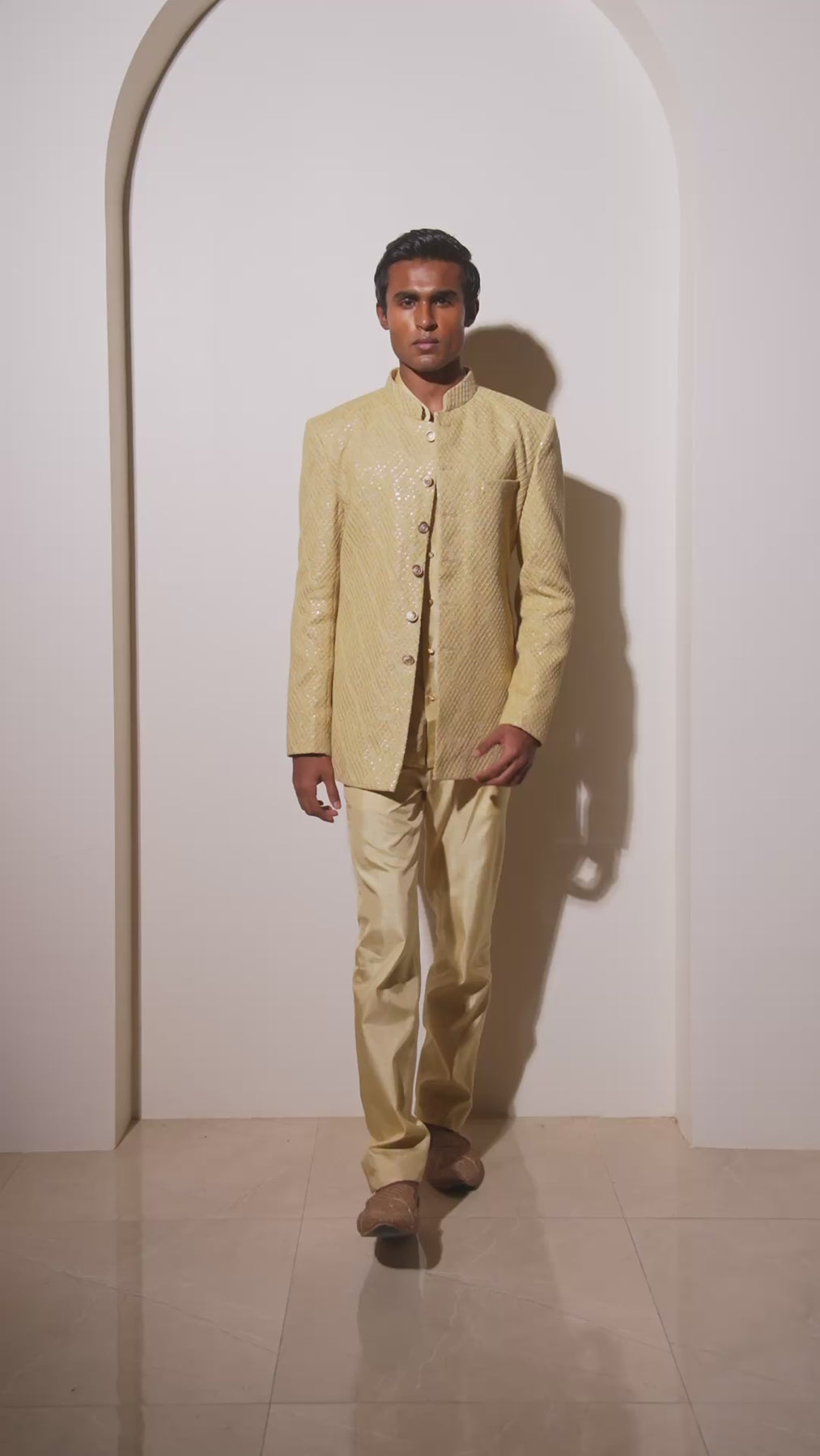 Crafted in rich gold Lucknowi silk and adorned with golden sequins, the Ranveer Jacket blends traditional artistry with a statement-making silhouette. Perfect for festive evenings or wedding celebrations, it adds a touch of regal elegance to any outfit.