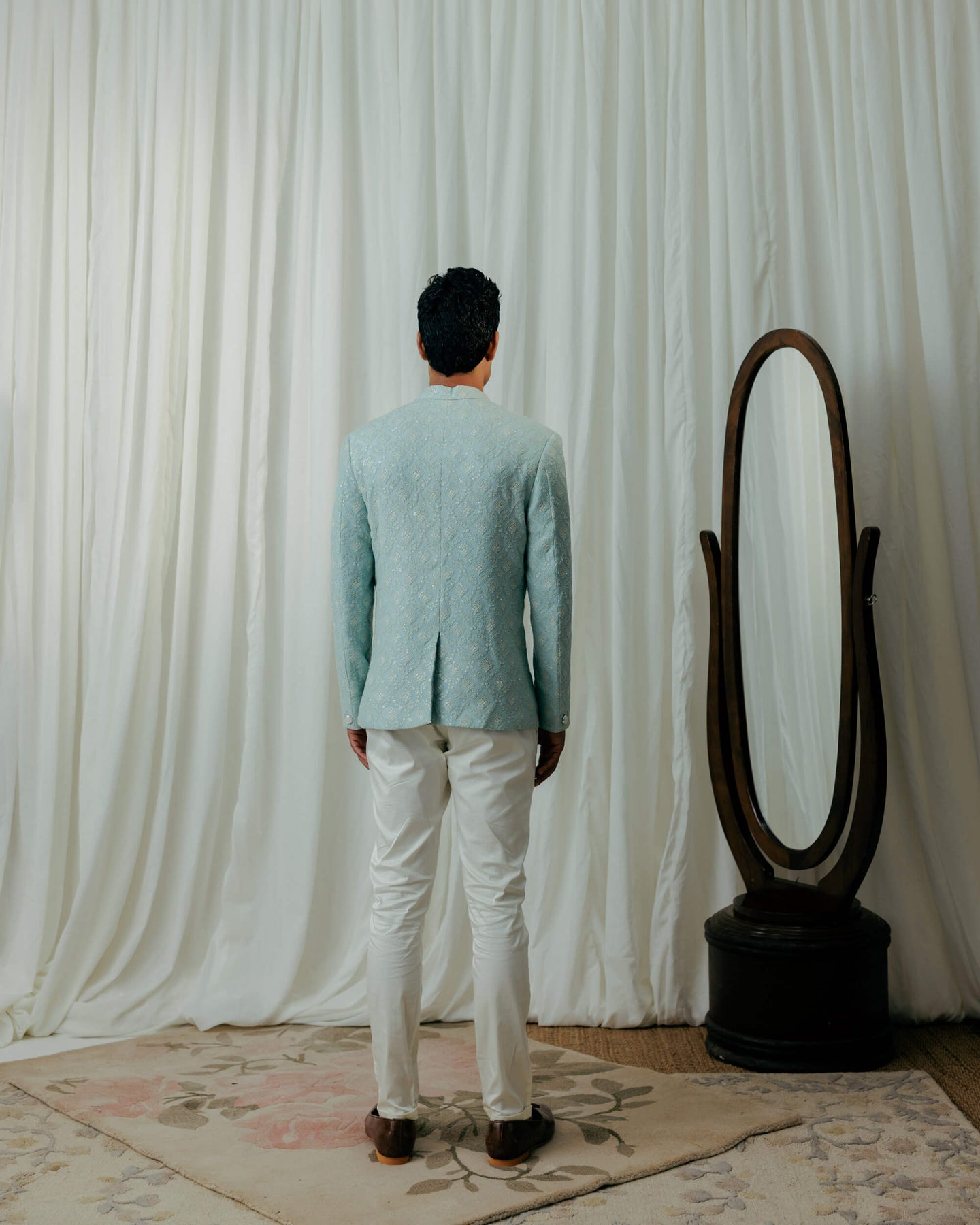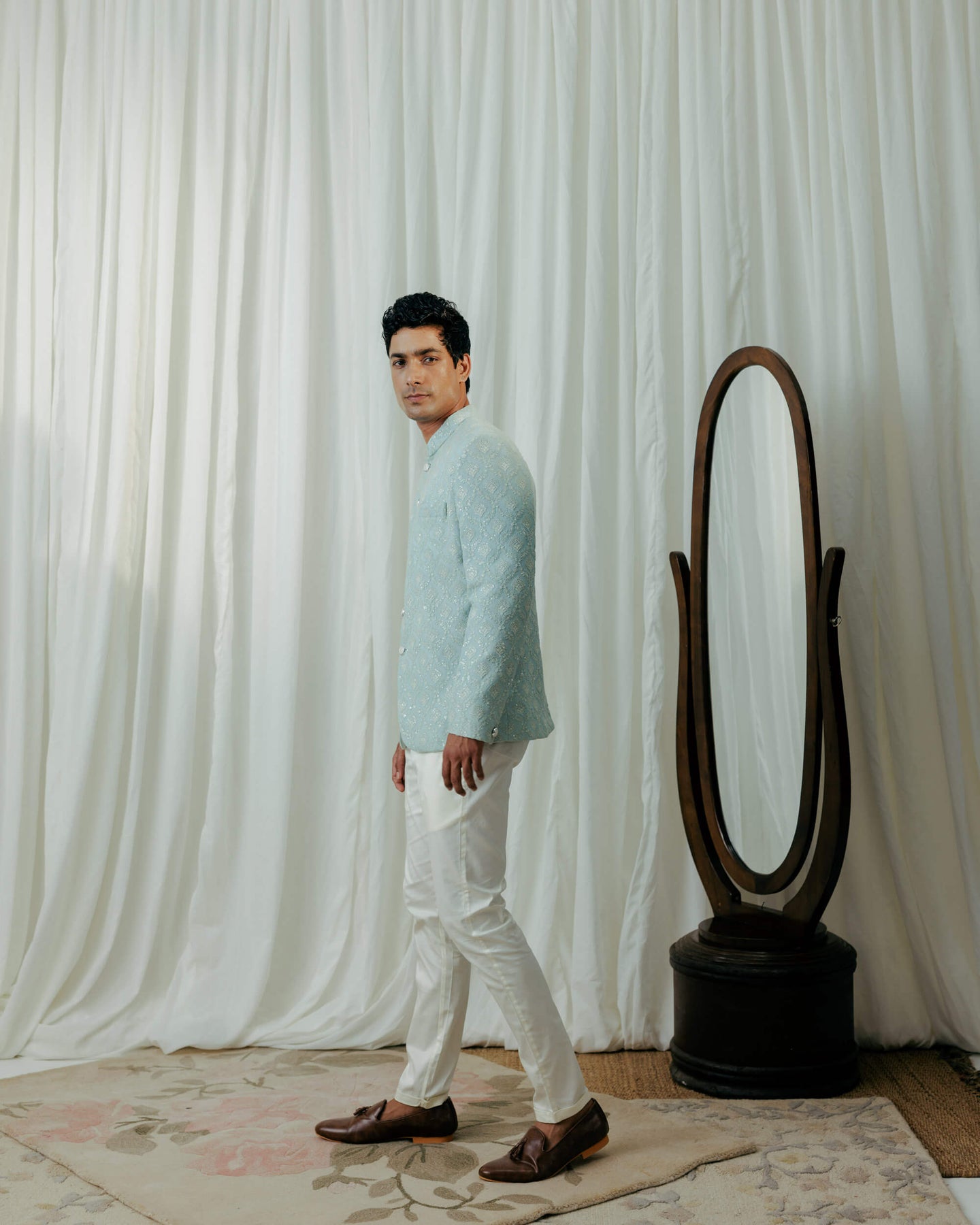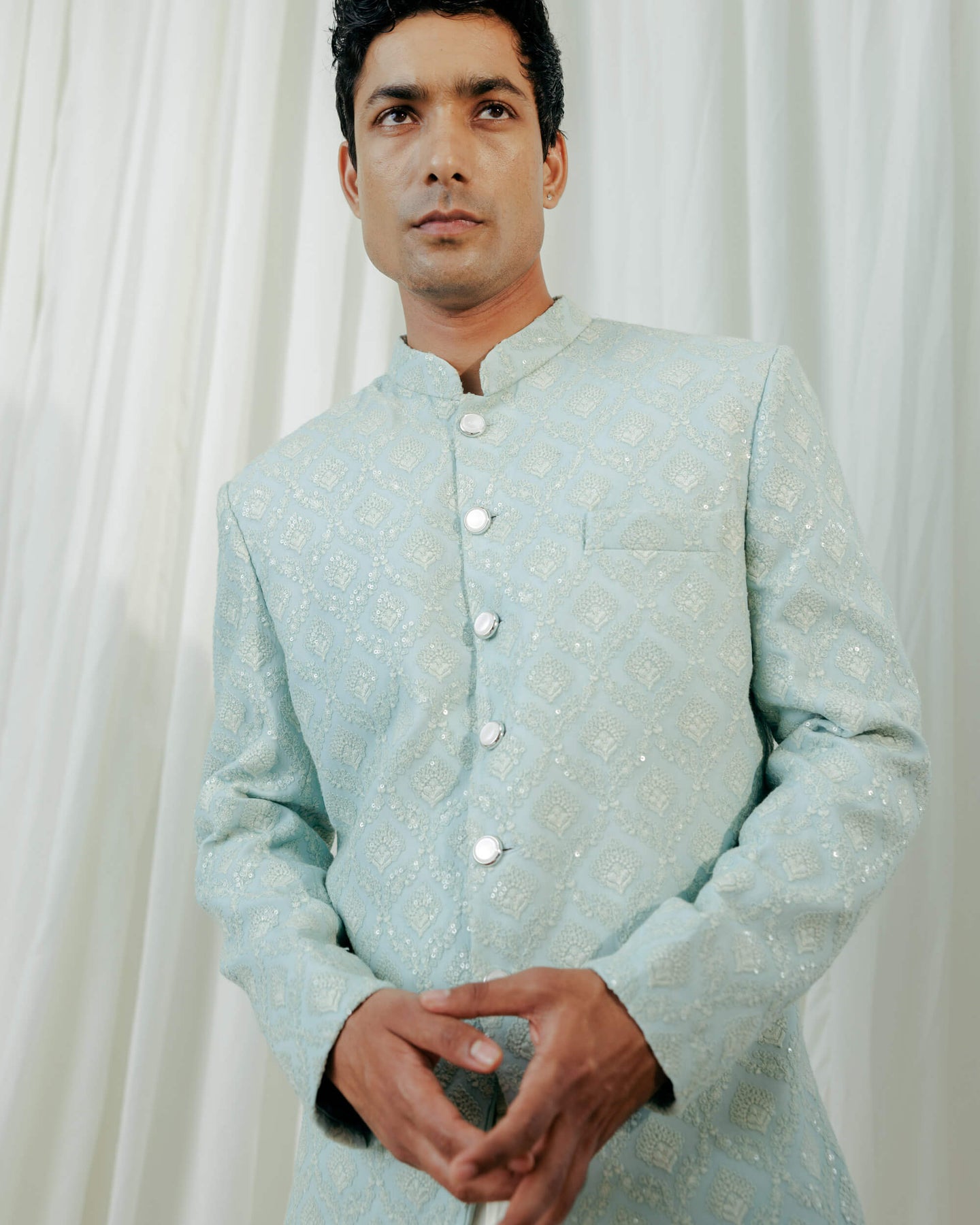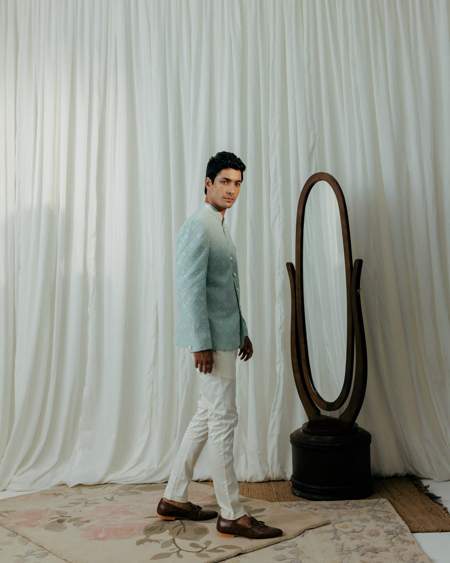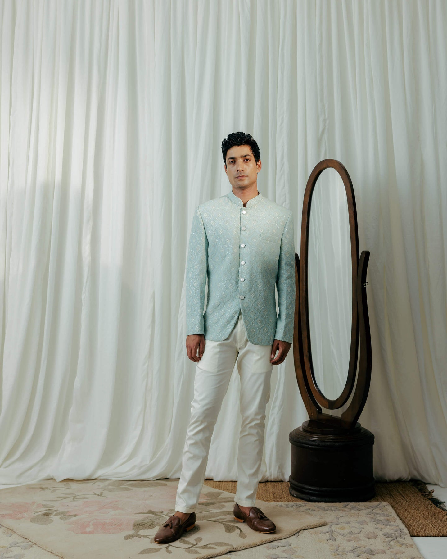This jodhpuri’s flattering silhouette is staple for your South Asian wardrobe. The rich lakhnavi fabric and the pearl button details are sure to catch everyone’s eye.