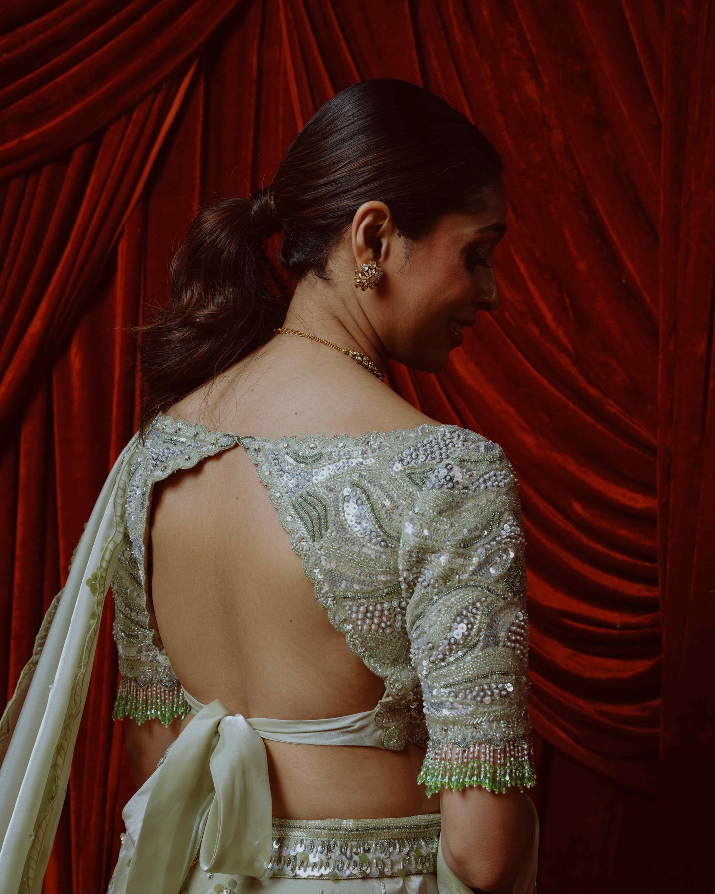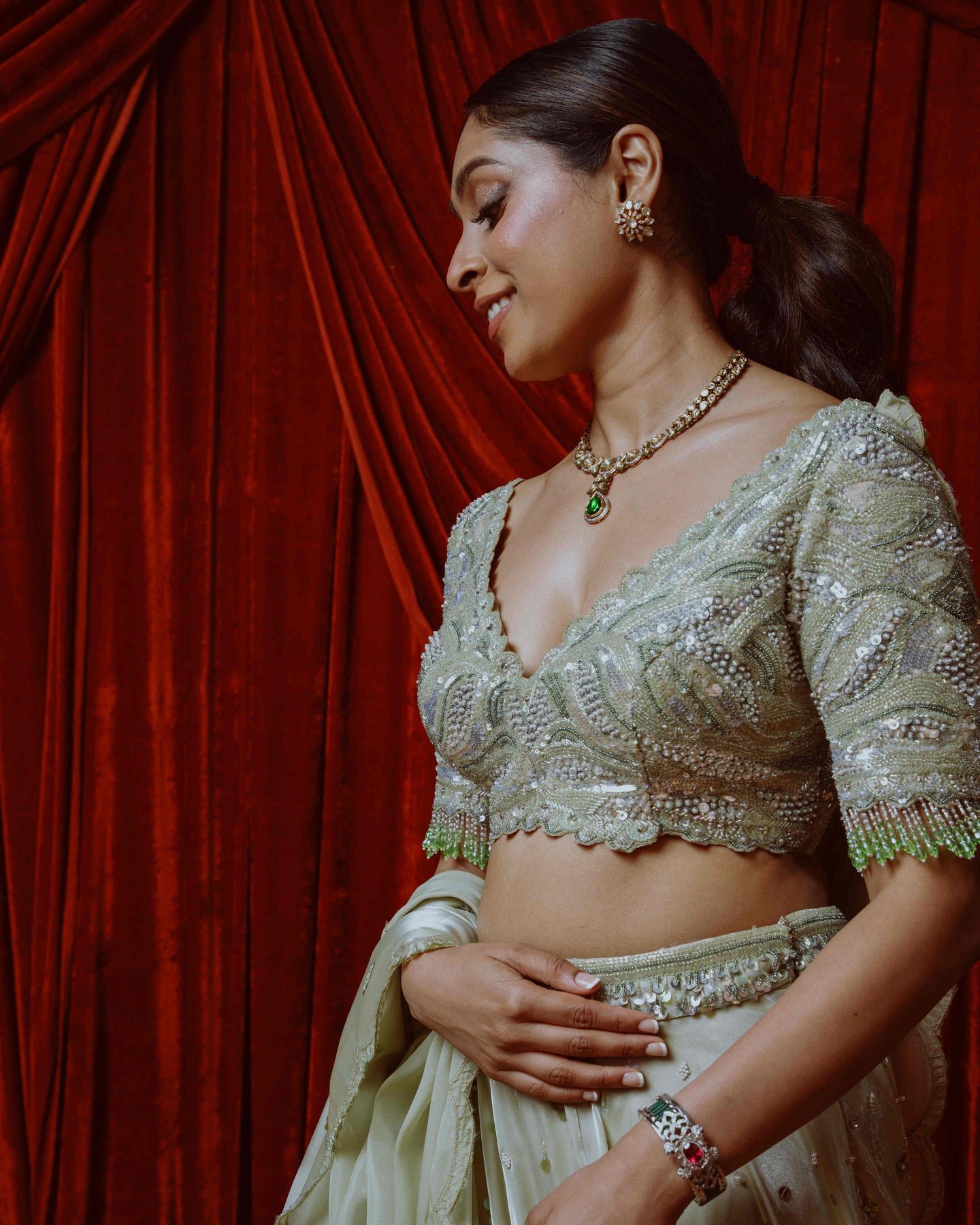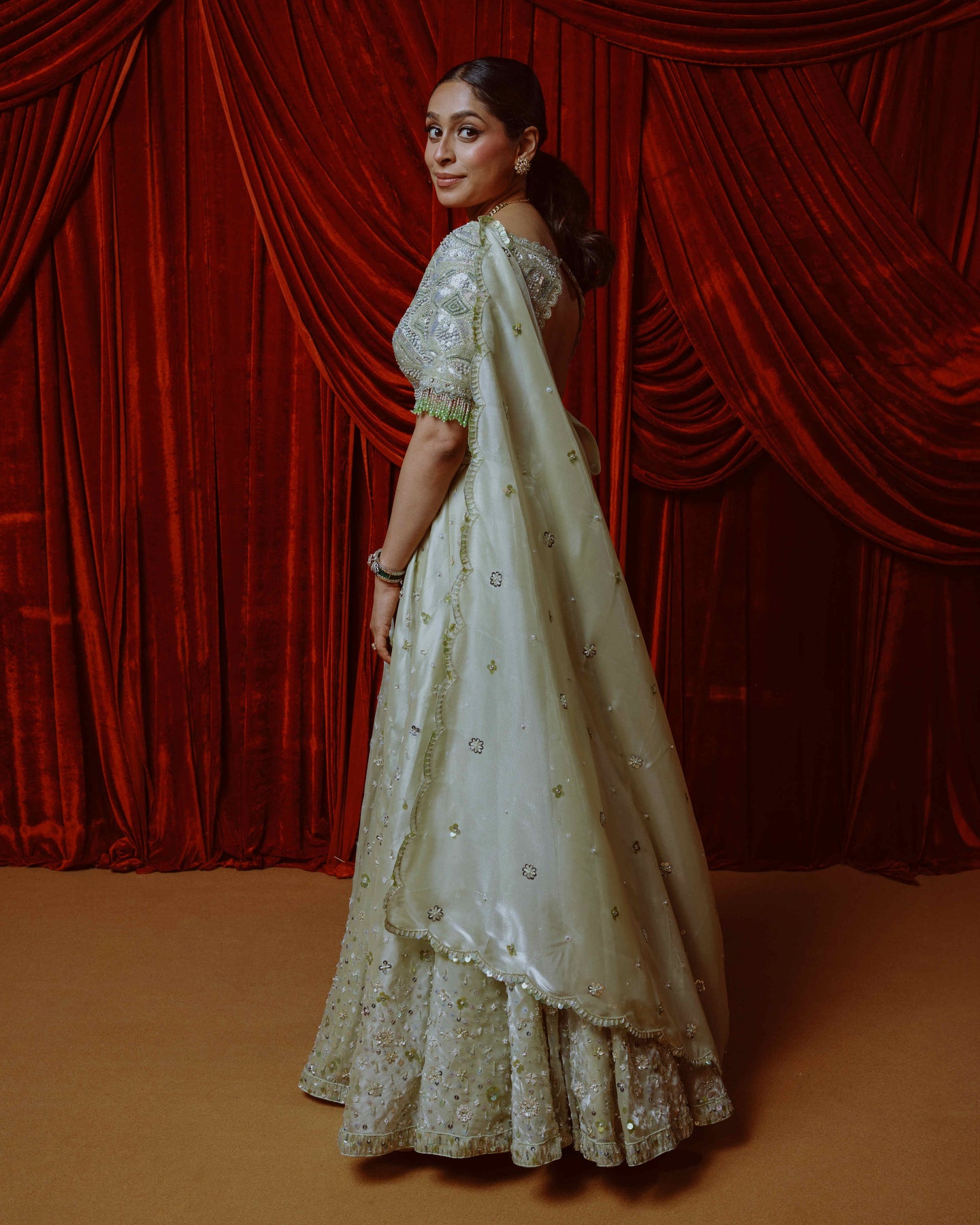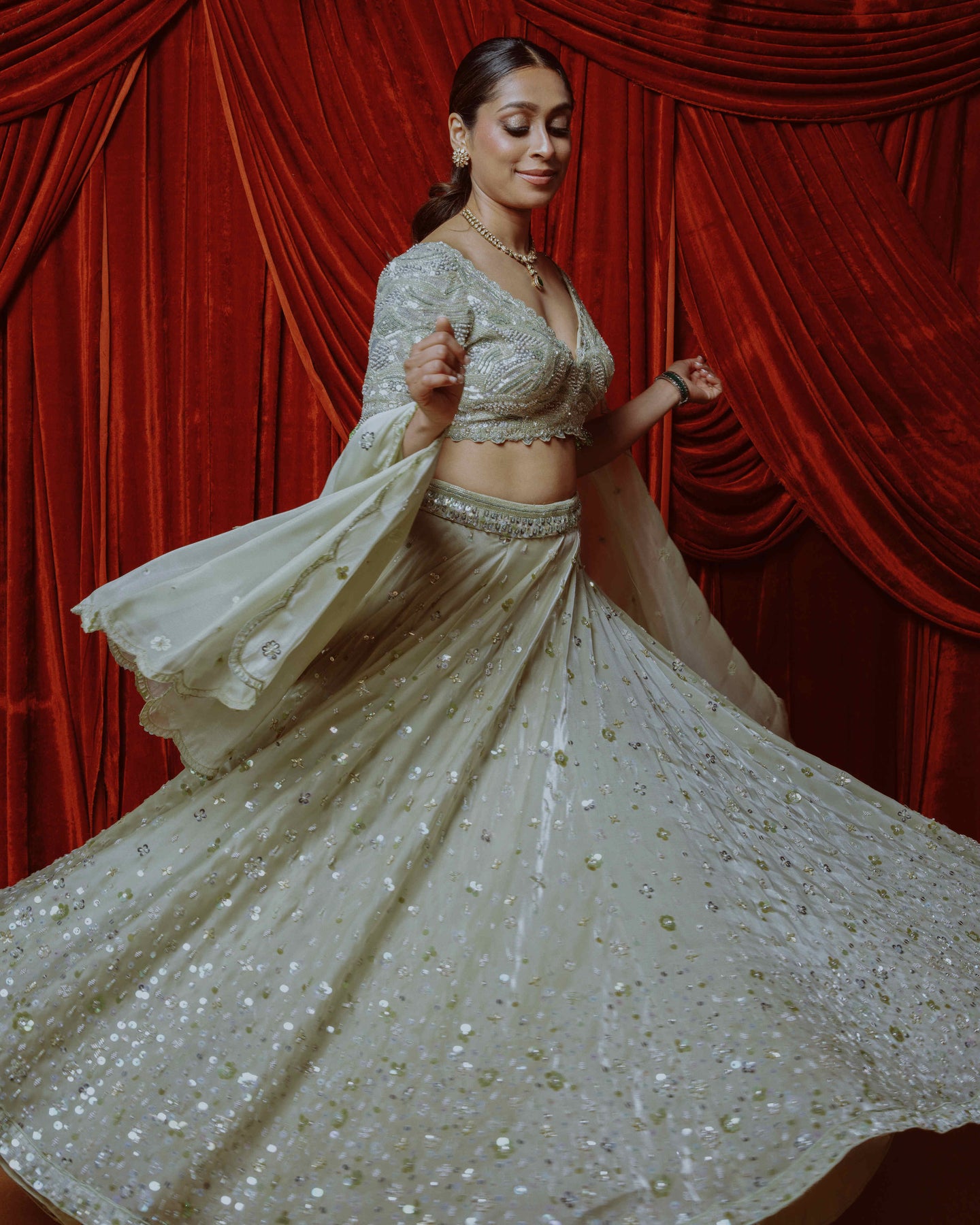 A stunning silk skirt with resham and sequins embroidery. Blouse cut and embroidery can be customized.