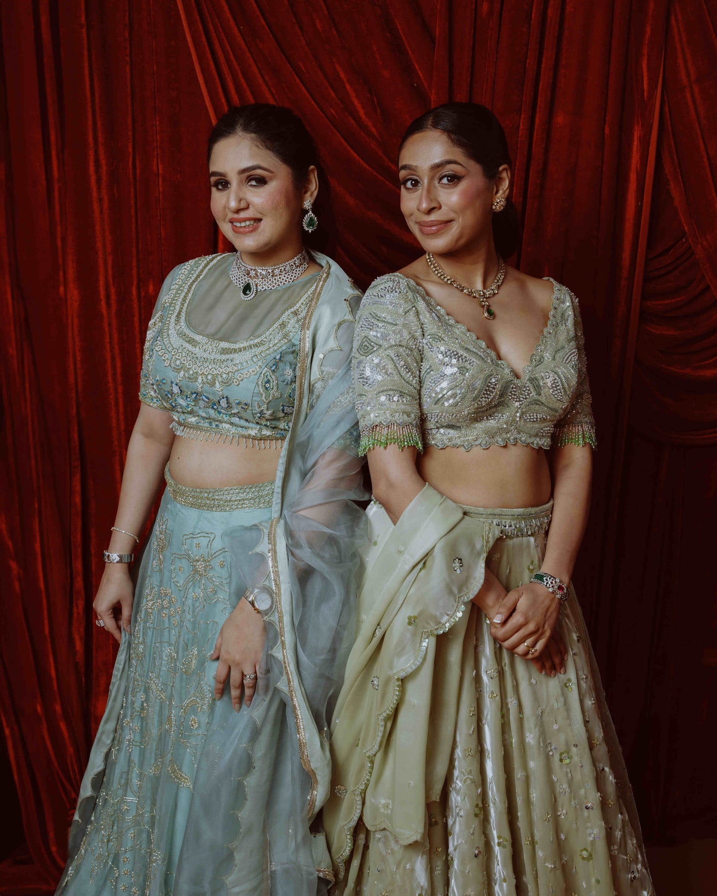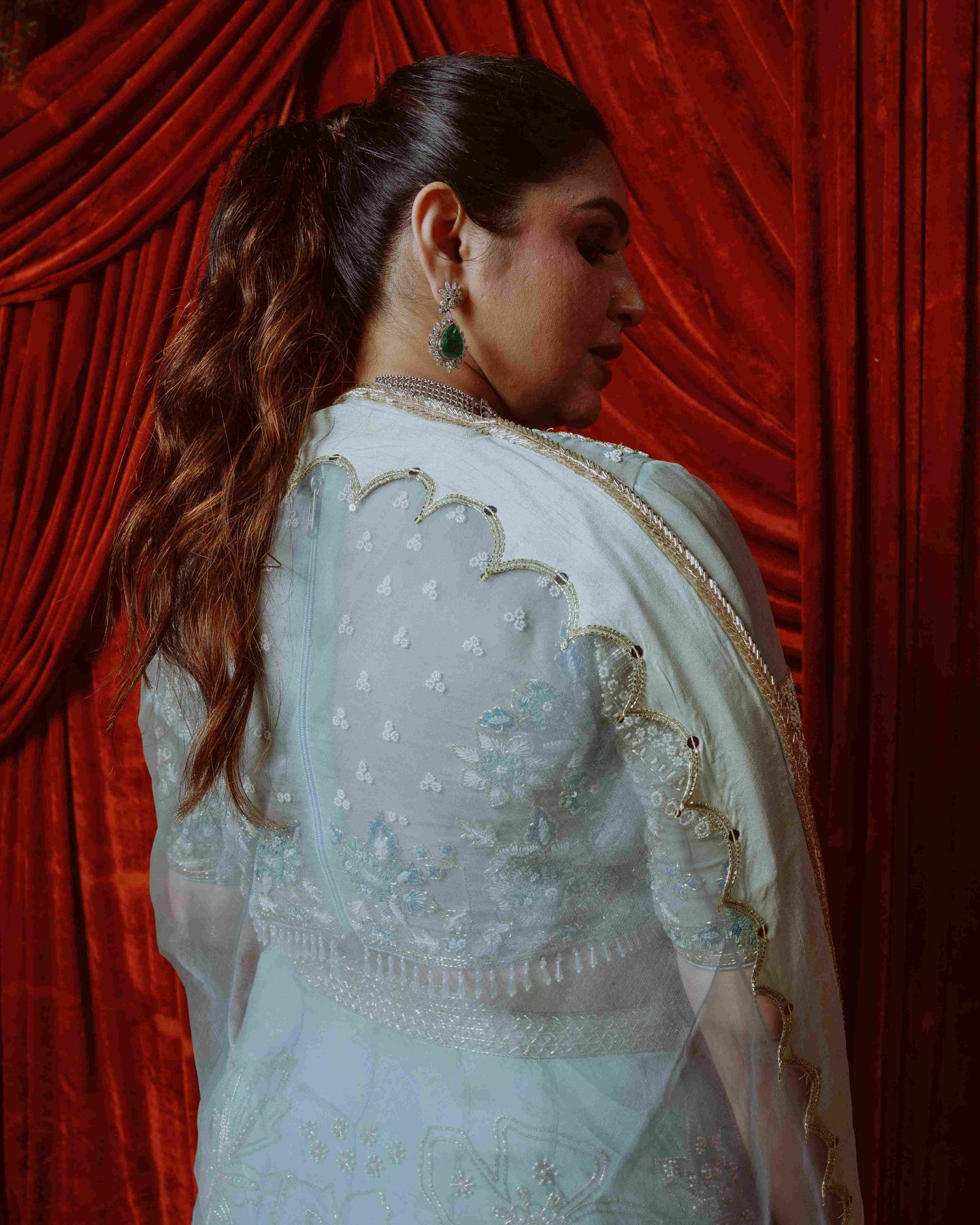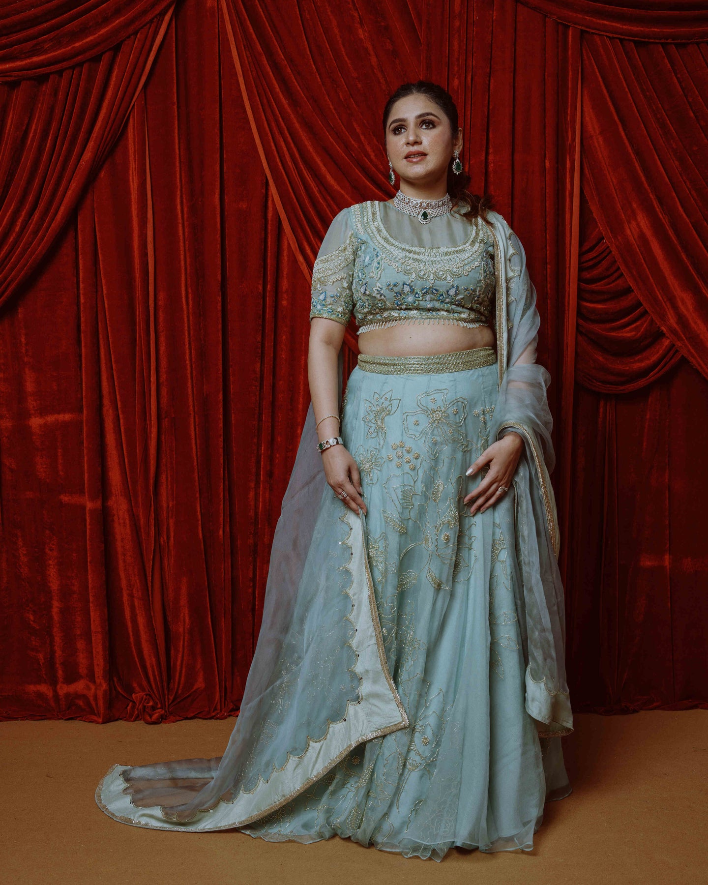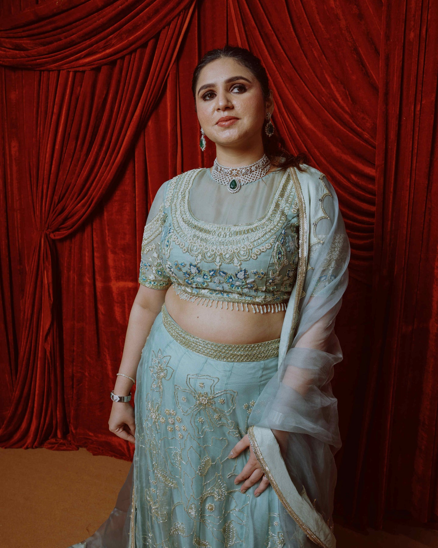 A stunning glass tissue skirt with sequin detailing. Blouse cut and embroidery can be customized.