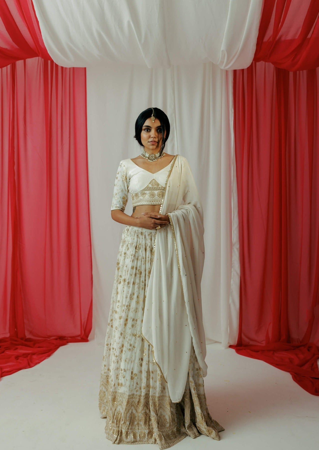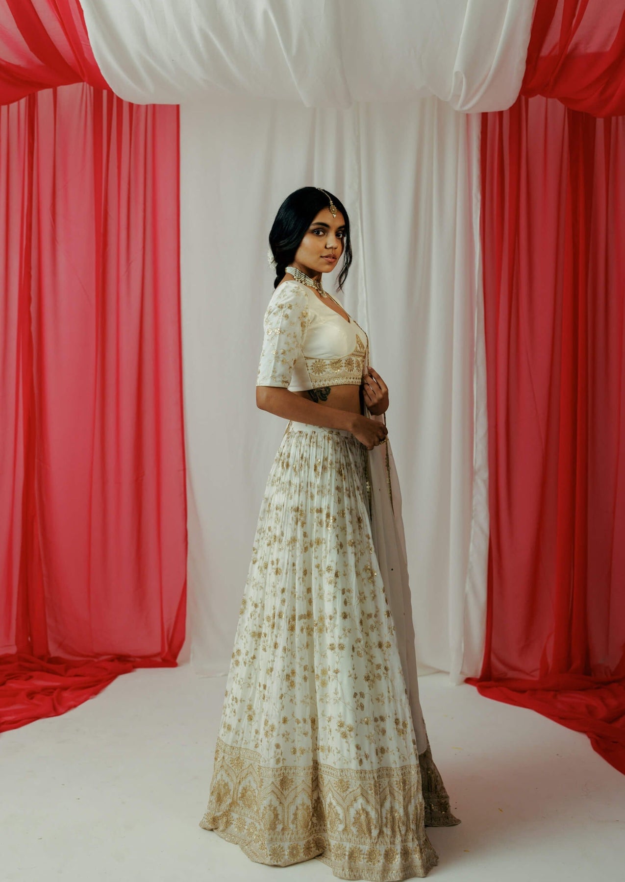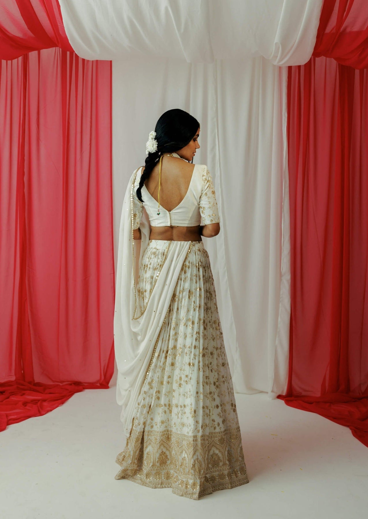 This traditional style skirt paired with a modern blouse is embellished with gold sequin and thread throughout. This unique look is one of our favorites and will make you the star of the night.