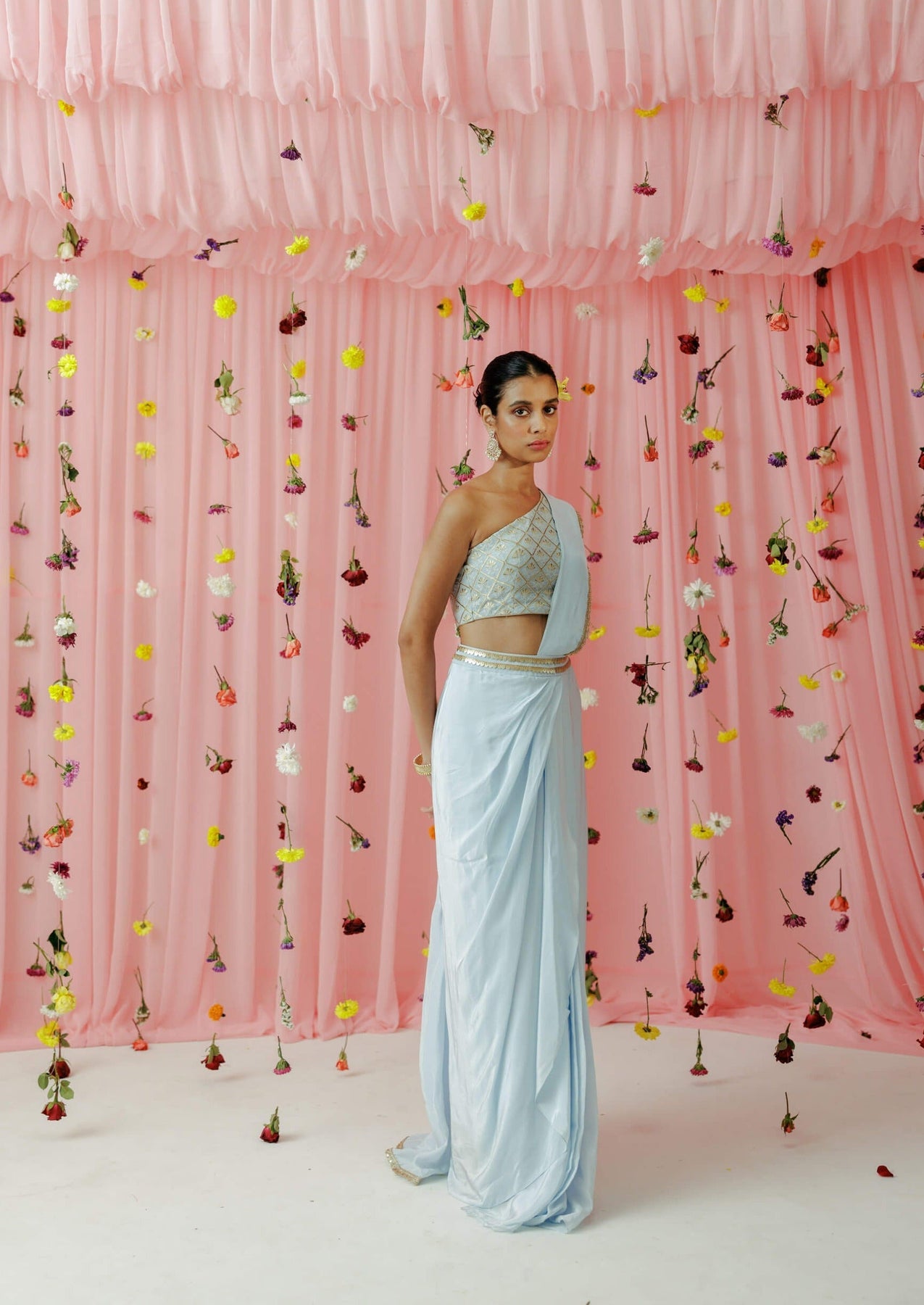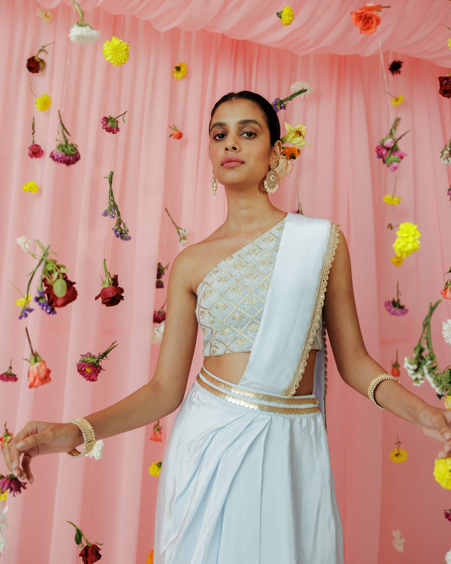 • Blouse: Embroidered silk, offering a rich and elegant look with asymmetrical styling.