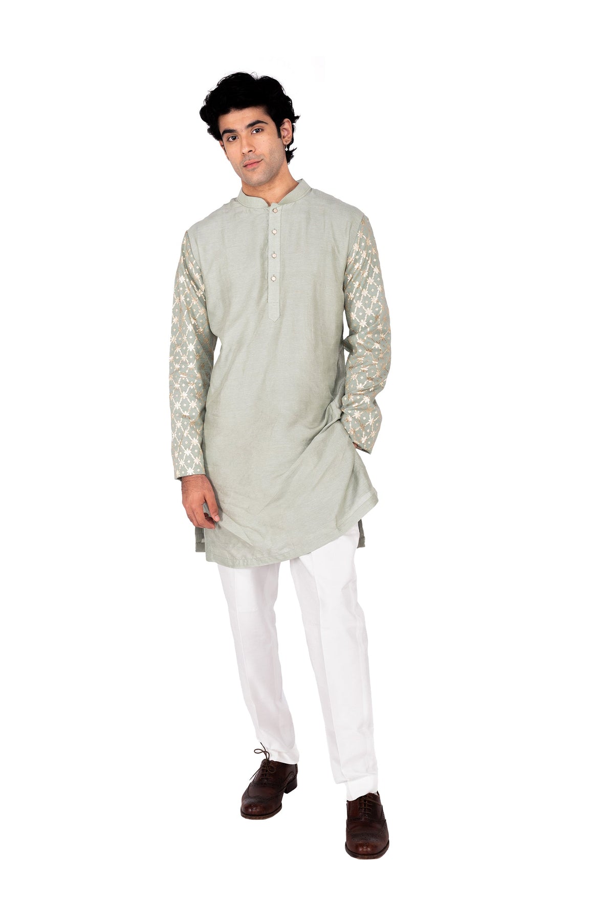 • Pants: Silk pants, ensuring a cohesive, polished appearance.