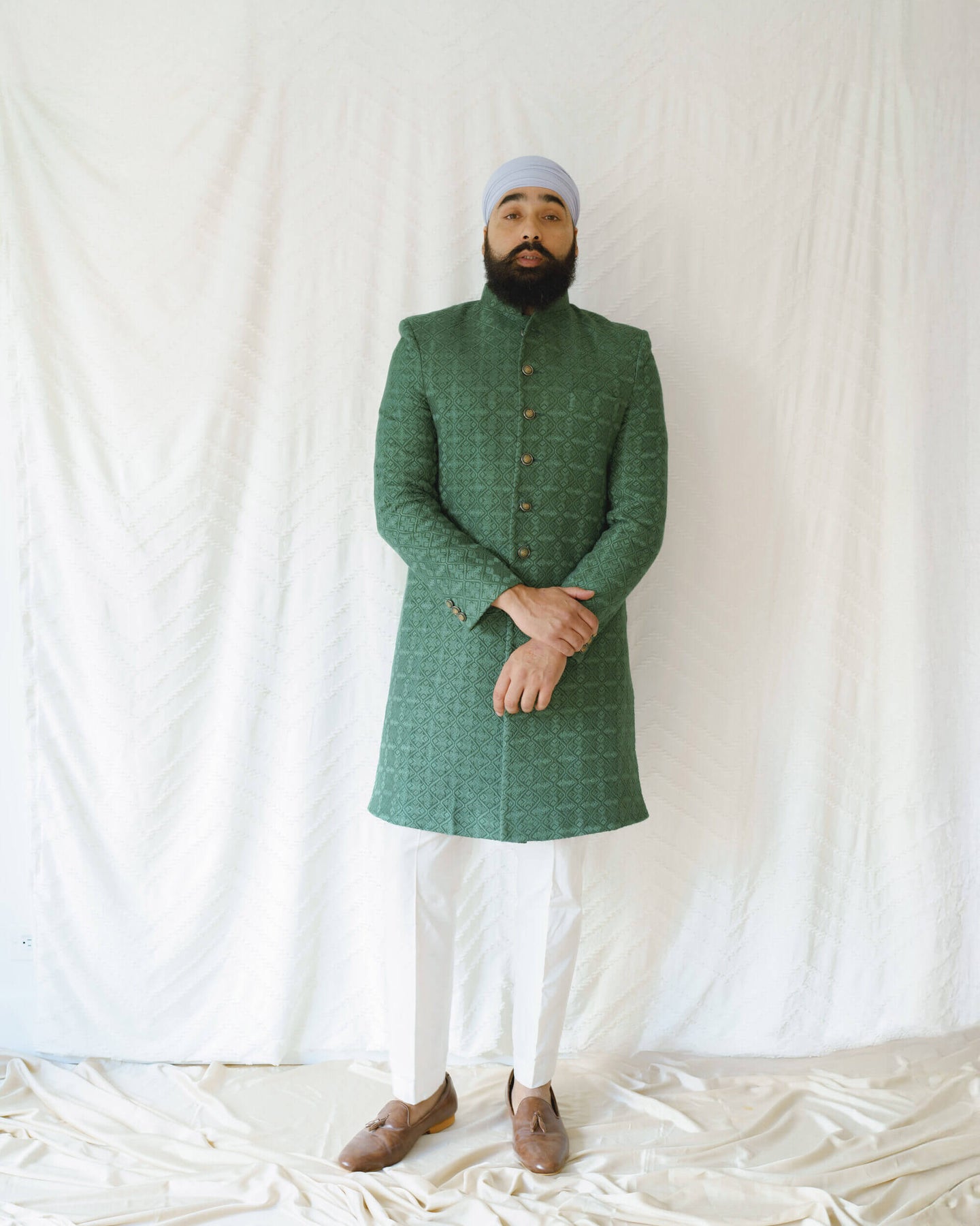 With the same softness Sufi remembers her late father, Nasir, this sherwani is light airy and slightly romantic. A beautiful light blue color, this is the perfect summer suit.