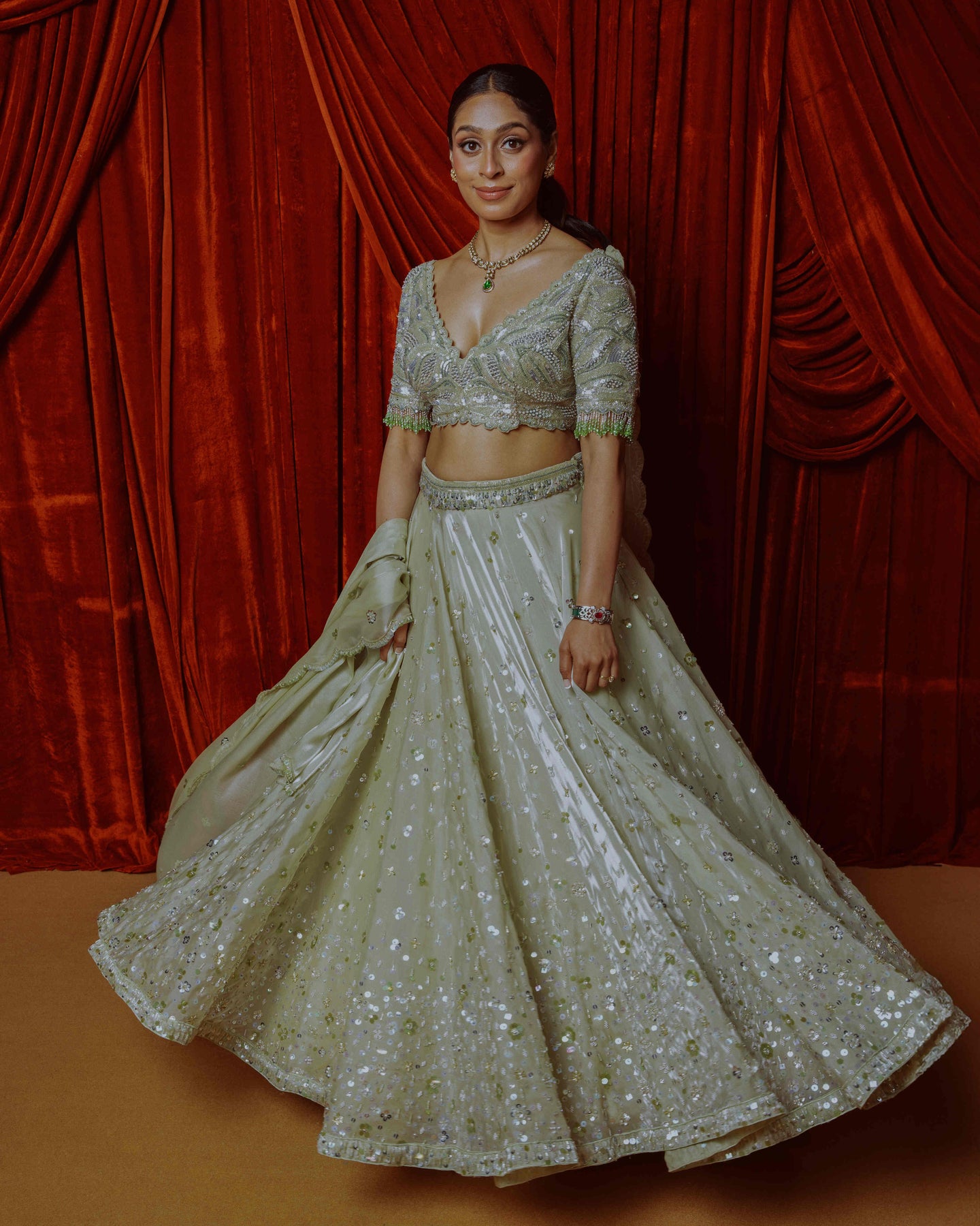 A stunning organza skirt with sequin and pearl detailing. Blouse cut and embroidery can be customized.