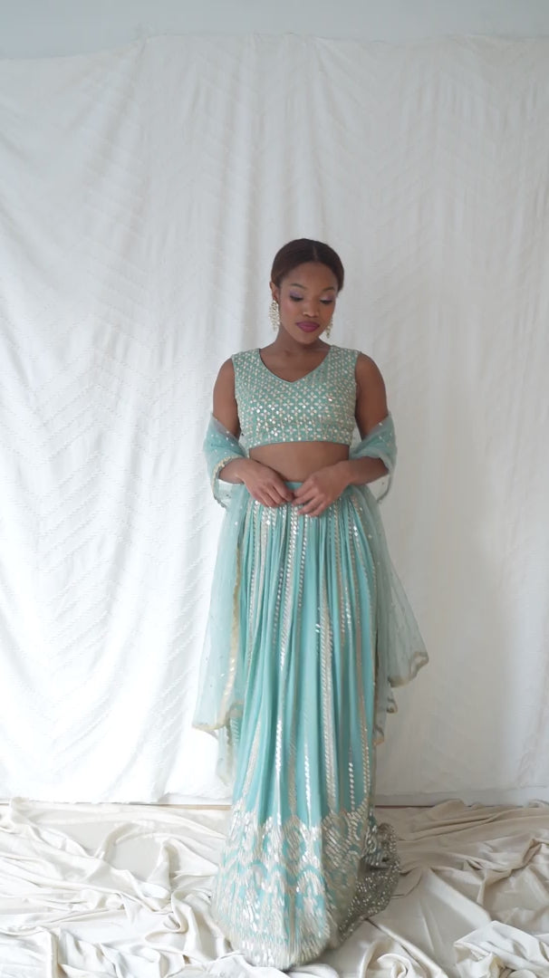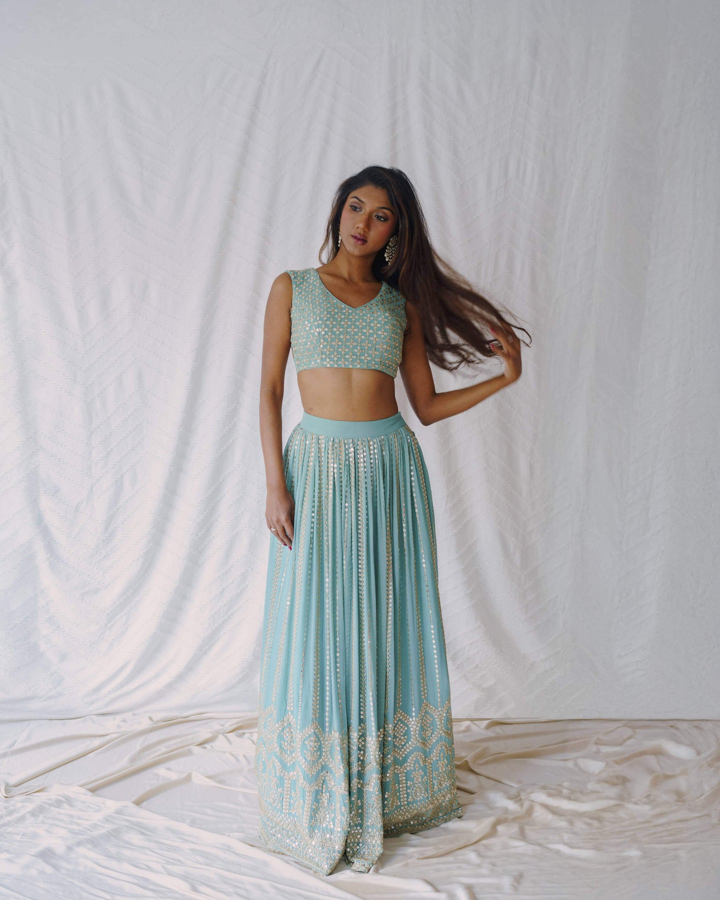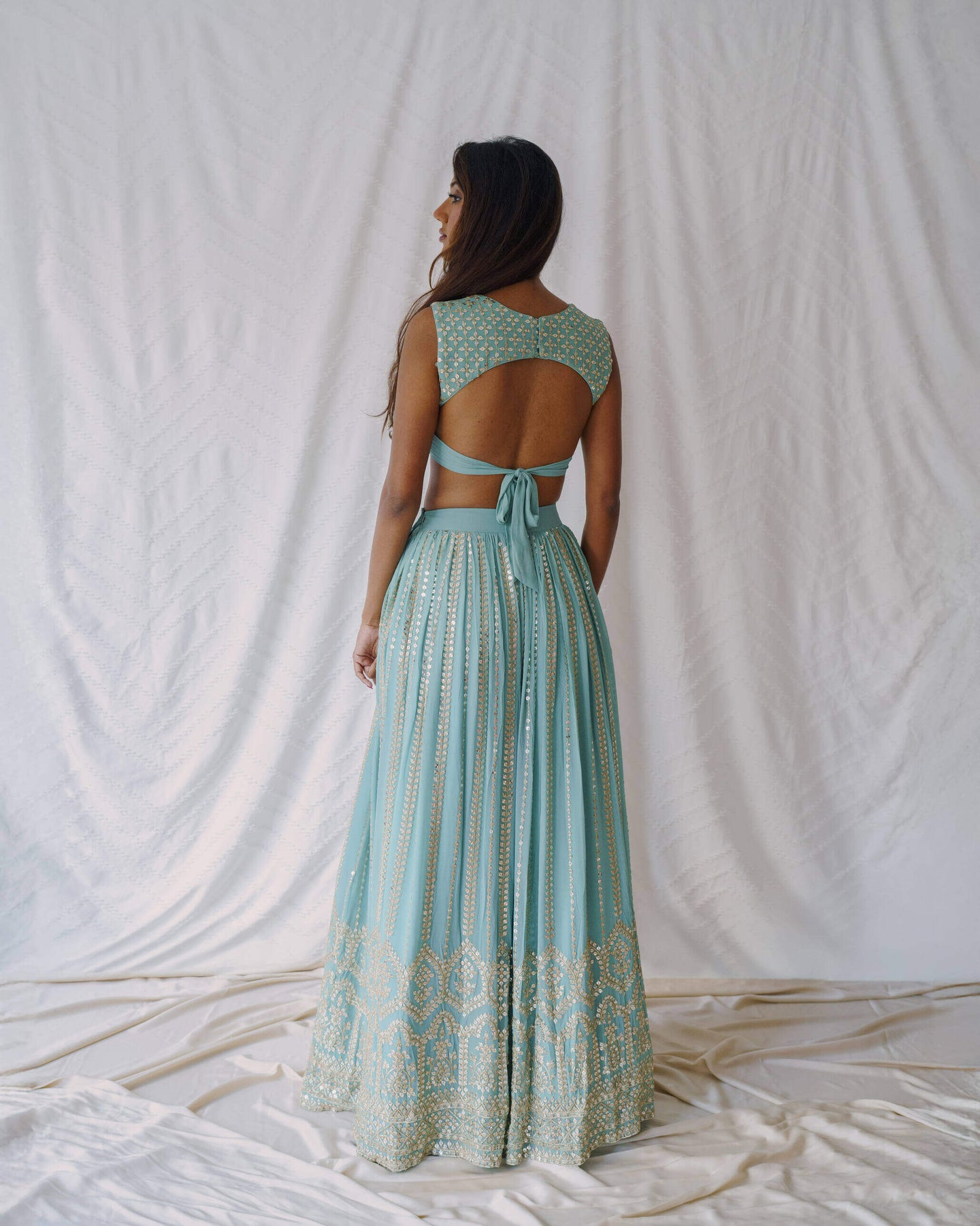 This romantic lehenga is perfect for that European summer wedding. The mirror work lehenga is a combination of traditional work but with a light modern flair.