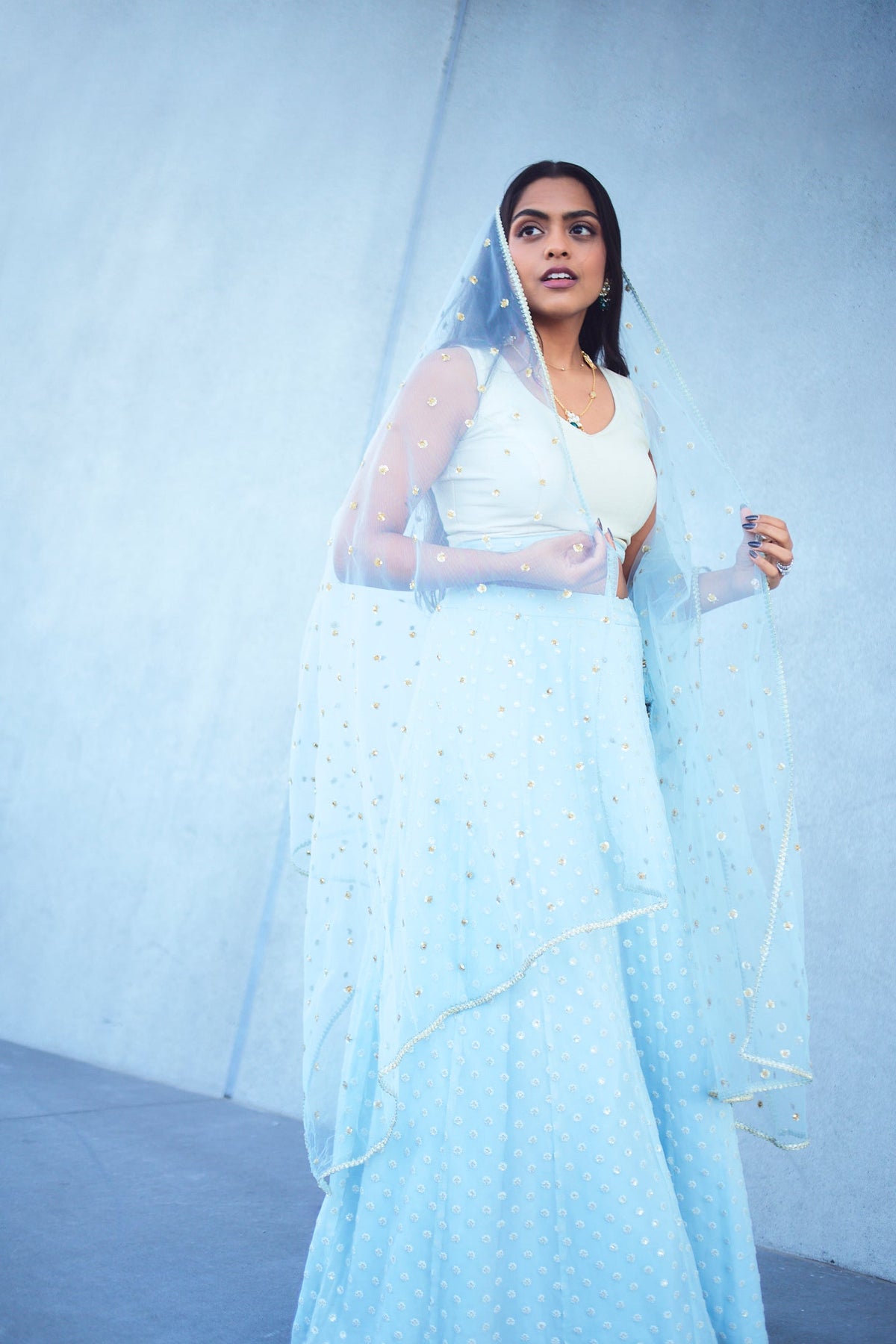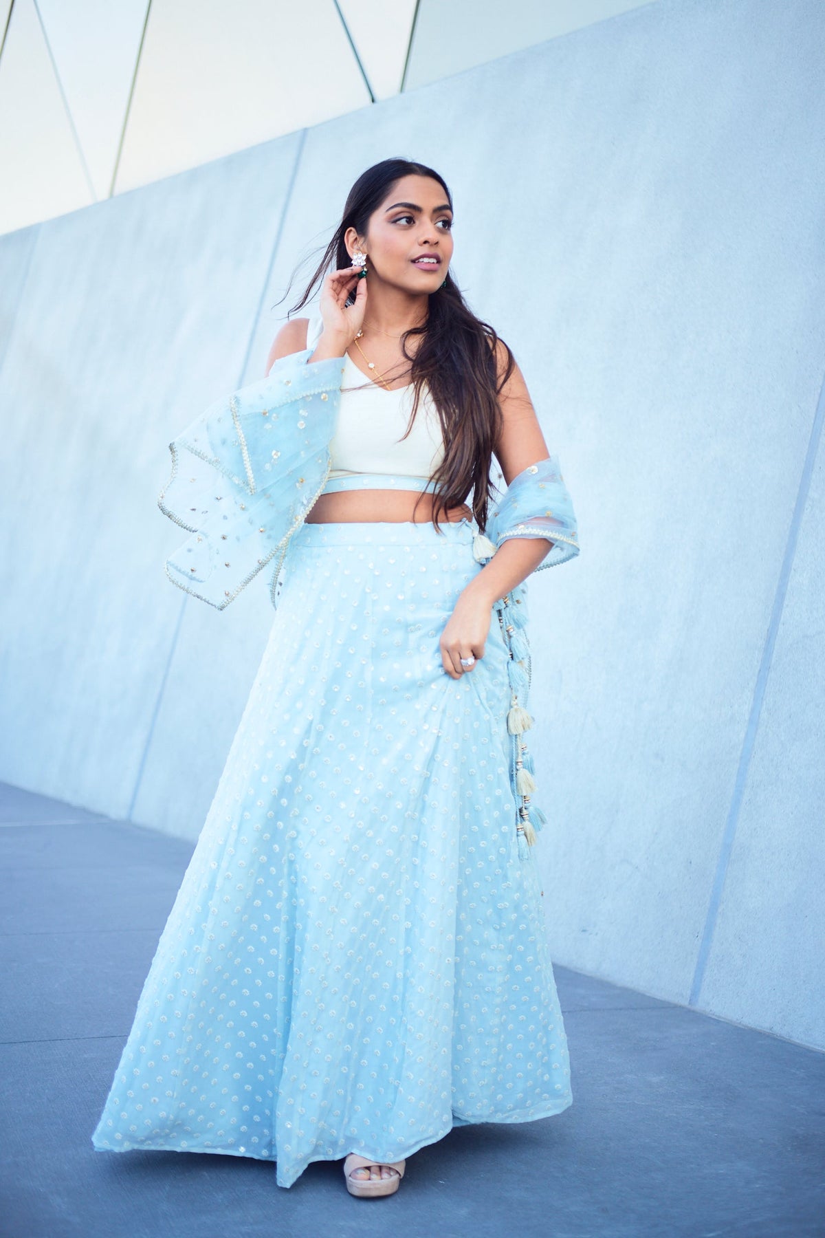 A clean and classic lehenga that can be easily customized per your liking! Have a different color combo in mind? Want to turn the blouse into a one shoulder top? SImply checkout and include your specification in the comment box.