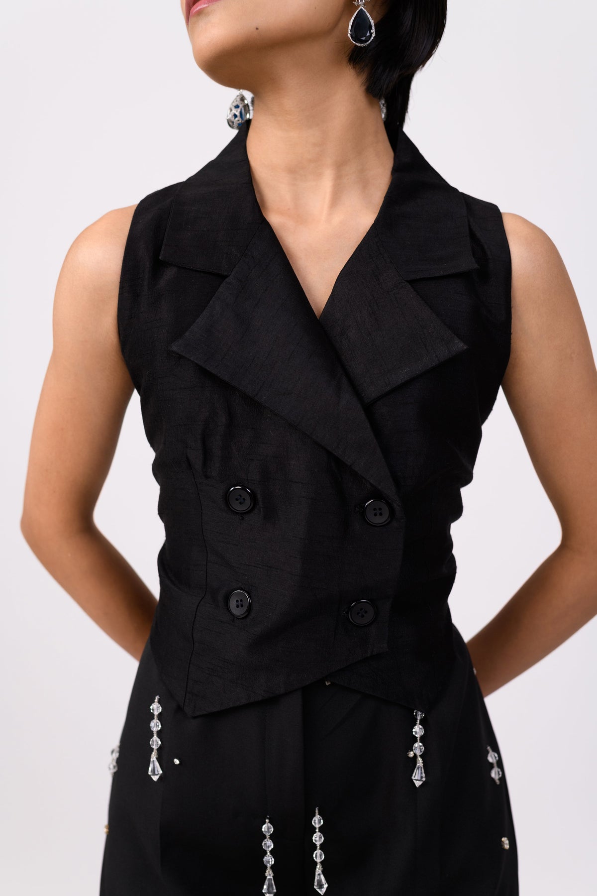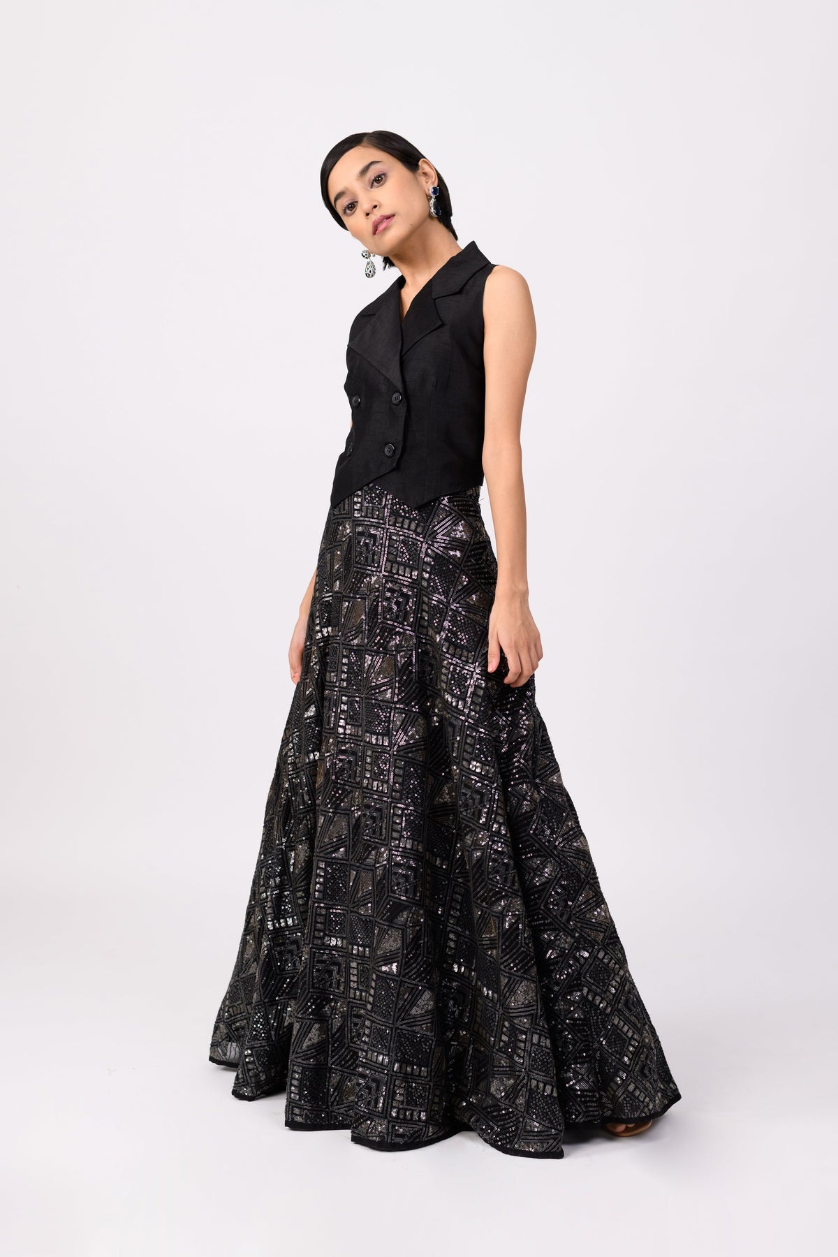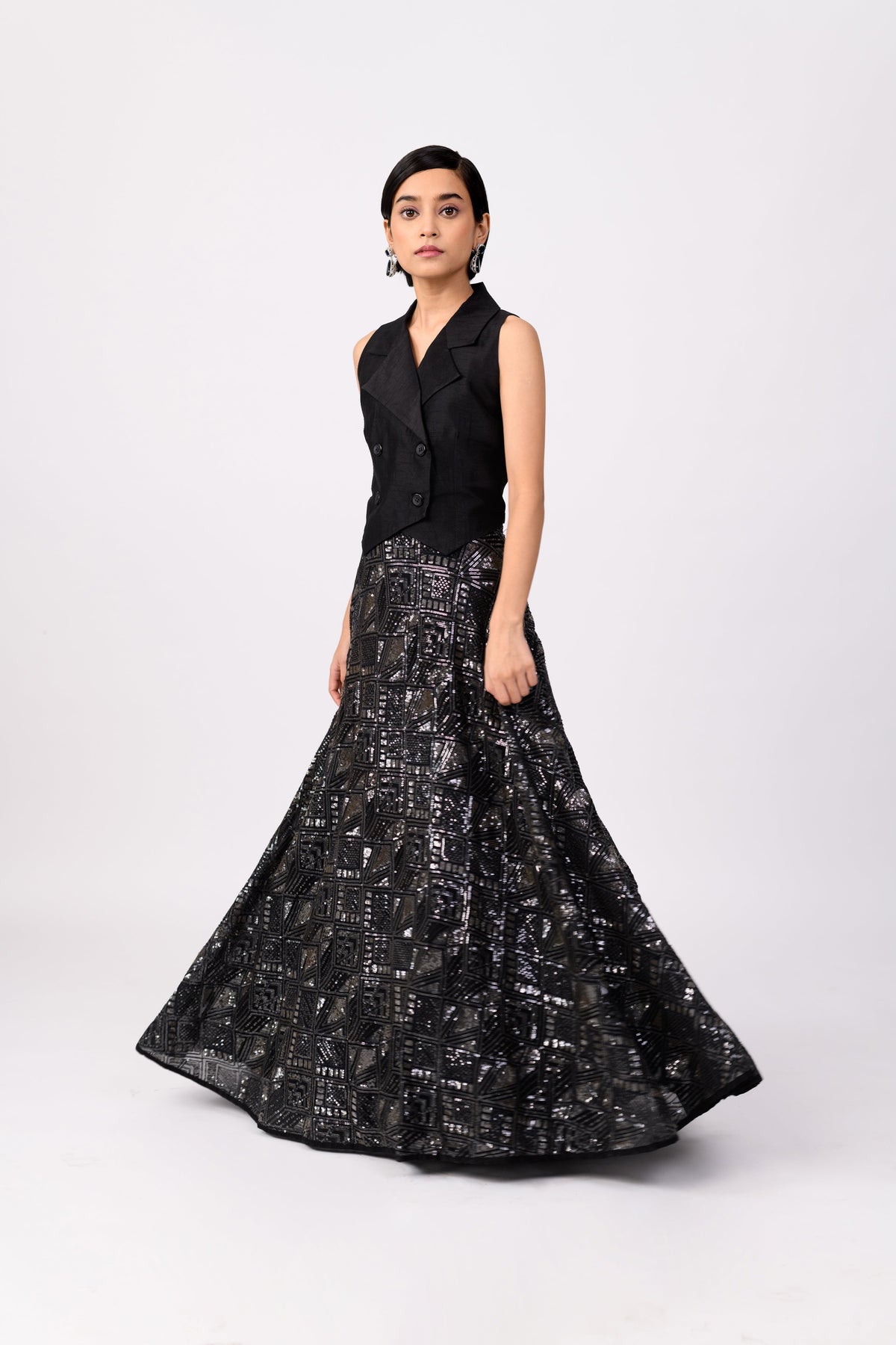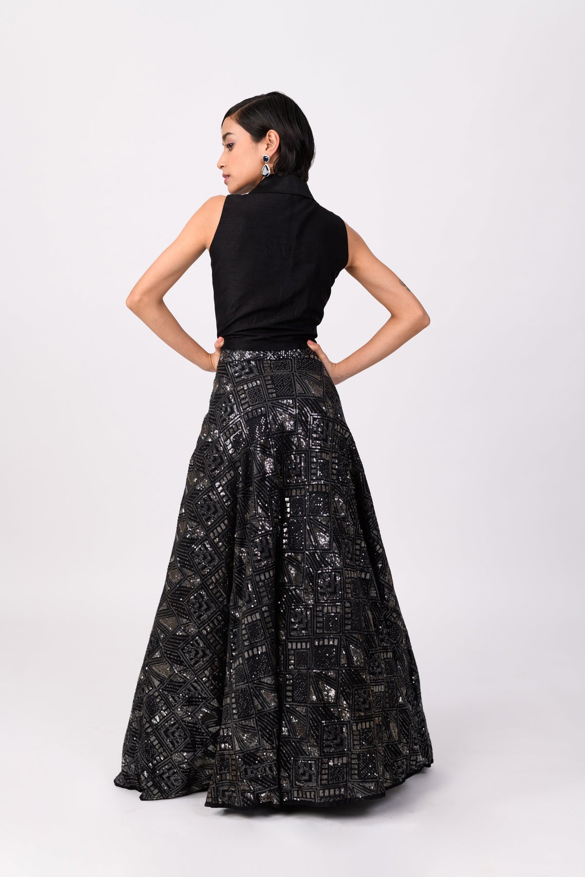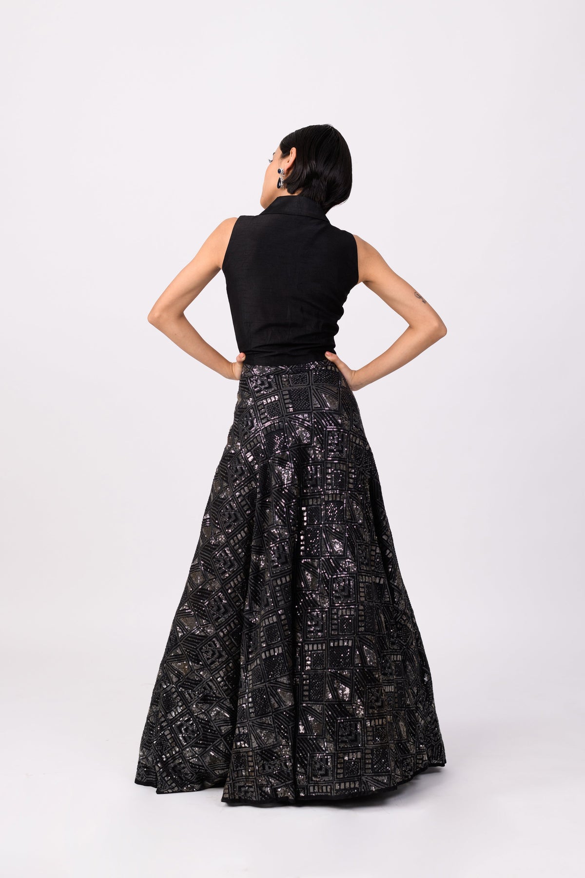 A unique yet classic black lehenga. We purposefully designed the top to be paired in your day-to-day wardrobe!