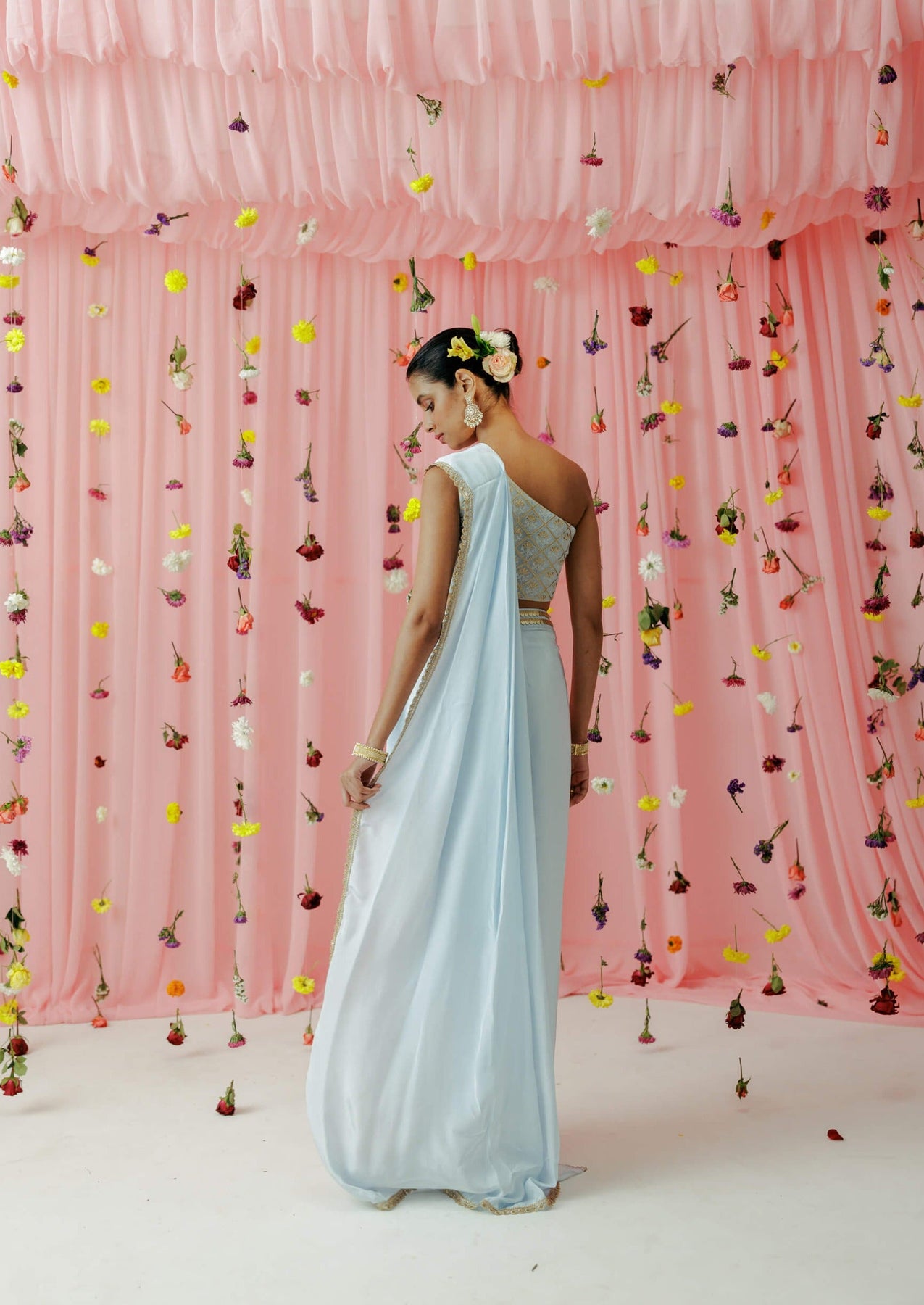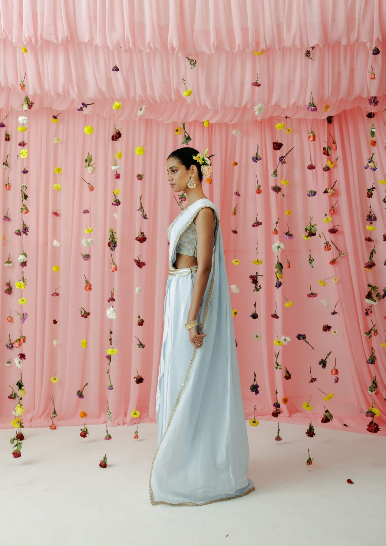 An Aayka special, this dhoti skirt with an attached dupatta is both functional and fashionable. The gold detailing and asymmetrical blouse makes this piece a wedding guest essential. This lightweight crepe fabric provides the sheen of satin but with a richer texture.