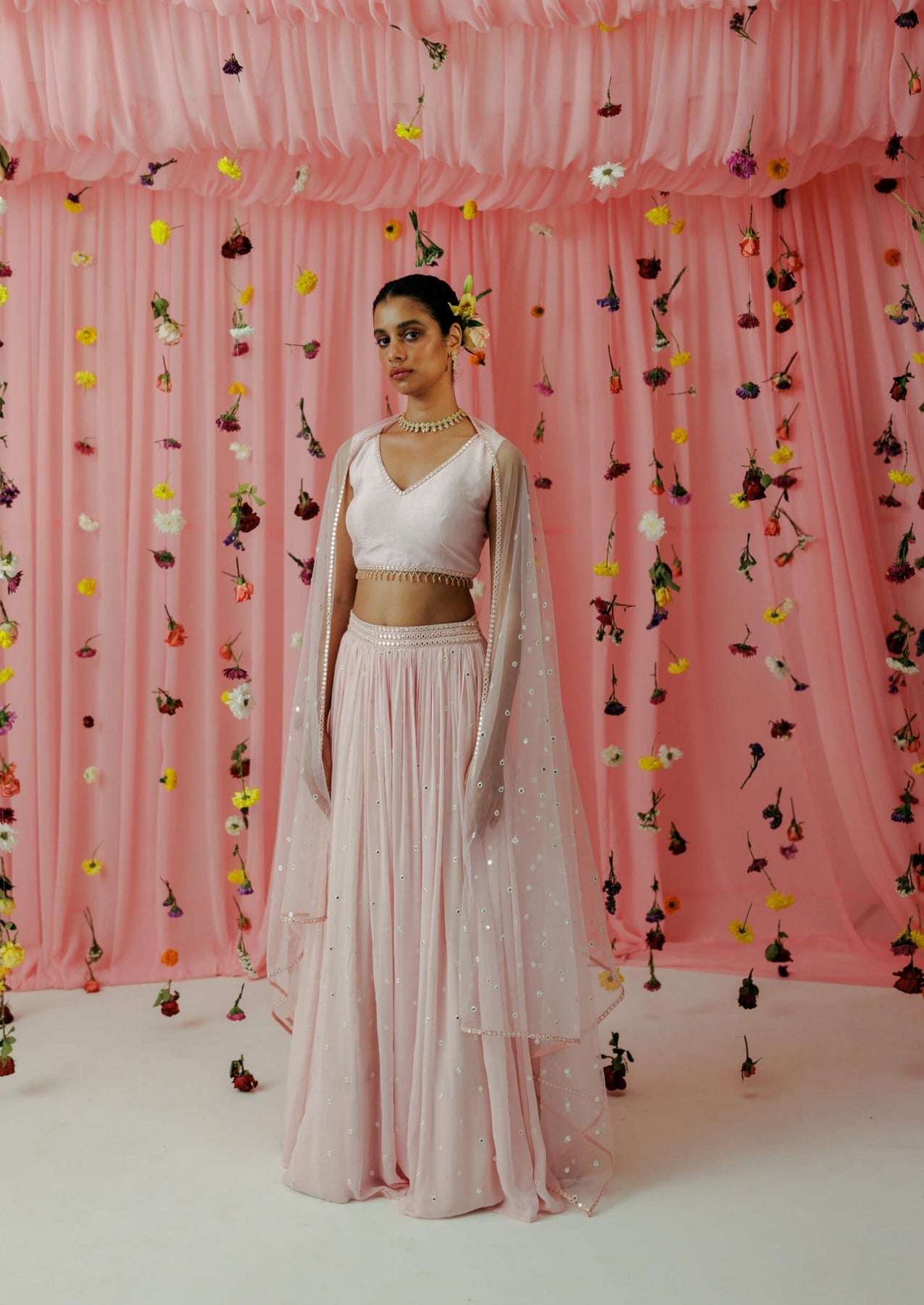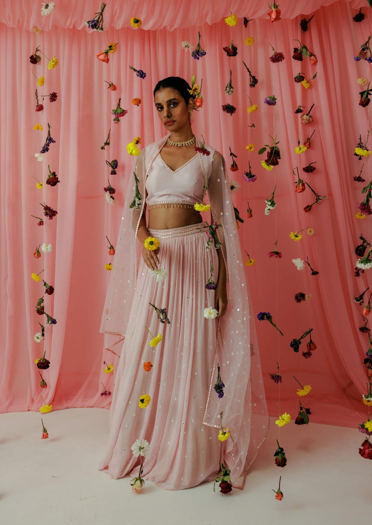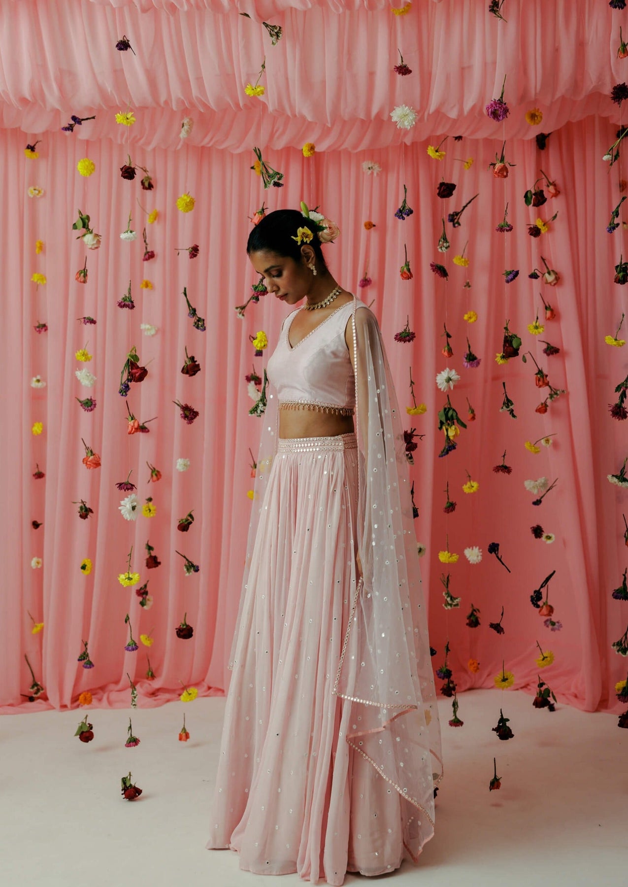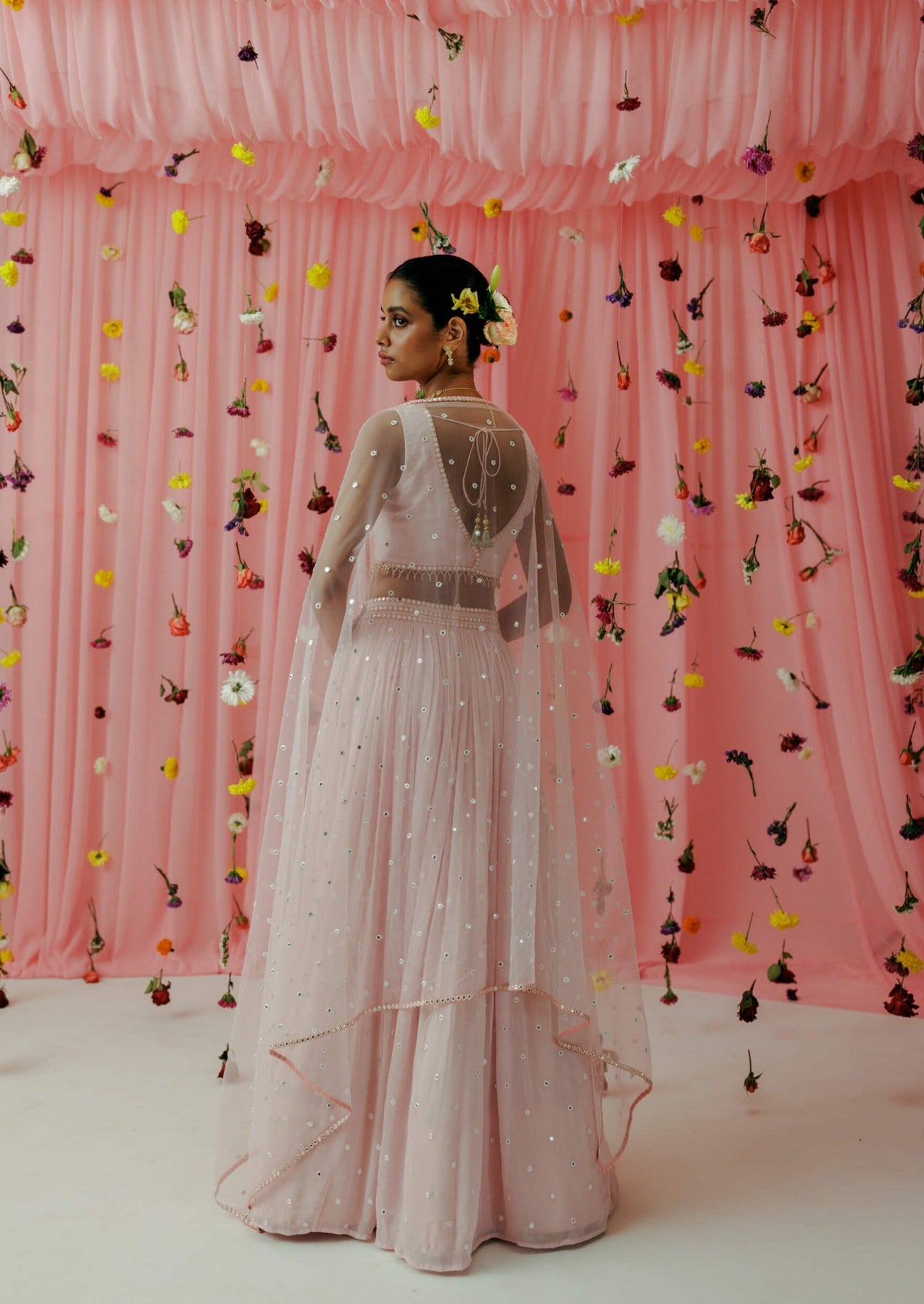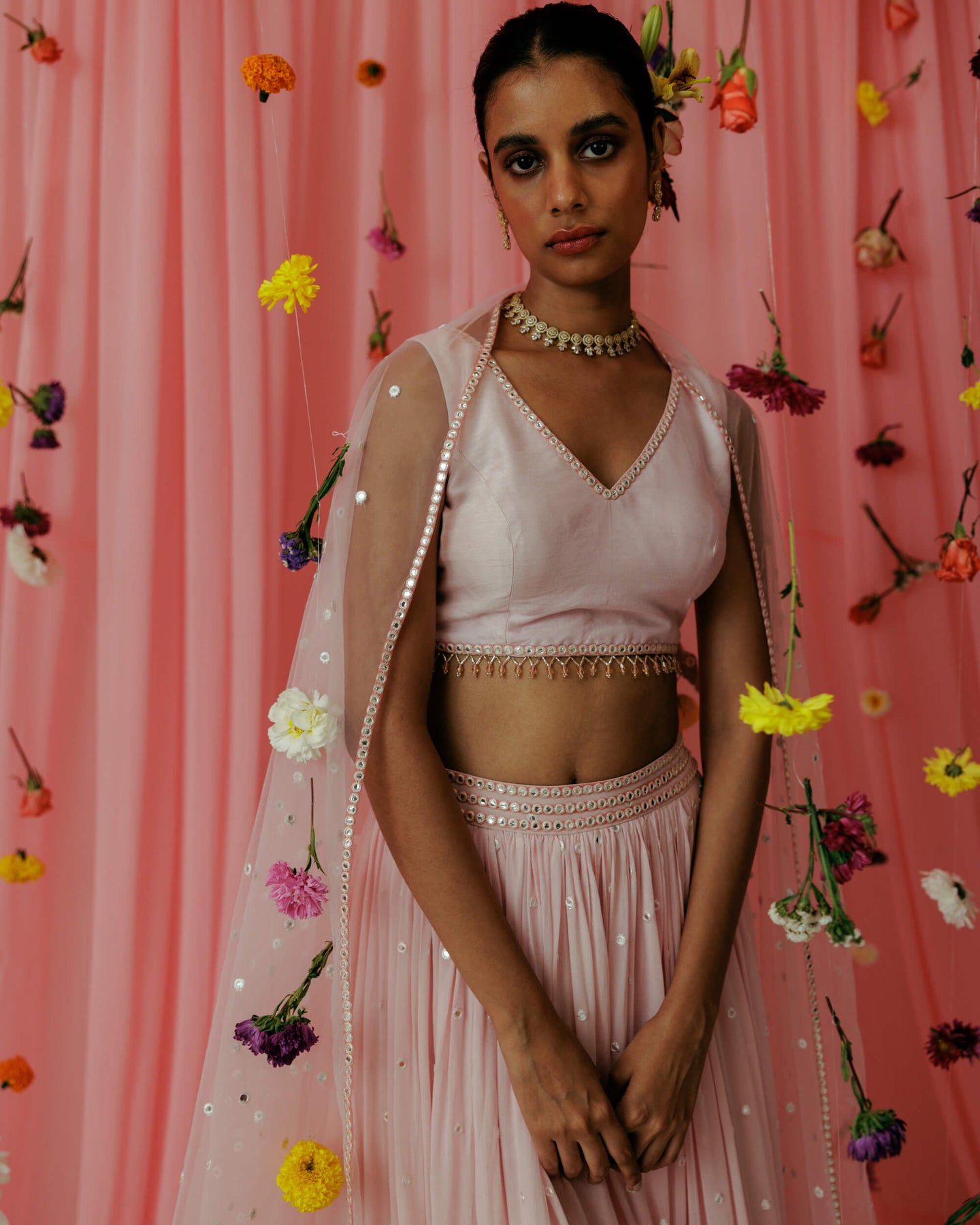 This romantic lehenga is perfect for that European summer wedding. This classic silhouette is enhanced with the beautiful beading and mirror work dupatta.