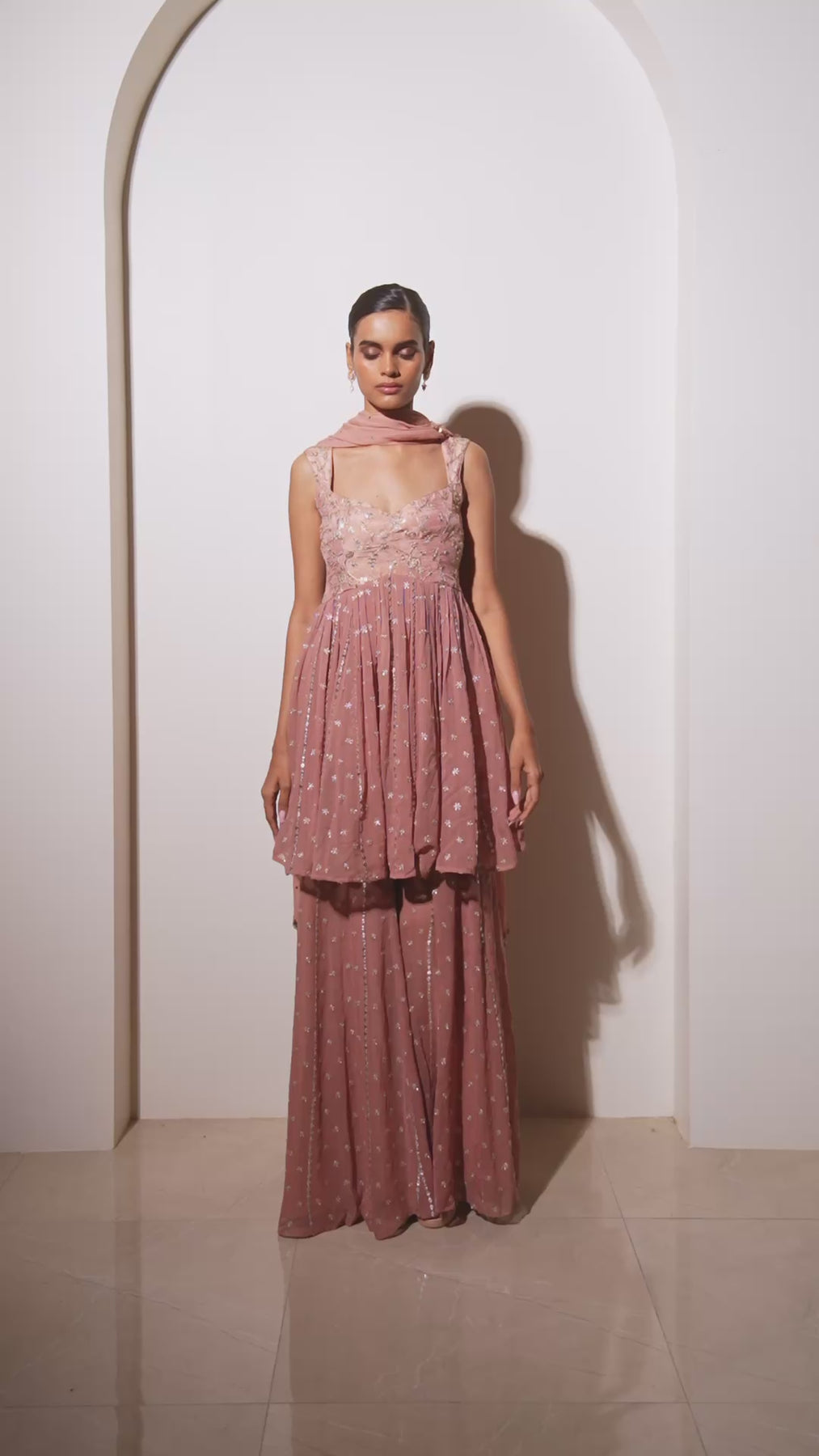 The Raha Sharara Set embodies timeless elegance in a soft nude pink shade, highlighted with gold accents and subtle sequin detailing. The chiffon top features a graceful, flattering drape, while the georgette sharara bottoms are lightweight yet richly detailed with all-over sequins. Finished with a matching georgette dupatta, this ensemble is ideal for weddings, festive gatherings, and formal celebrations where refined simplicity speaks volumes.
