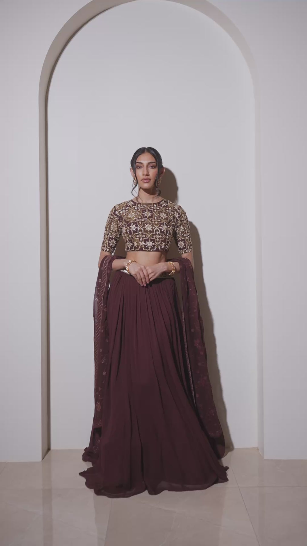 Made from rich mocha-toned tissue fabric, the Rakhee Lehenga is adorned with exquisite golden handwork that adds a refined, festive touch. Its elegant structure and understated shimmer make it a perfect pick for weddings, receptions, and other special celebrations.