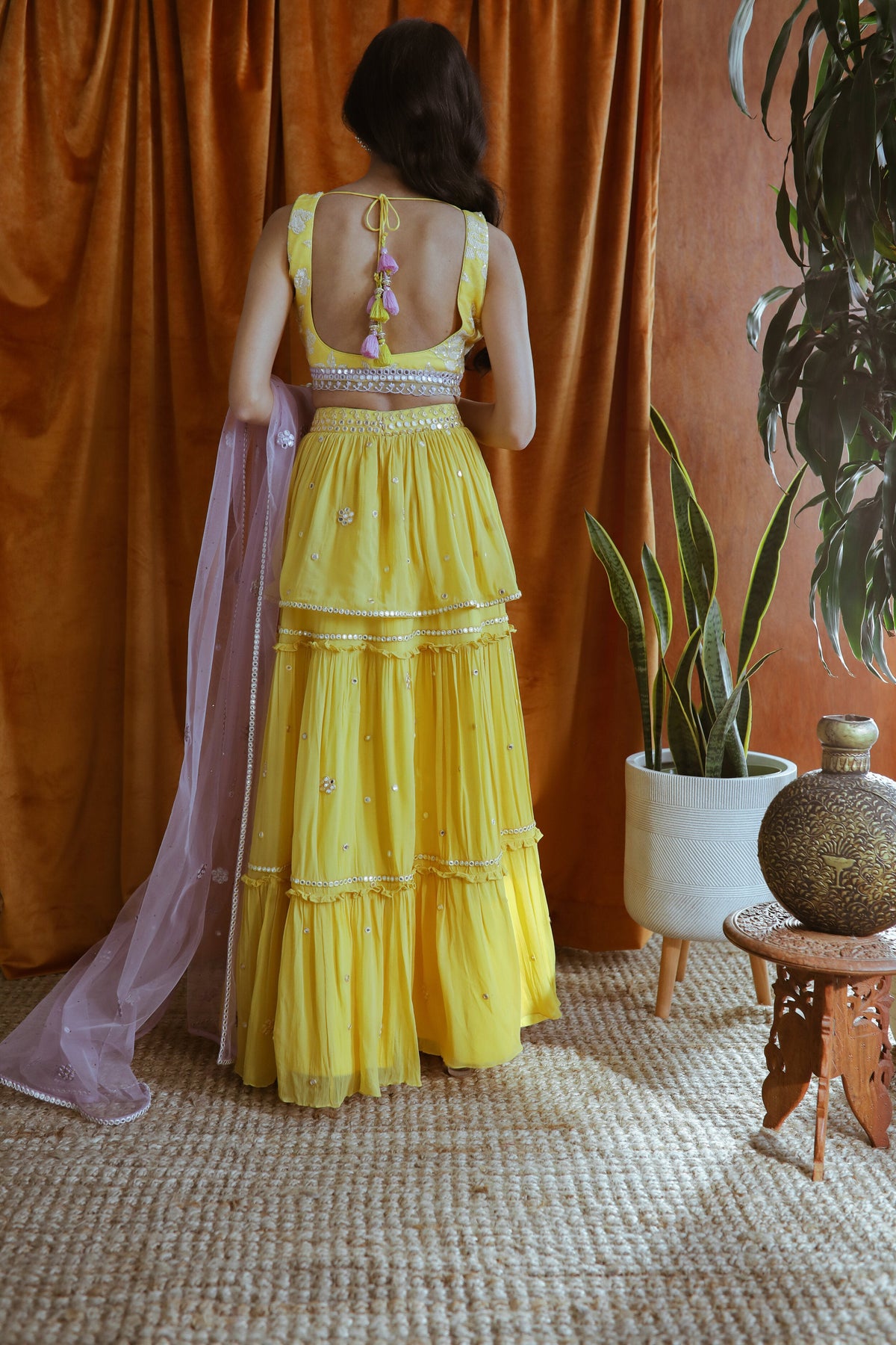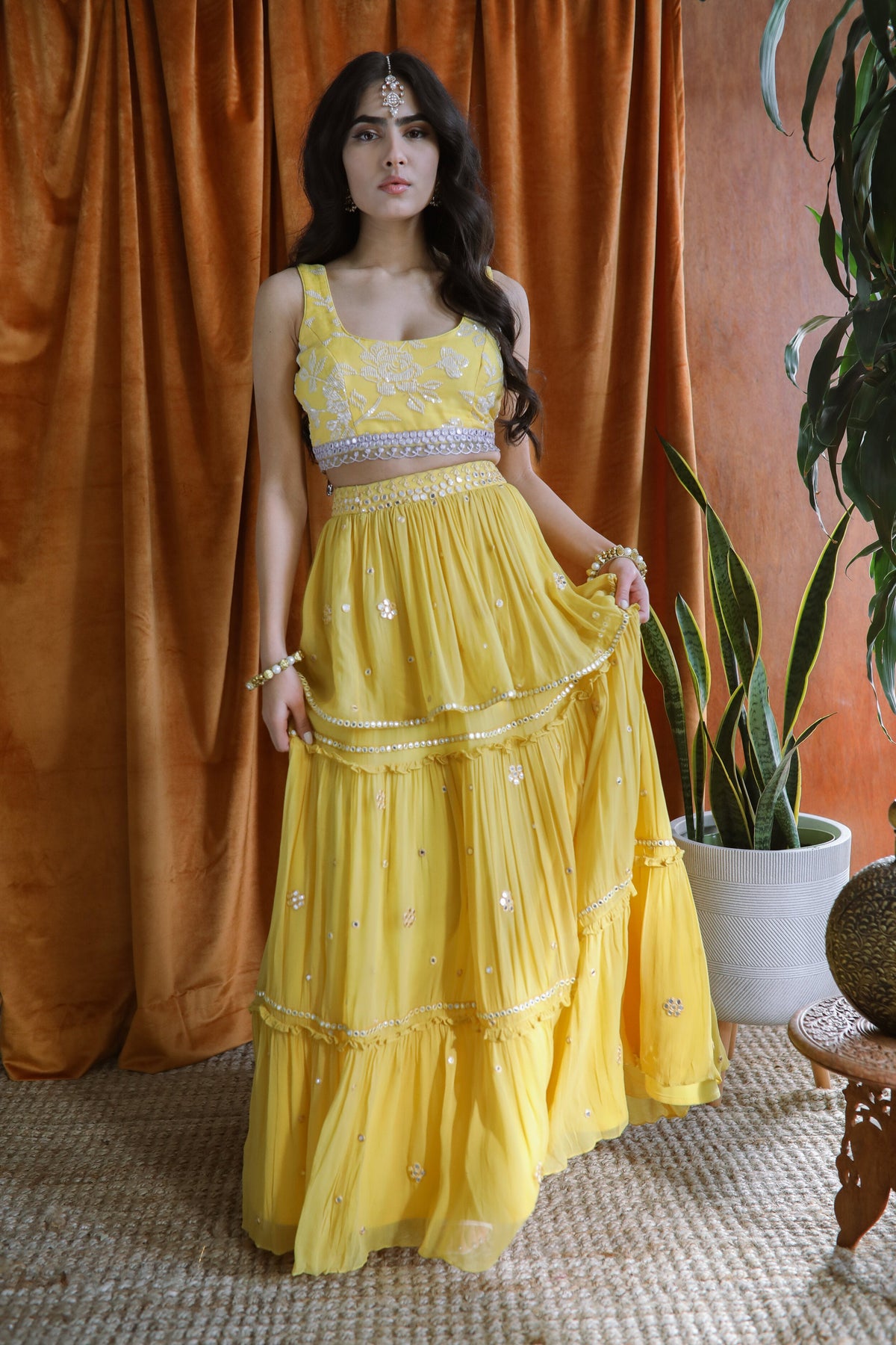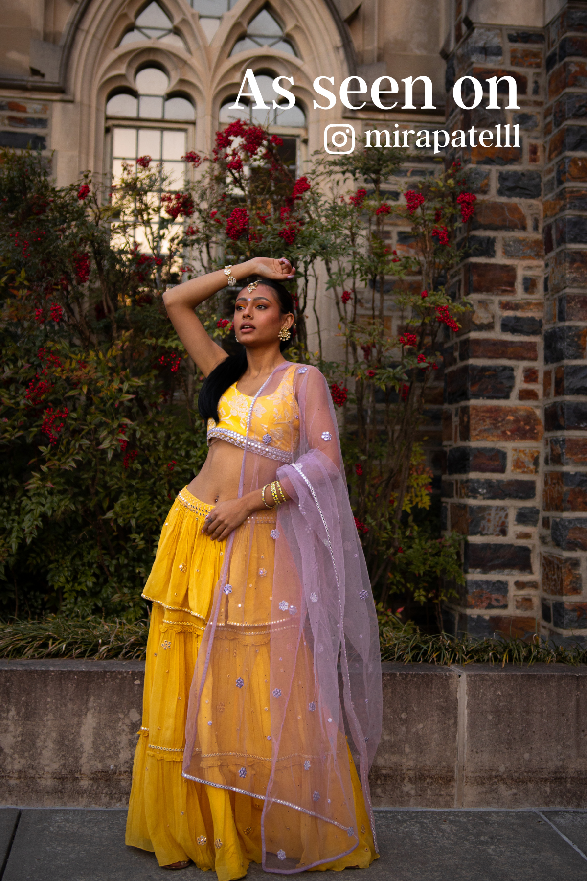 Make an entrance this Wedding Season with our Anita Lehenga. This yellow mirrorwork lehenga is an exquisite outfit for any event. Handwork and dupatta can be included at an additional cost.