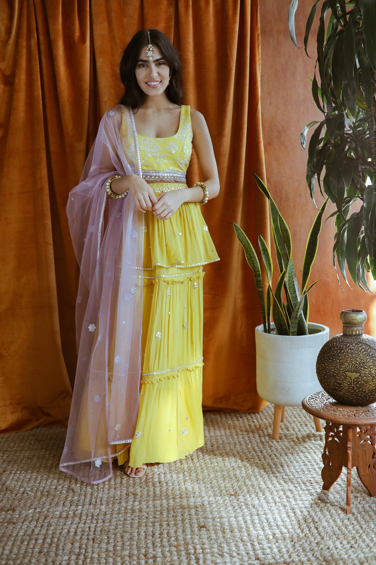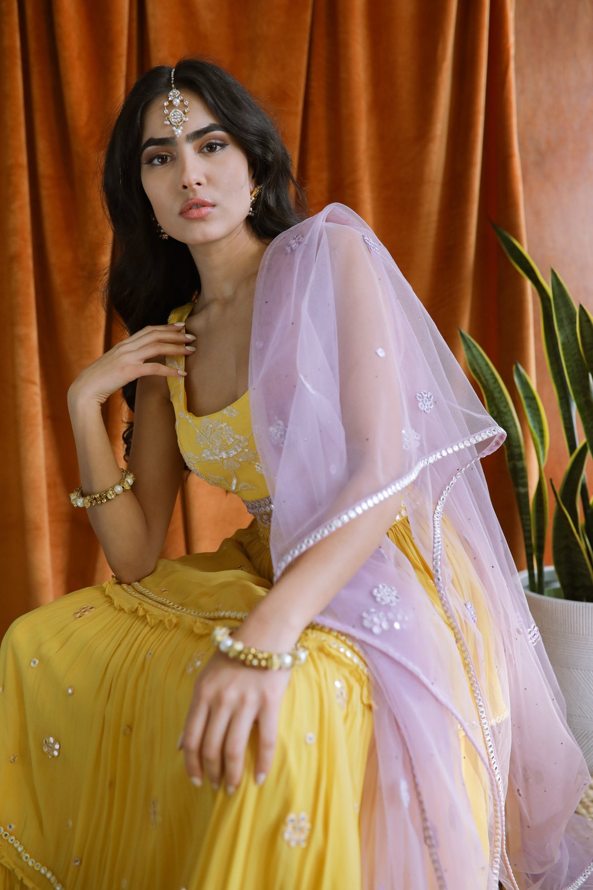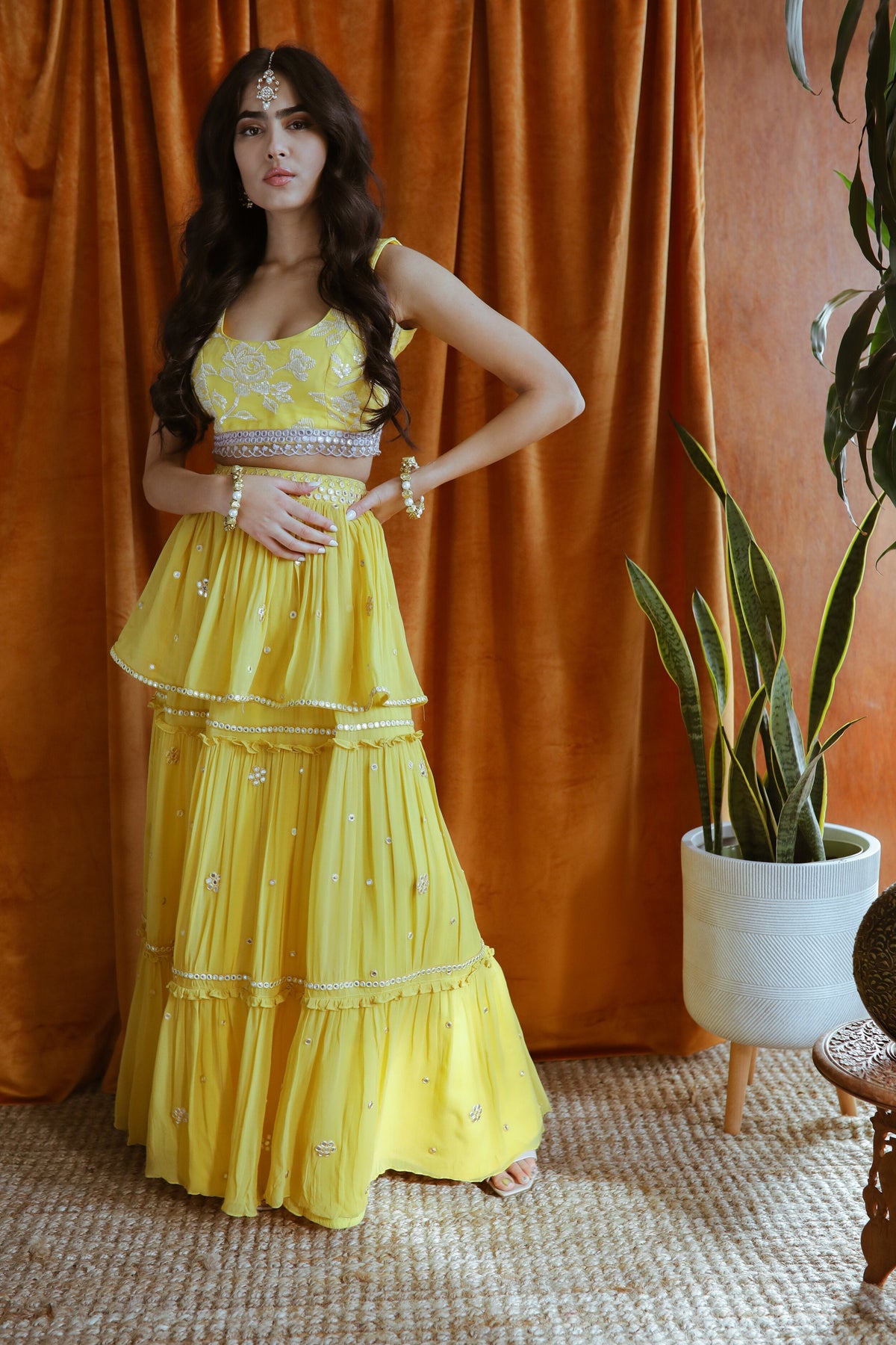 Make an entrance this Wedding Season with our Anita Lehenga. This yellow mirrorwork lehenga is an exquisite outfit for any event. Handwork and dupatta can be included at an additional cost.