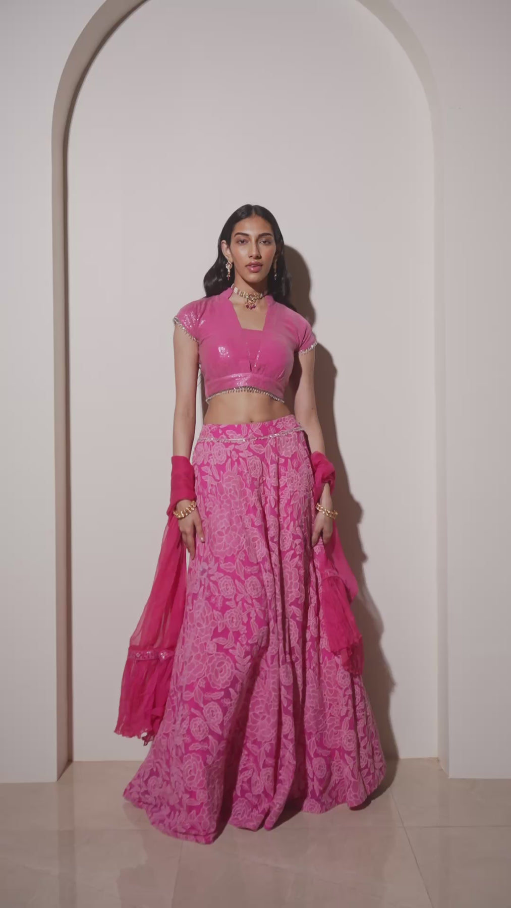 In a soft pink hue, the Gulab Lehenga features a graceful georgette skirt with delicate thread work, paired with a shimmering sequin blouse that adds subtle sparkle. Finished with a lightweight chiffon dupatta, the ensemble strikes the perfect balance between charm and elegance—ideal for daytime celebrations and pre-wedding events.