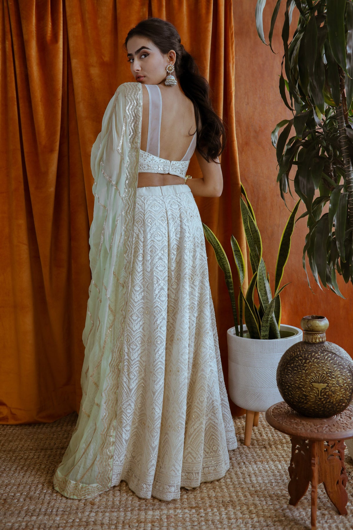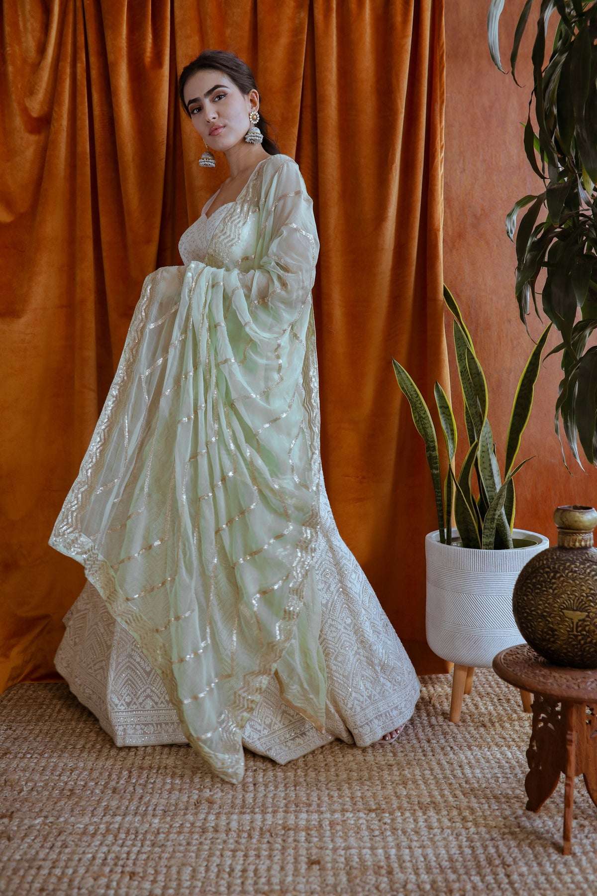 The Kiran is a lavish lehenga for any soirée. This net blouse lucknowi lehenga is paired with a heavily embroided georgette dupatta with sequins.