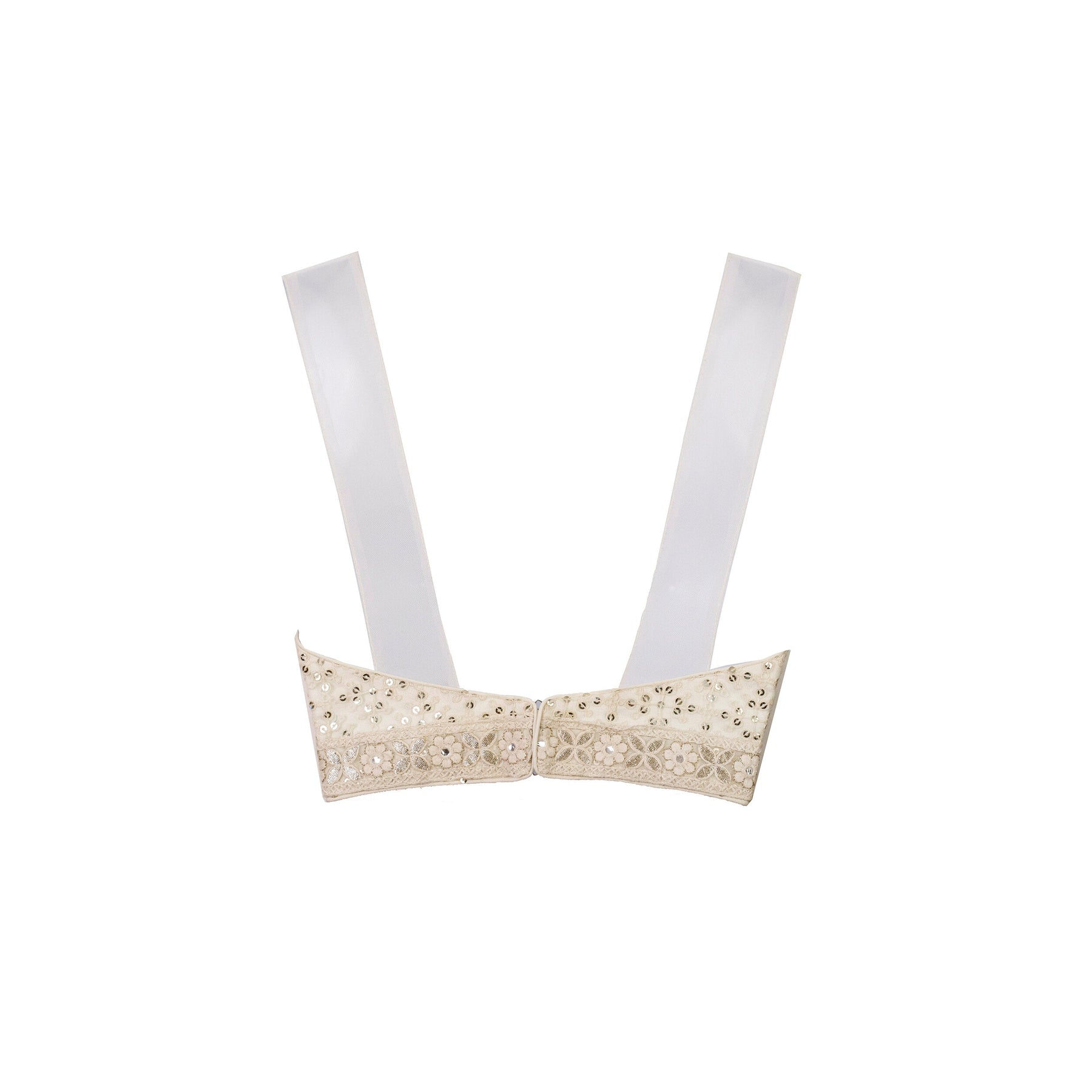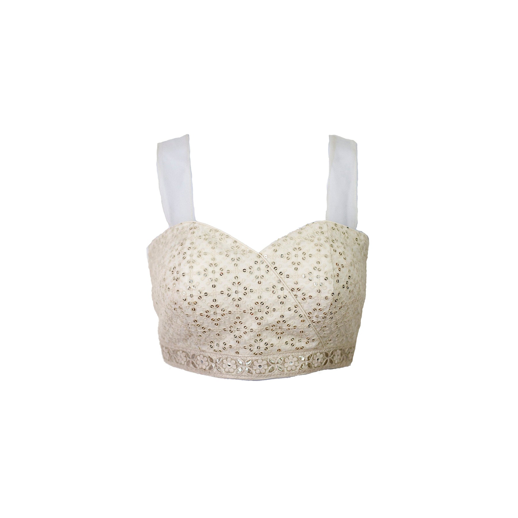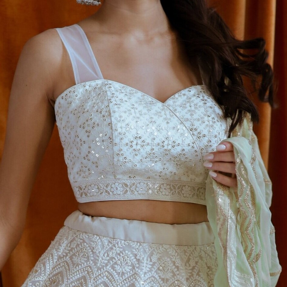 This white embroidered blouse is a must-have staple for any closet. Pair it with your favorite lehenga, sari, or even pair of fitted jeans for an easy and glamorous look! This blouse is made to measure, so please provide us with your accurate measurements to ensure a good fit.