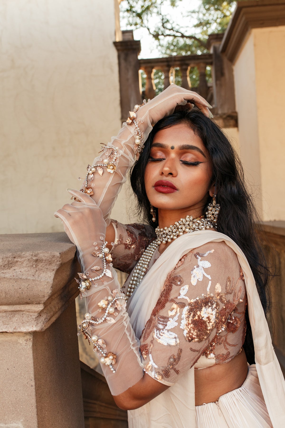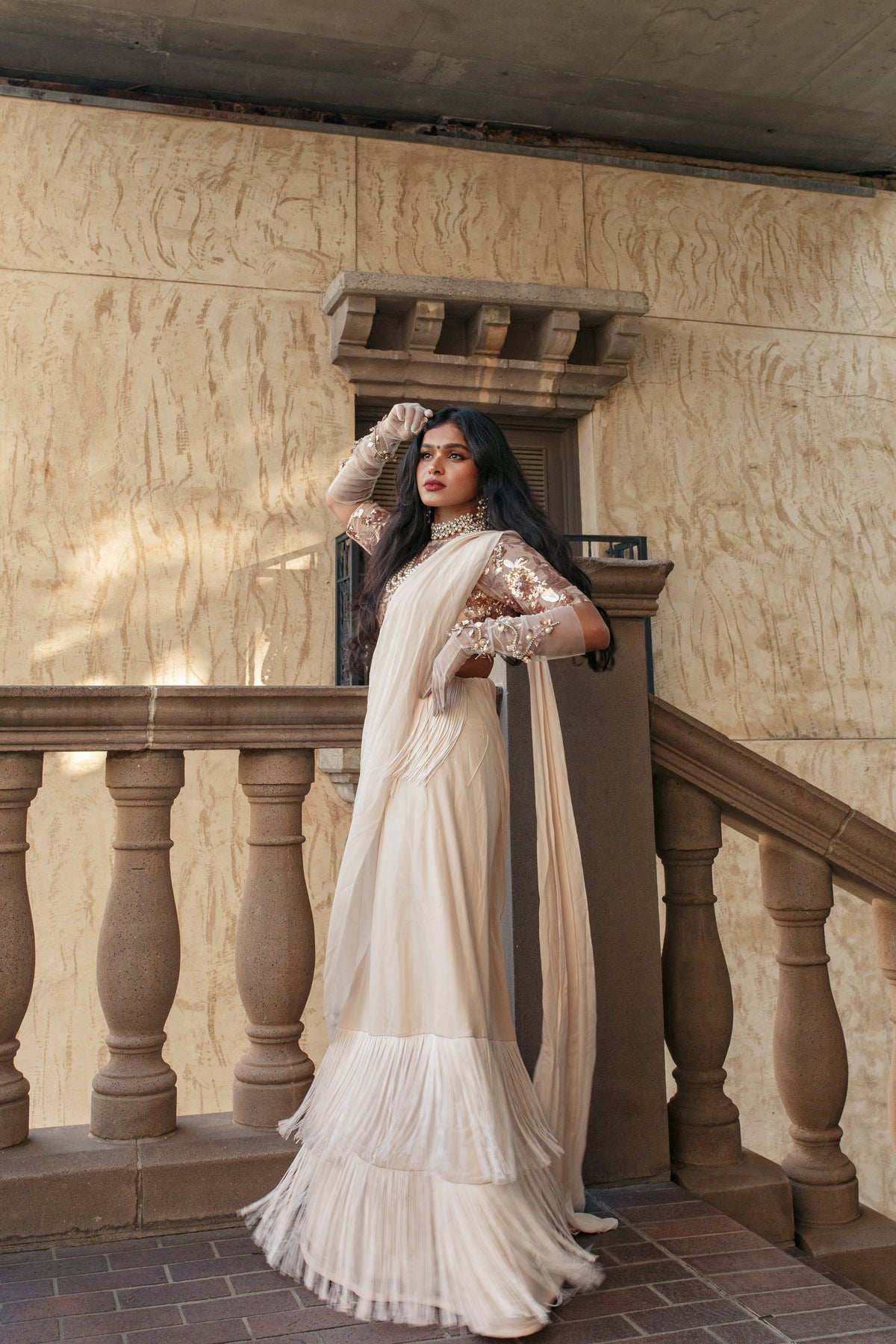 A regal fringe sari with a stunning embroidered sequin blouse