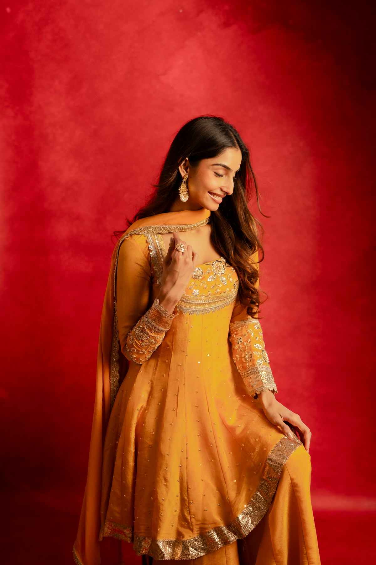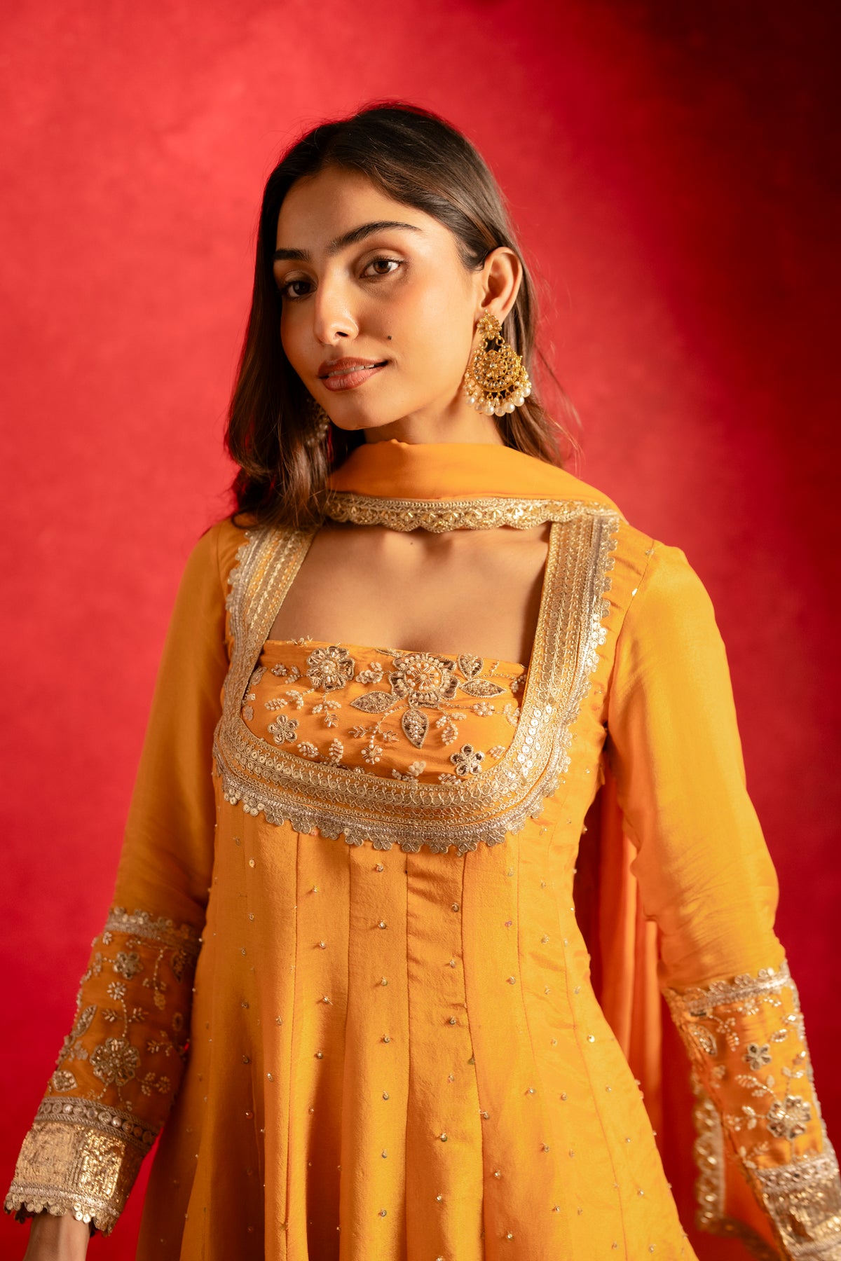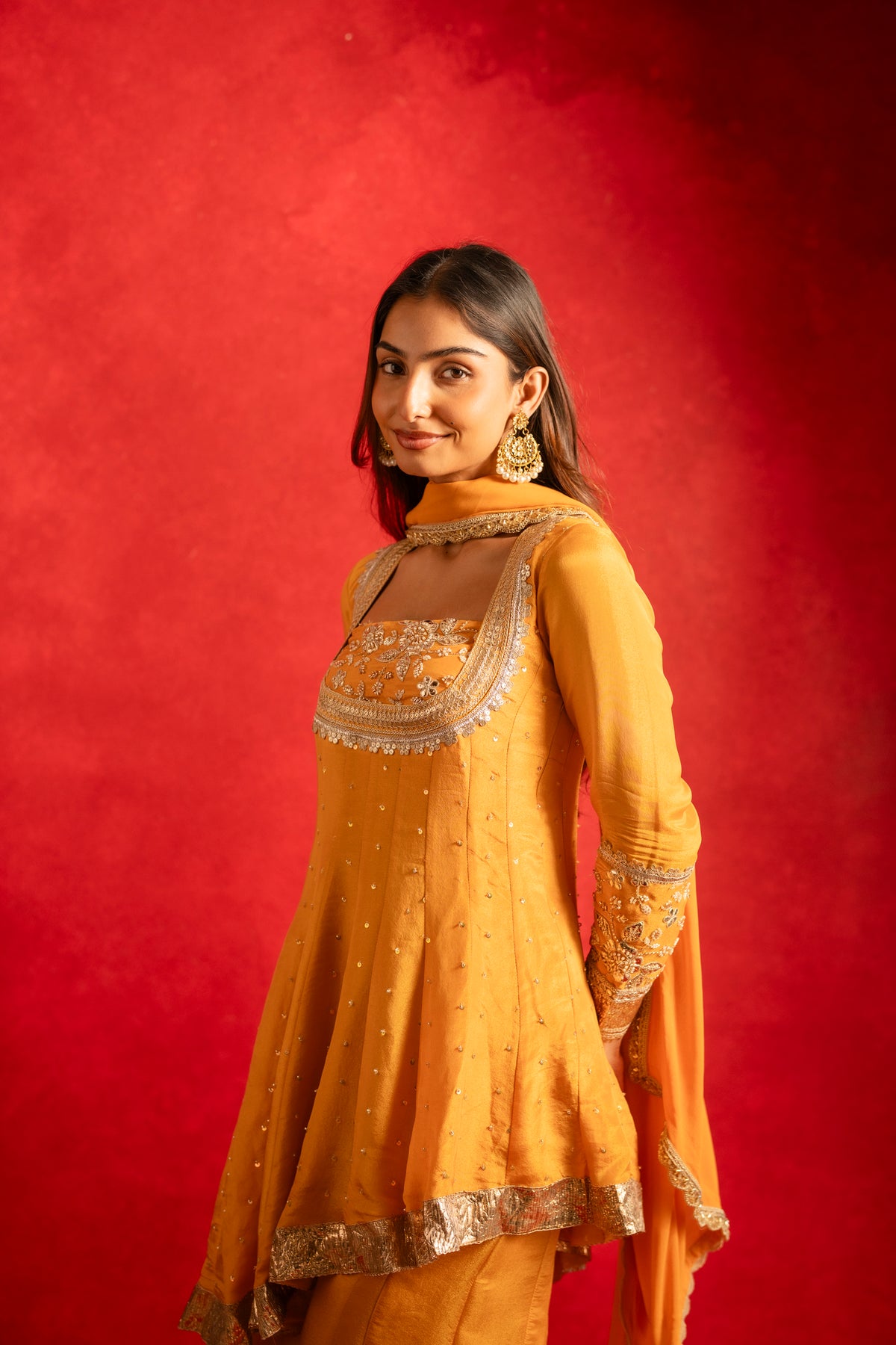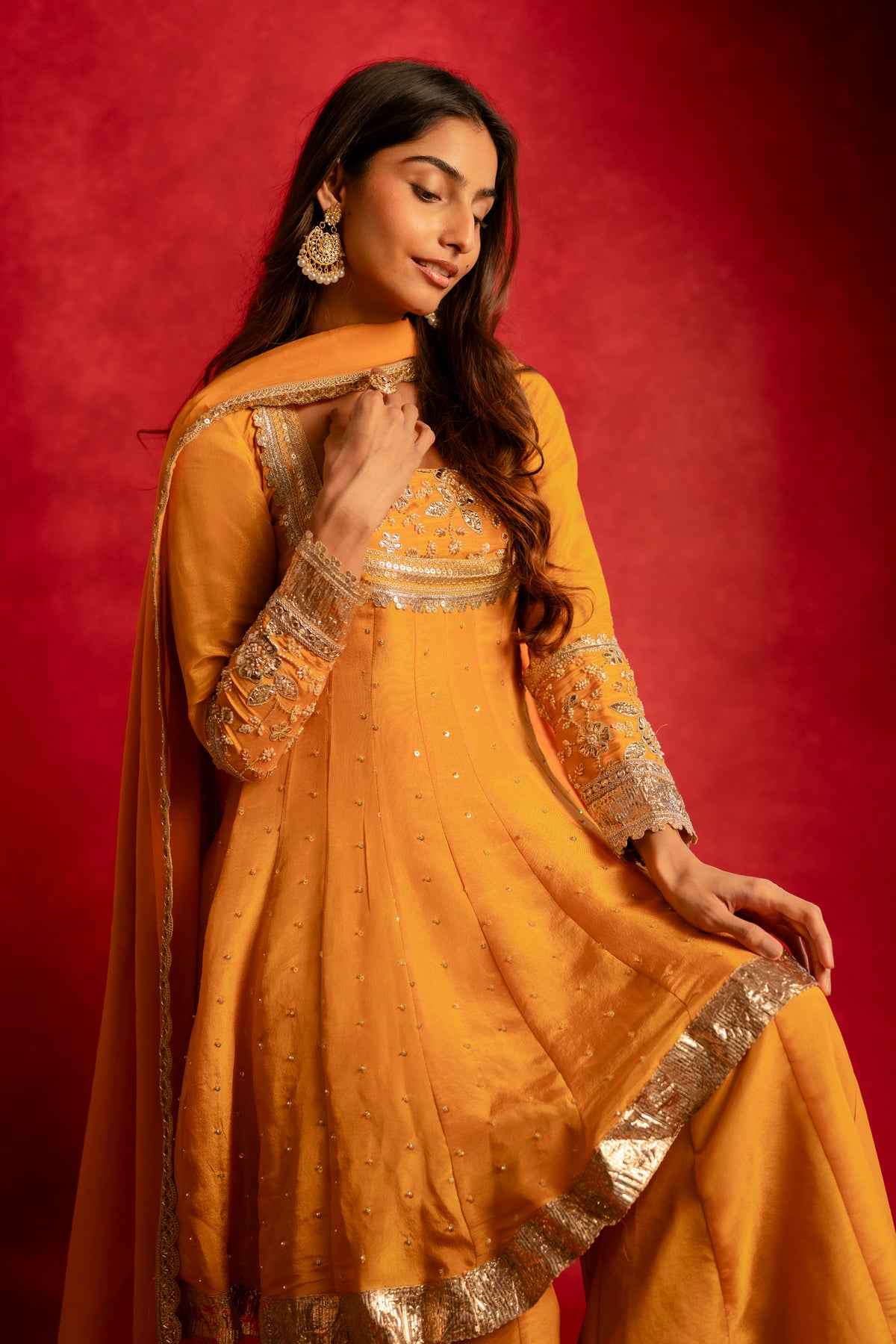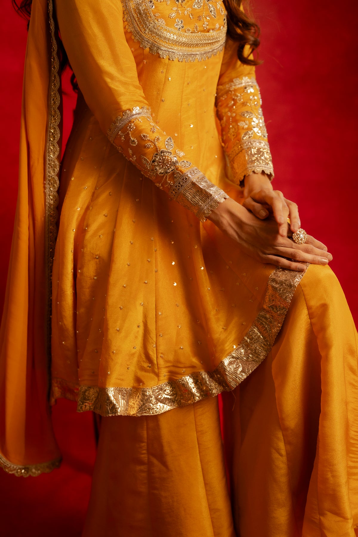 The Diya Sharara Set comes in a radiant shade of bright yellow, featuring a structured bustier paired with flared sharara pants and a high-low silk organza top. Flowing silhouettes are elevated with delicate pearl and sequin embroidery, making it a perfect choice for haldi ceremonies, festive celebrations, and joyful wedding moments.