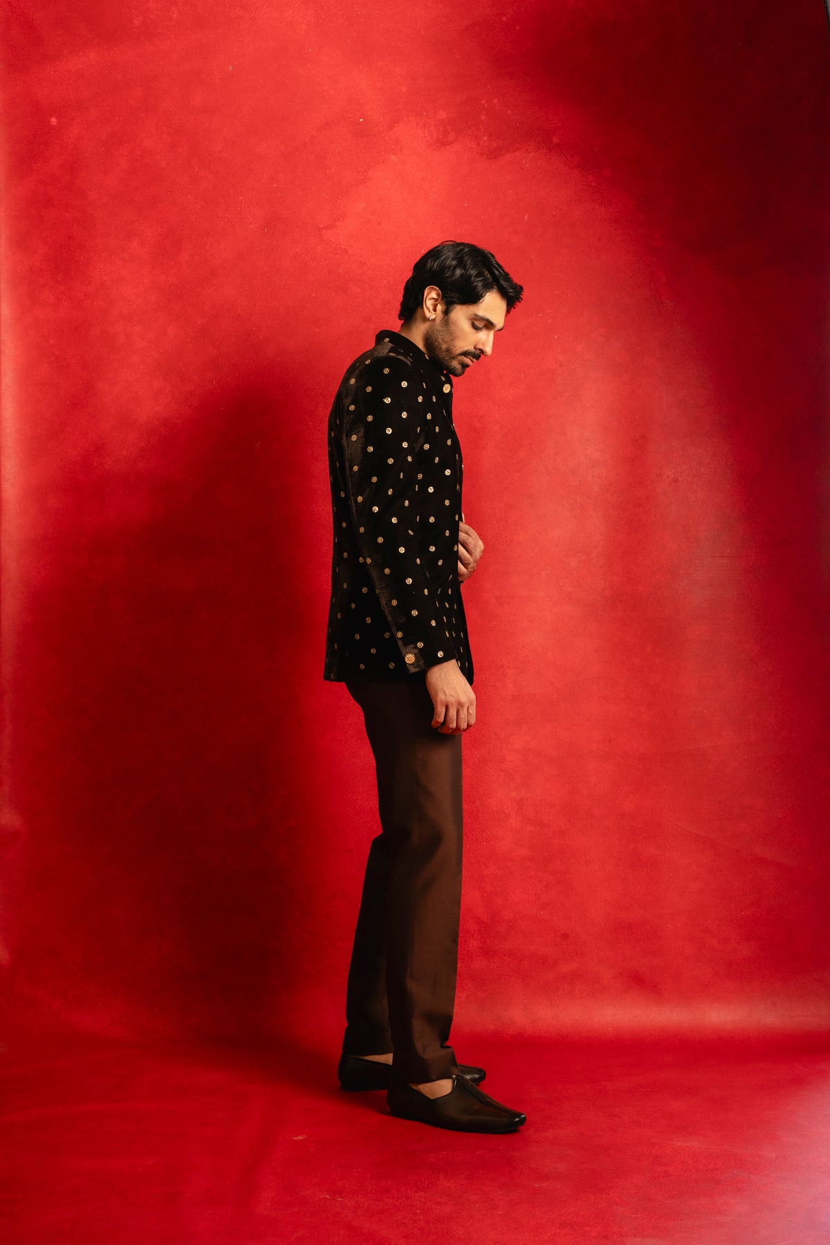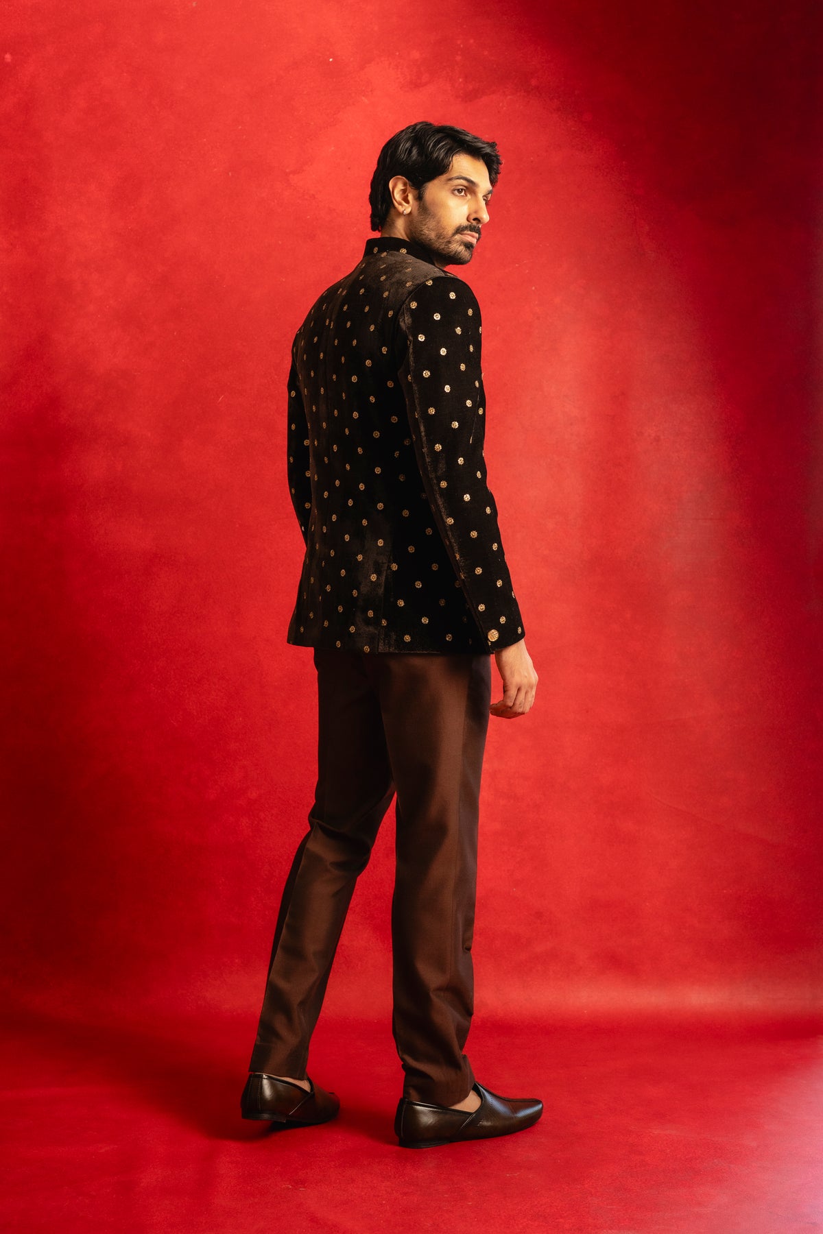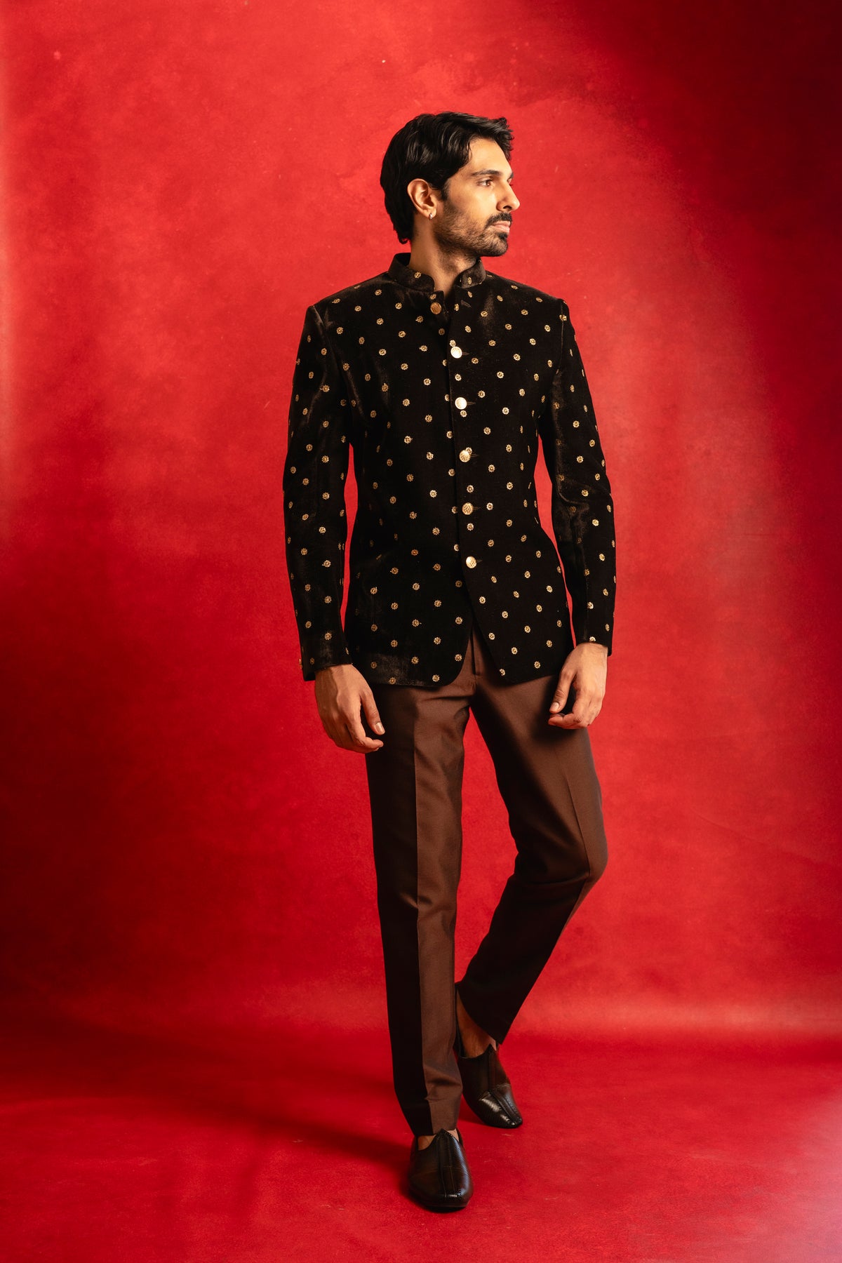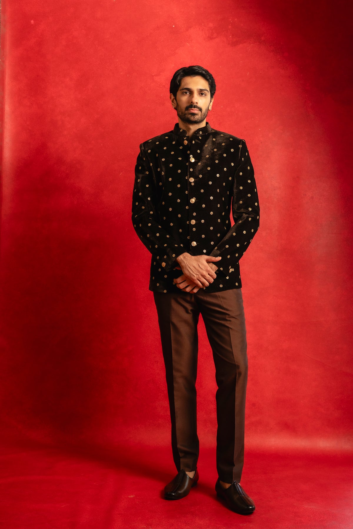 This deep blue velvet sherwani named after Sufi's family name is an elegant classic for your wardrobe. Style it with a contrasting white pant or go monochrome with a matching blue pant. Either way you'll be sure to stun ;)