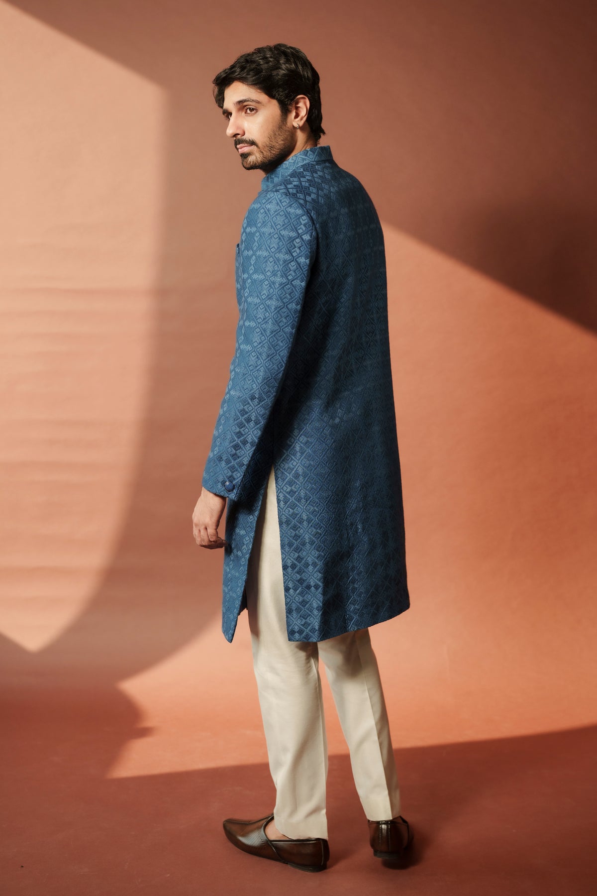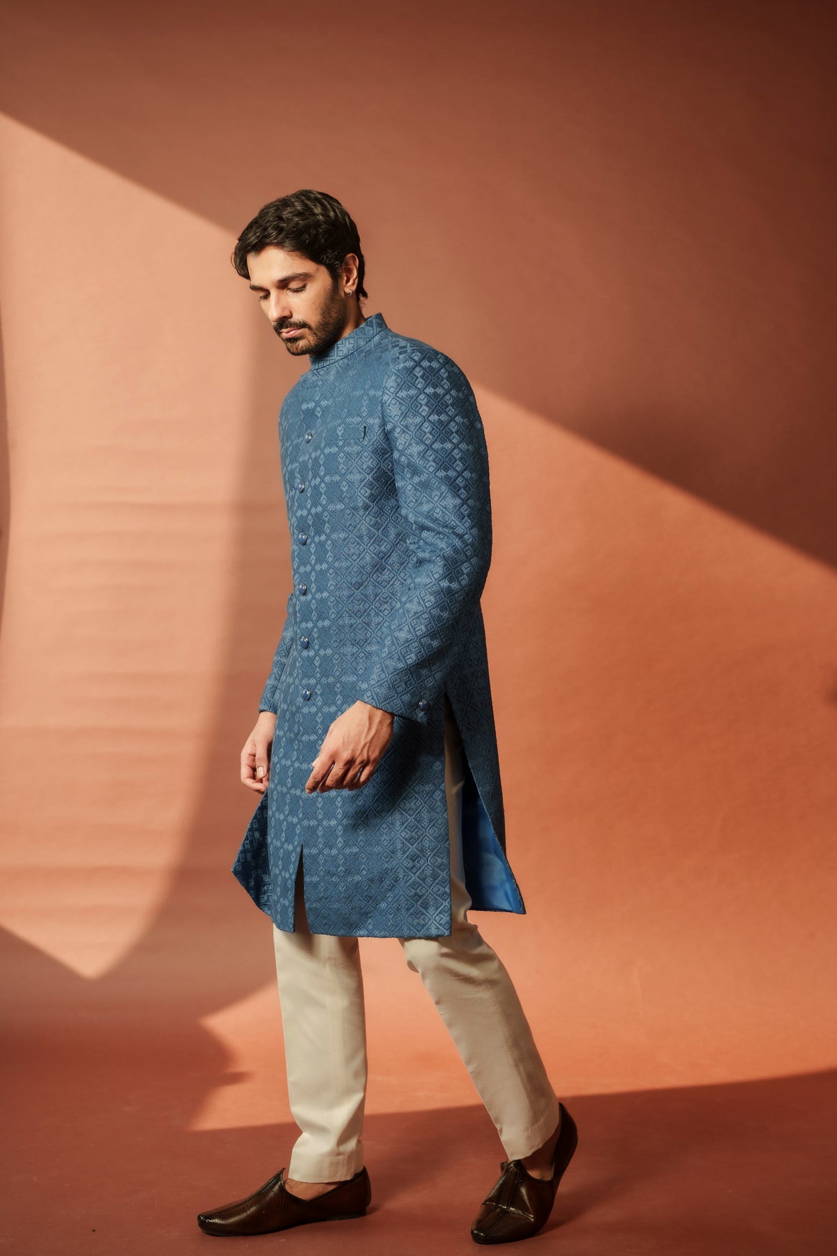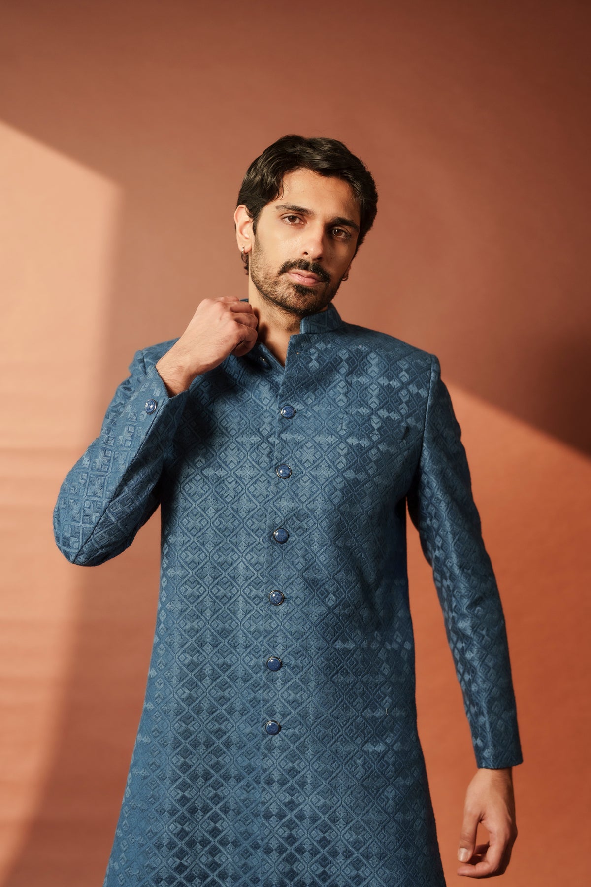 The Nasir Sherwani features rich navy blue silk adorned with geometric thread patterns, combining timeless craftsmanship with modern elegance. Designed for the groom, this sophisticated ensemble is perfect for sangeet nights and wedding day celebrations.