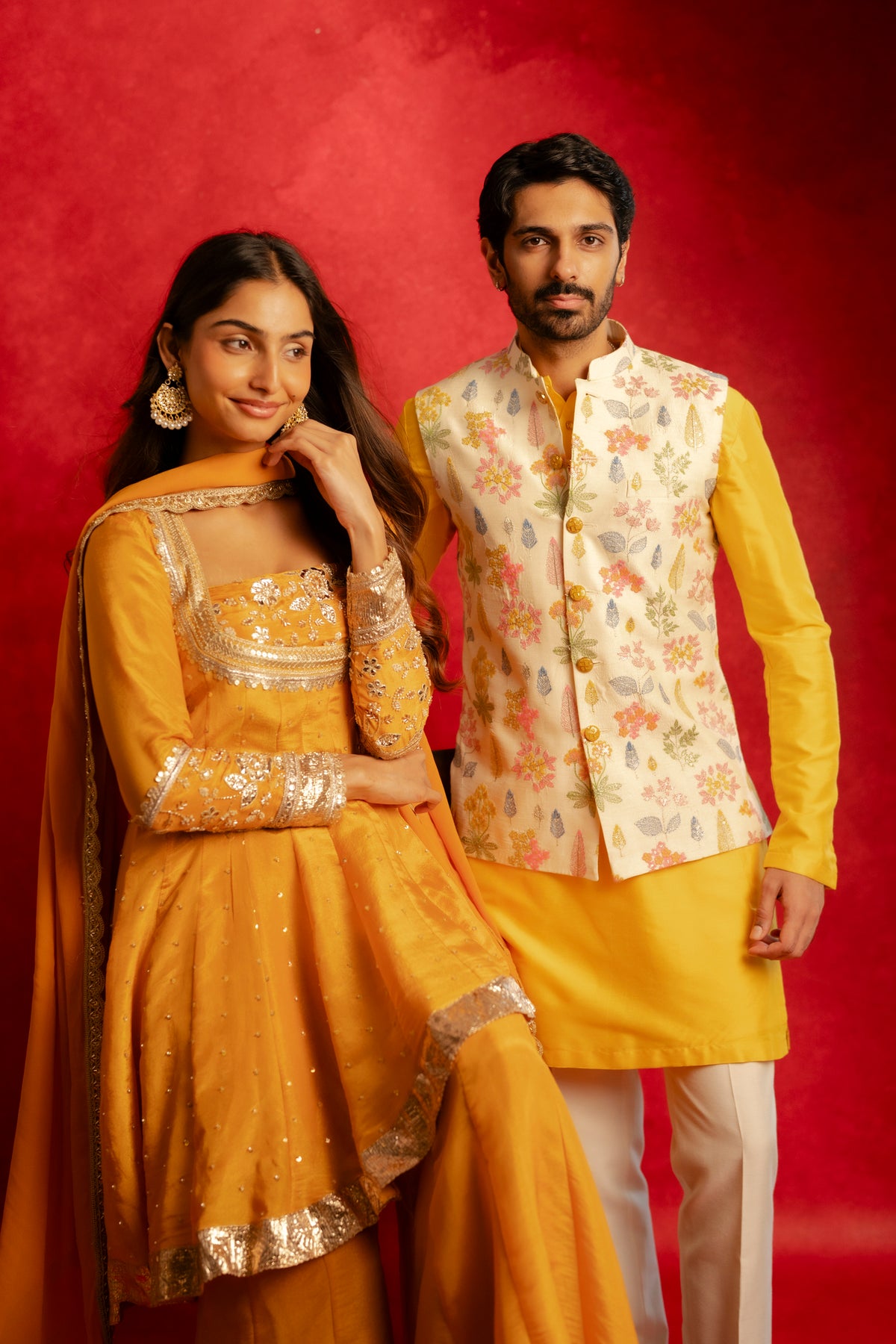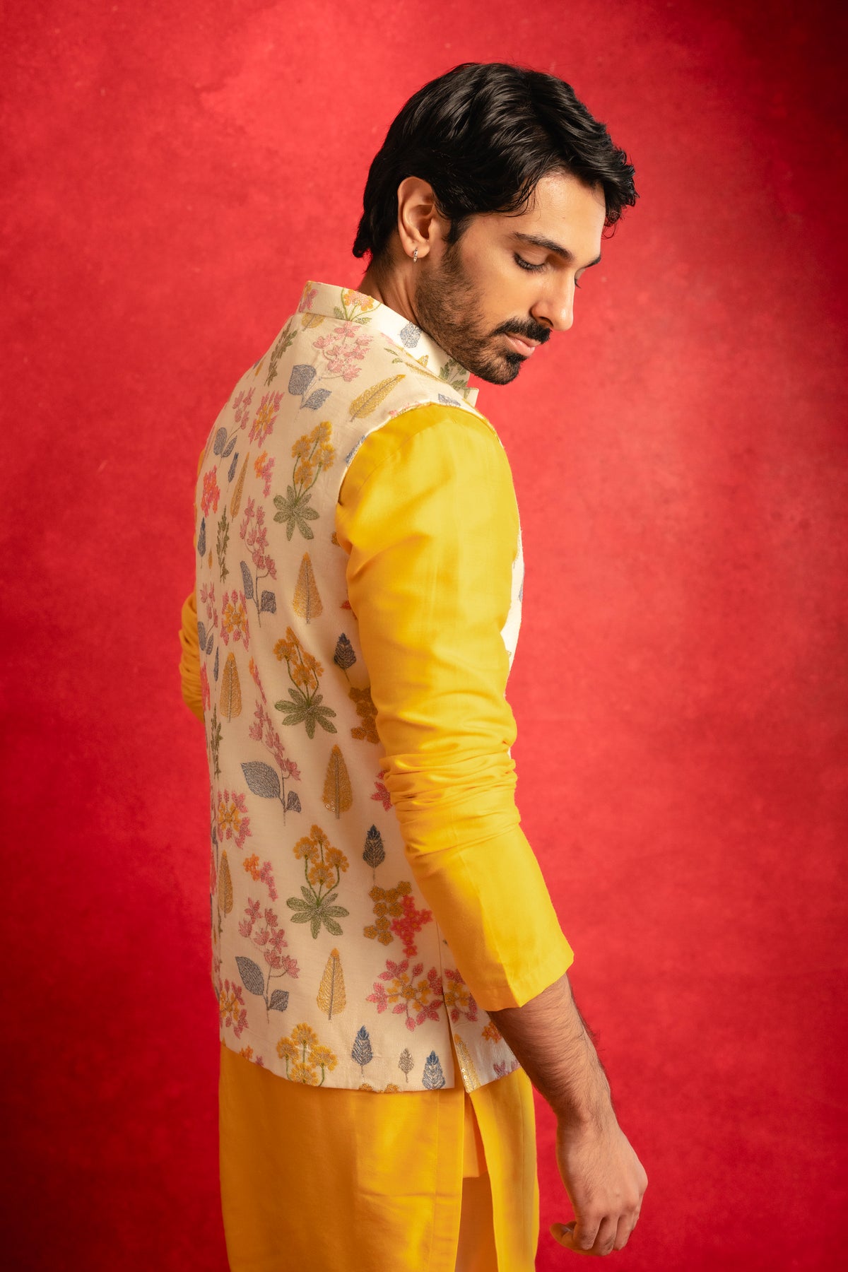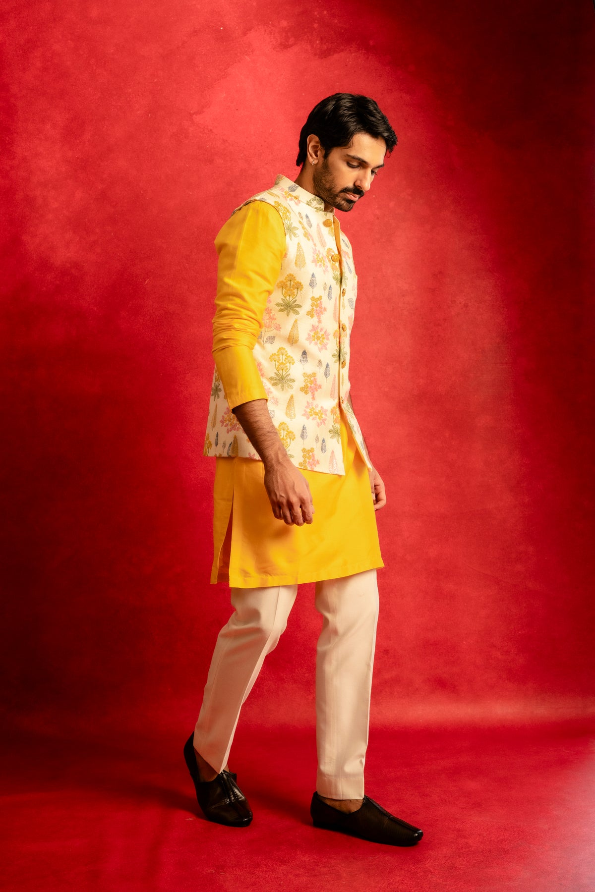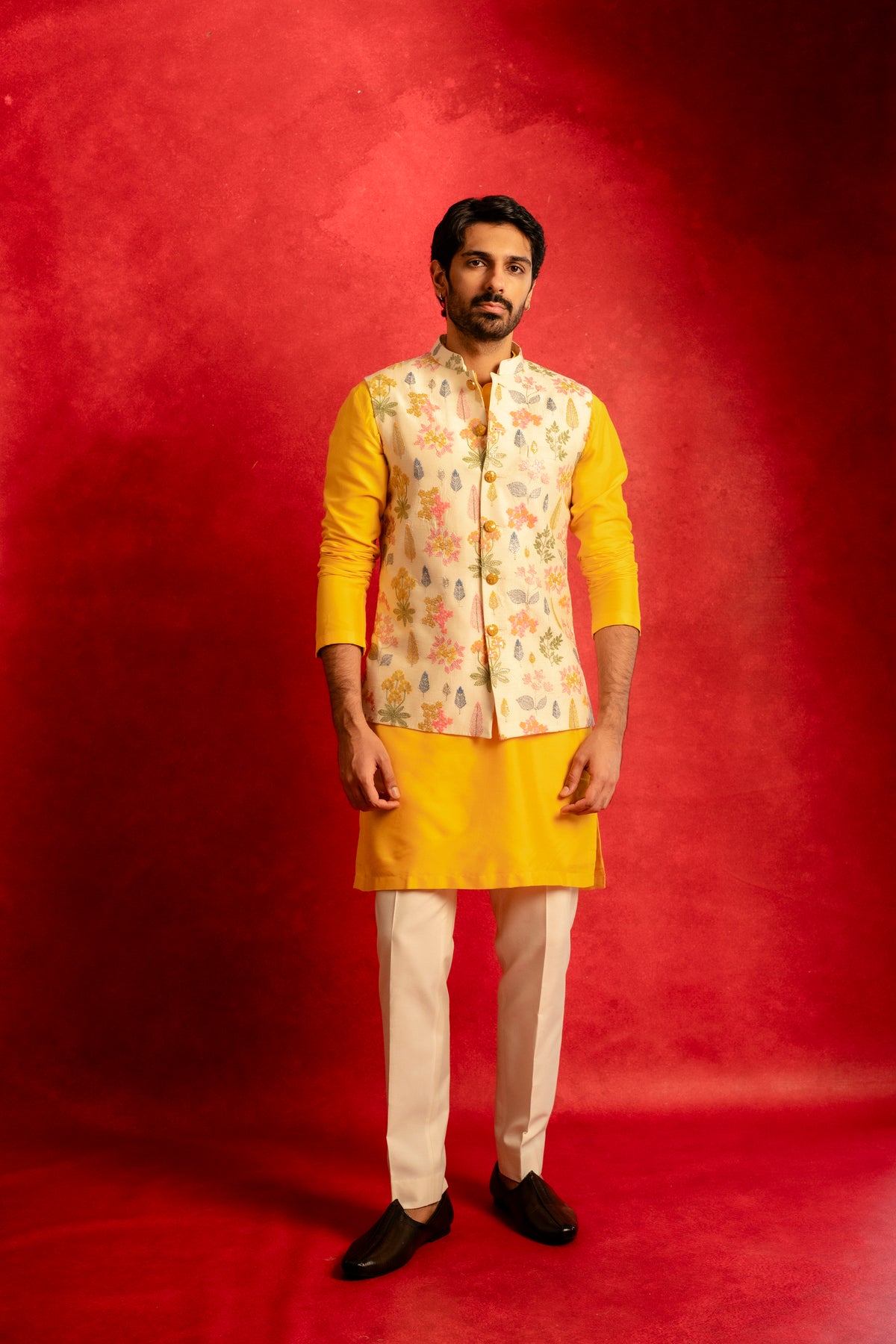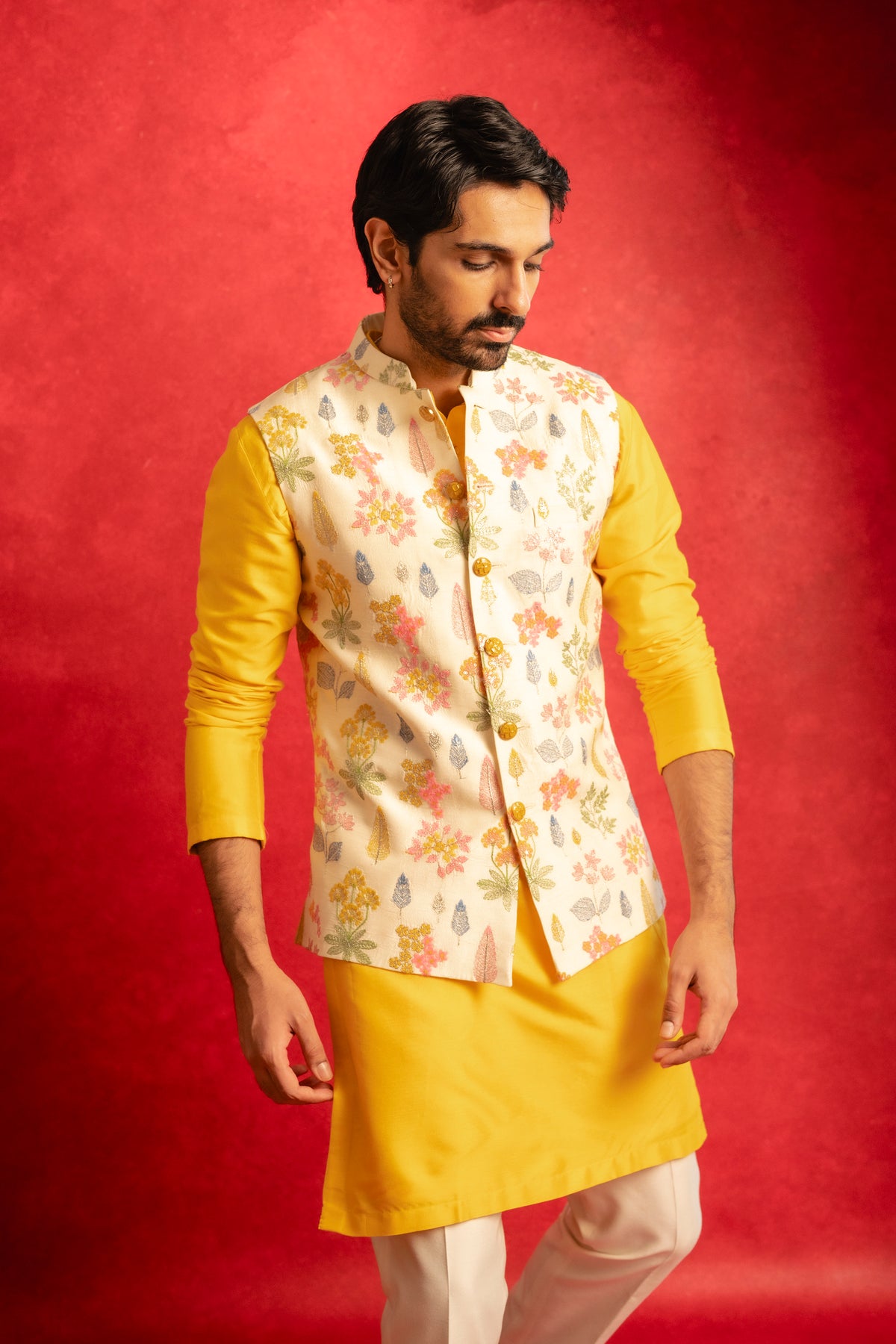 The Purav Kurta Set features a plain ivory silk kurta paired with matching pants, layered with a floral ivory vest detailed in delicate pastel blooms. Thoughtfully designed for comfort and understated elegance, this ensemble is ideal for weddings, daytime festivities, and refined celebrations.