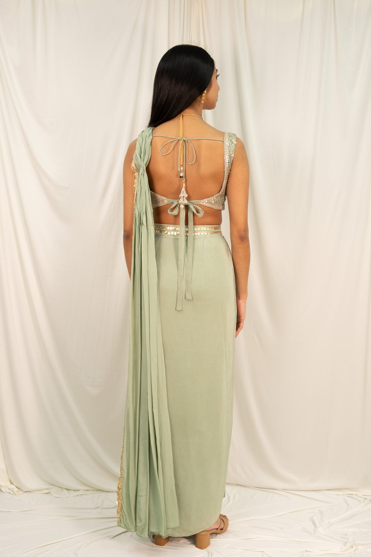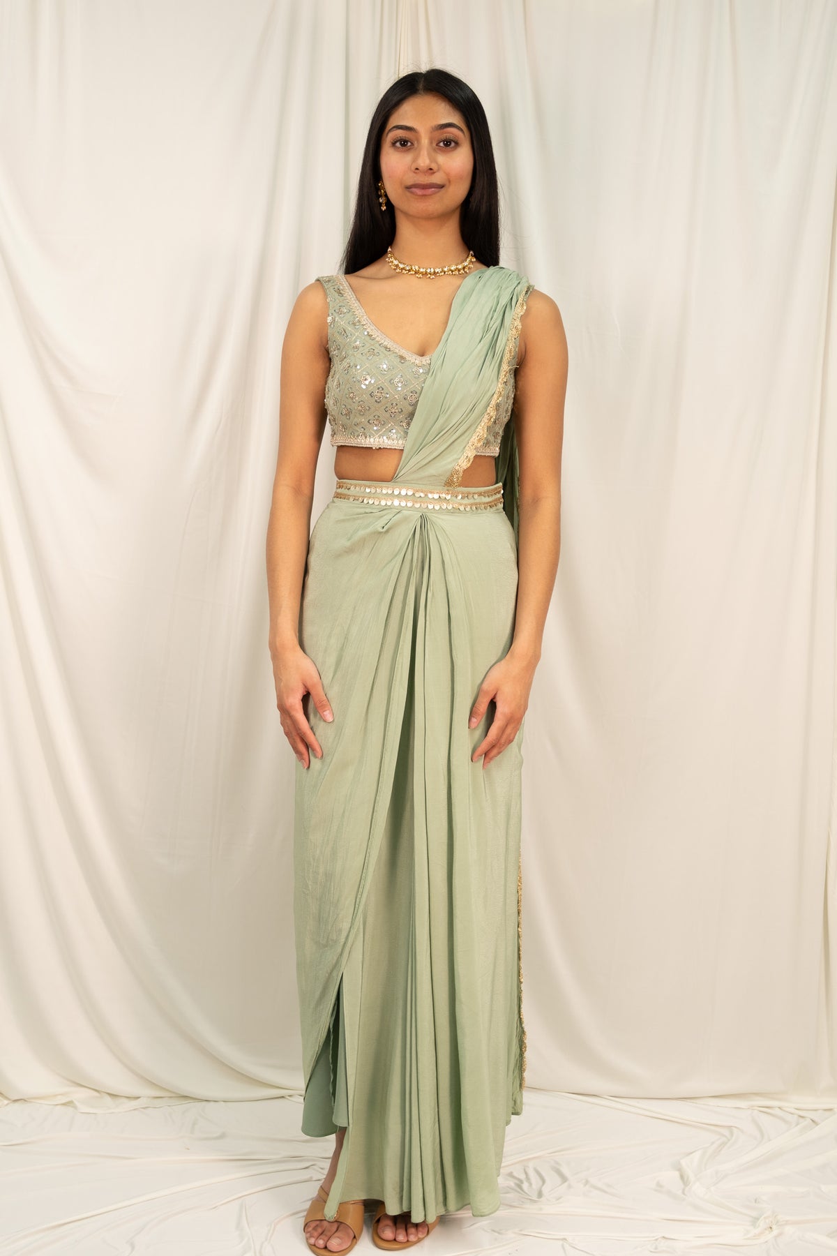 IFYKYK the best saris are the hassle-free saris. The pre-stitched sari is a closet essential for your summer weddings. This lightweight crepe fabric provides the sheen of satin but with a richer texture.