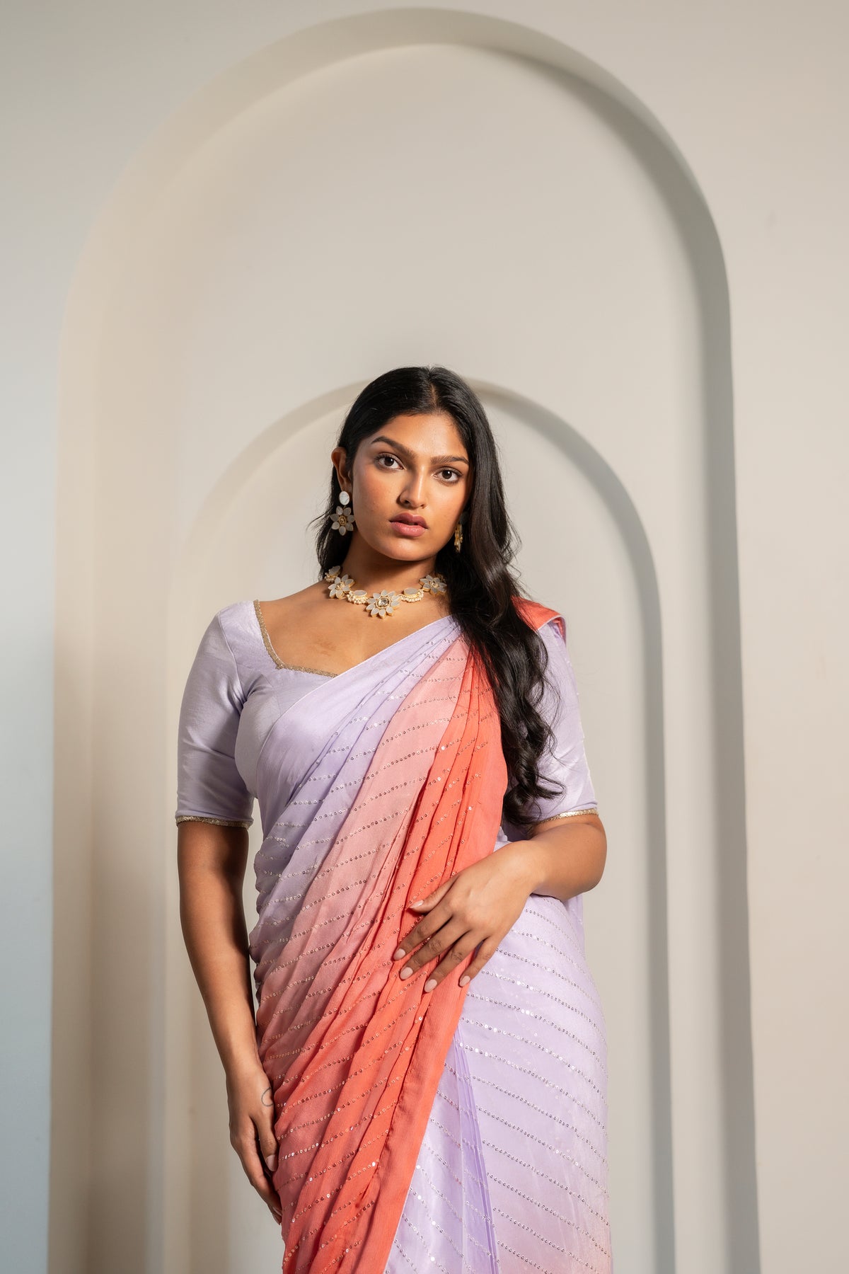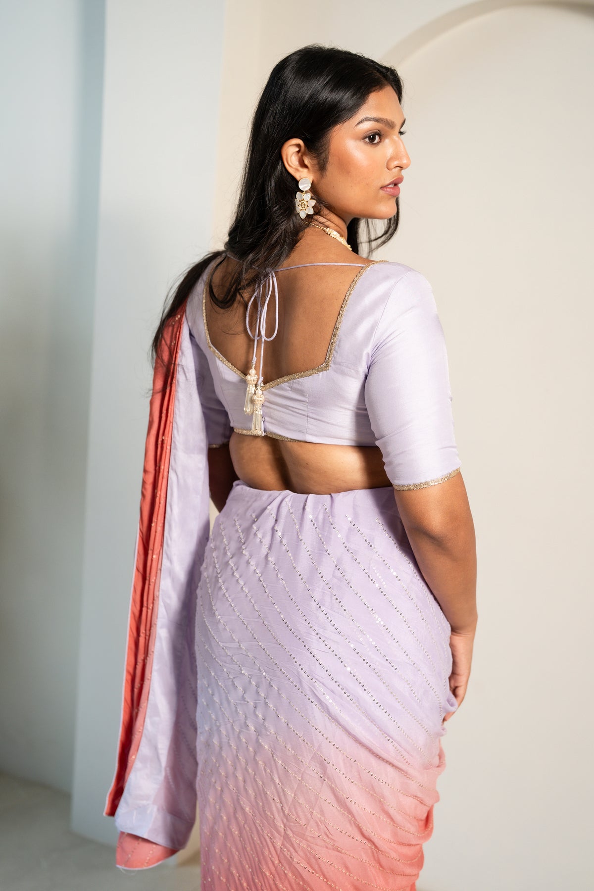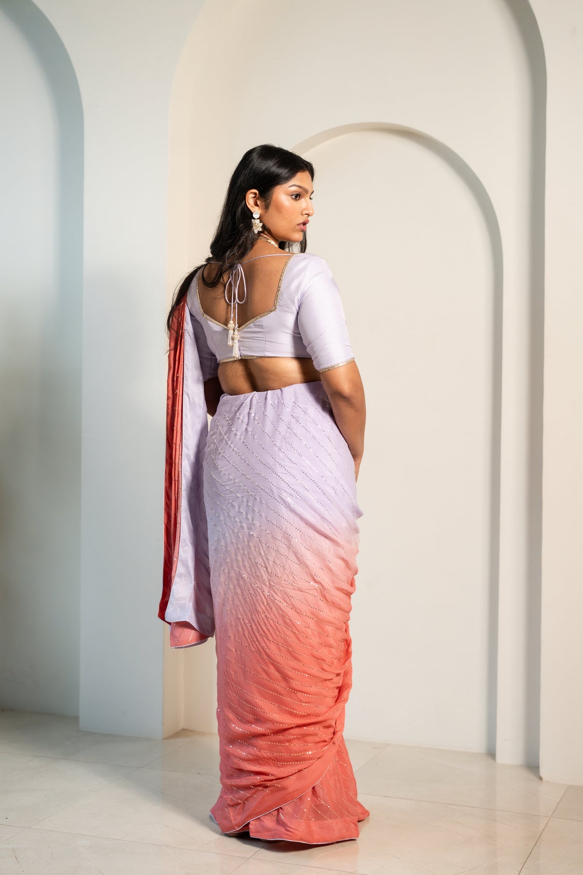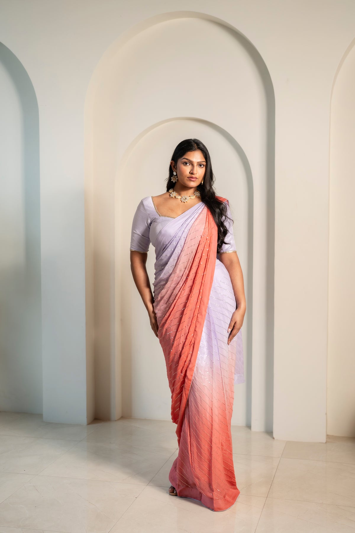 The Aam Saree features a soft ombré transition from delicate lilac to warm peach hues, adorned with all-over sequin embellishments for a subtle yet radiant shine. Designed to flow effortlessly, this saree is perfect for weddings, receptions, and evening celebrations.