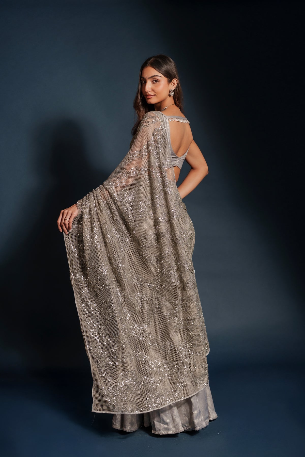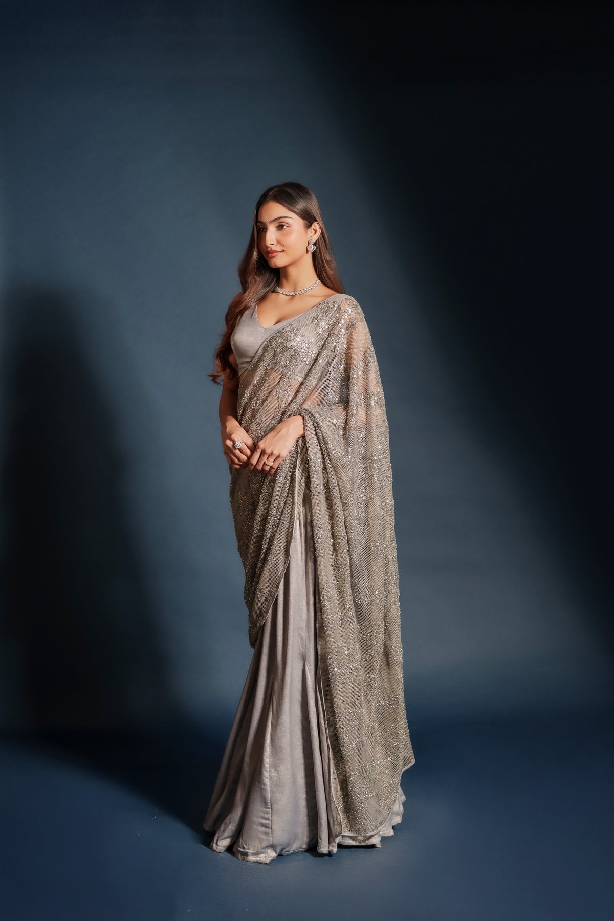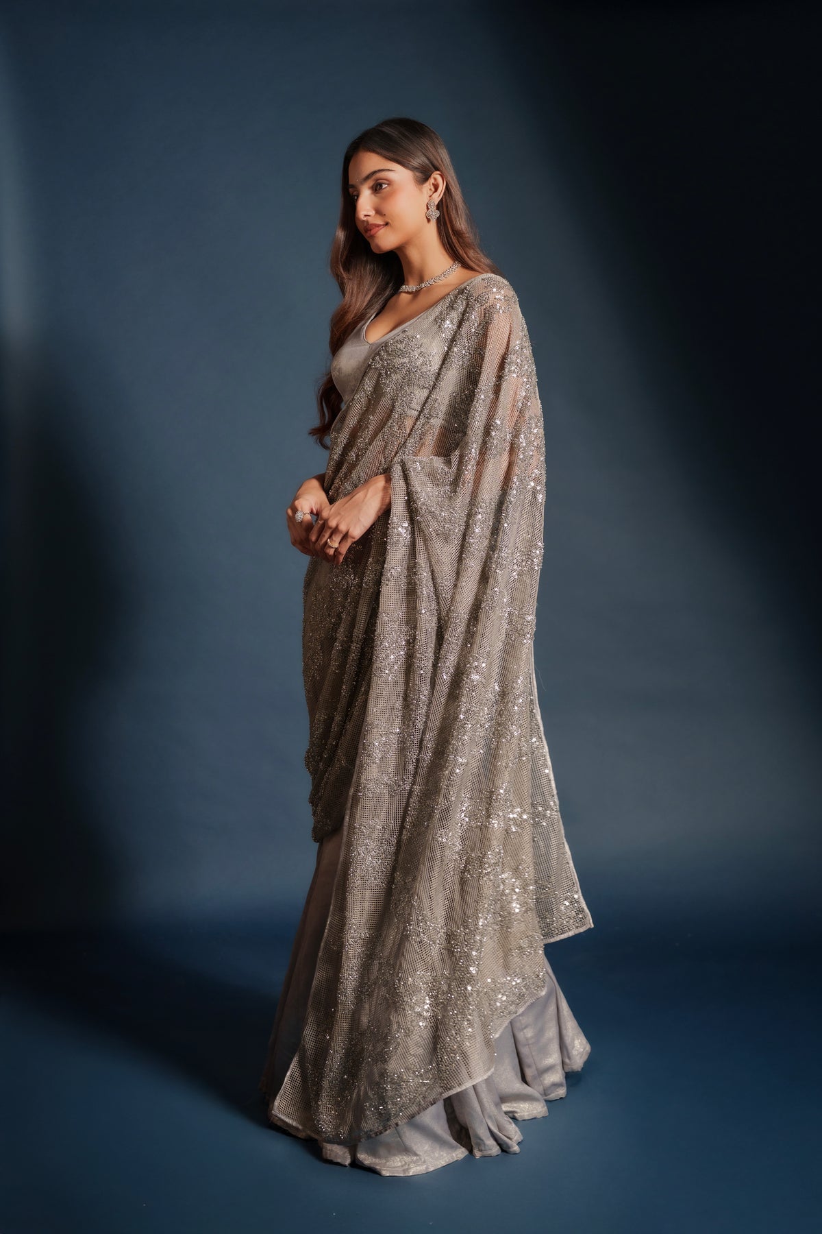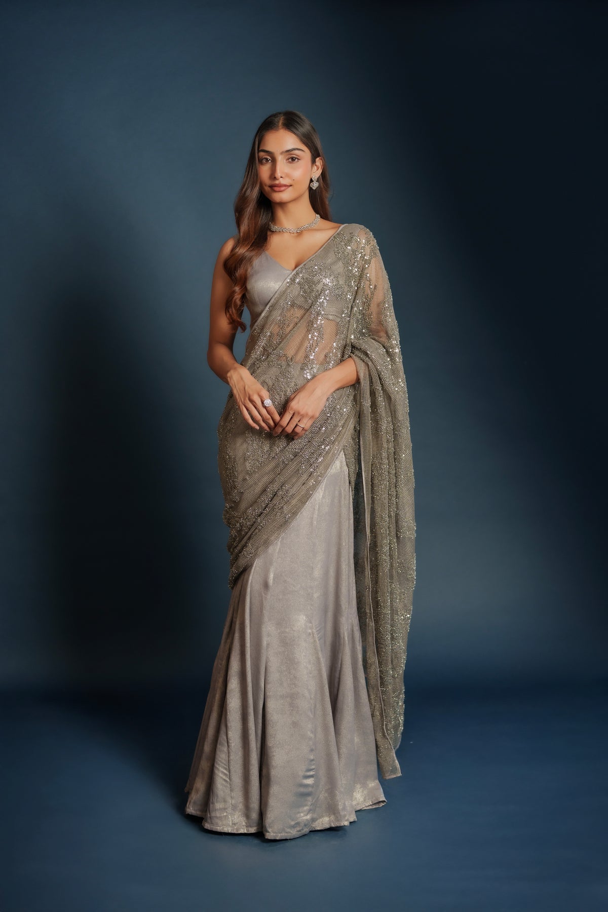 Tara lehenga sari hybrid crafted from imported suede silver tissue with intricate silver embroidery throughout. The draped silhouette blends the grace of a sari with the ease of a lehenga. Finished with a mesh net shawl adorned with delicate sequins for a soft luminous finish. Designed for evening celebrations, receptions, and wedding events.