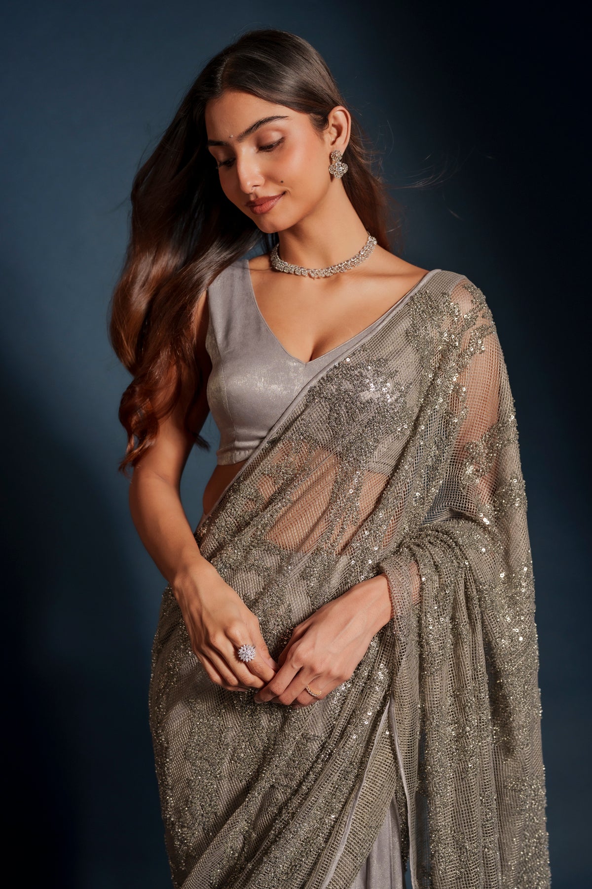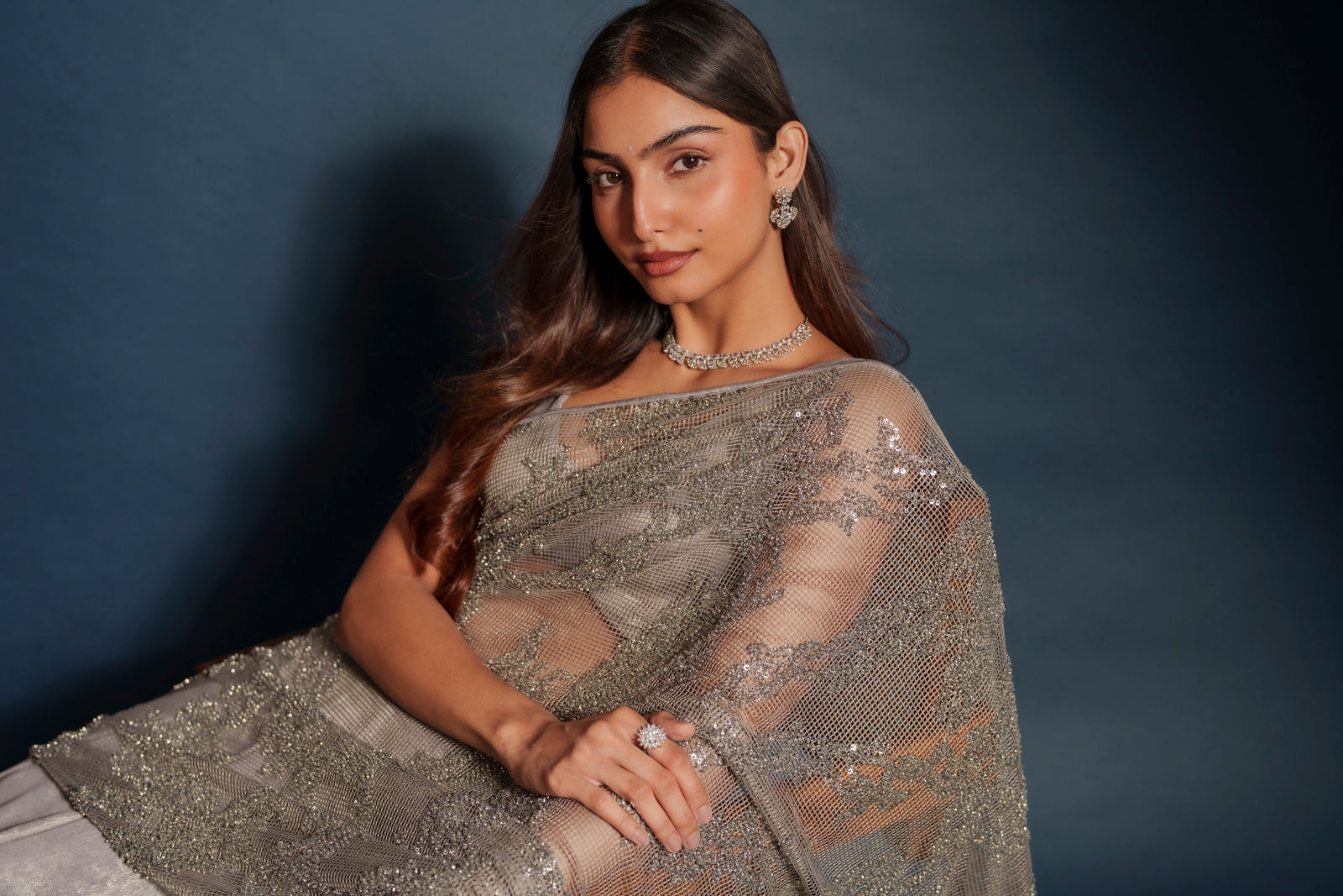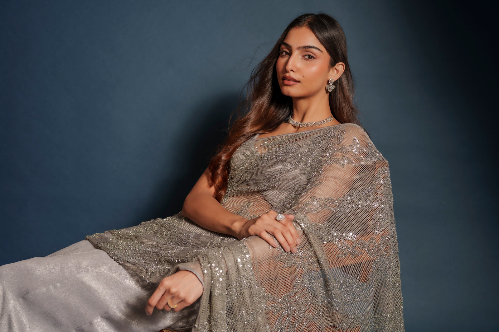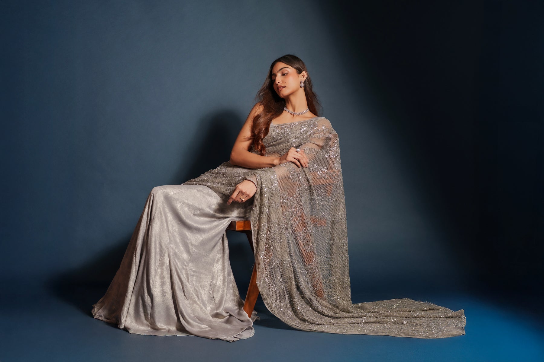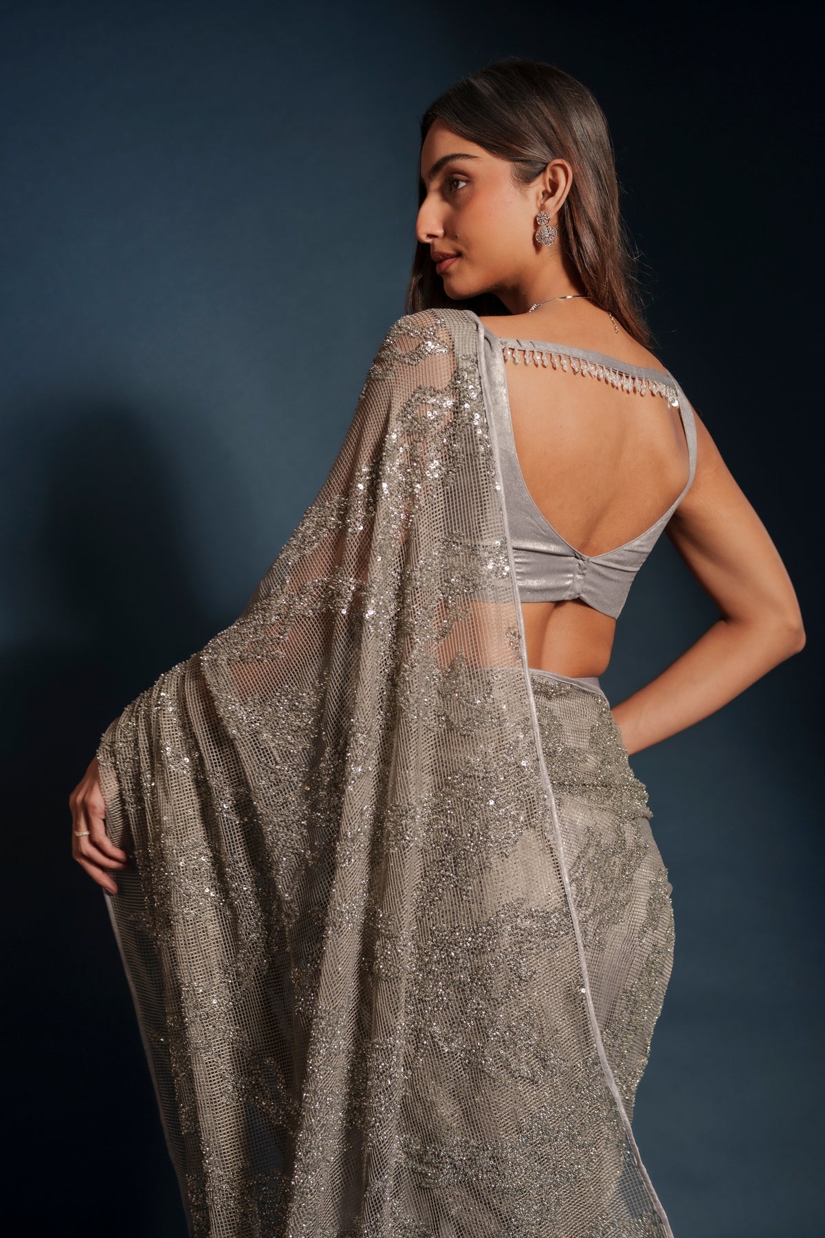 Tara lehenga sari hybrid crafted from imported suede silver tissue with intricate silver embroidery throughout. The draped silhouette blends the grace of a sari with the ease of a lehenga. Finished with a mesh net shawl adorned with delicate sequins for a soft luminous finish. Designed for evening celebrations, receptions, and wedding events.